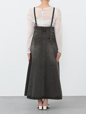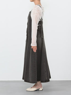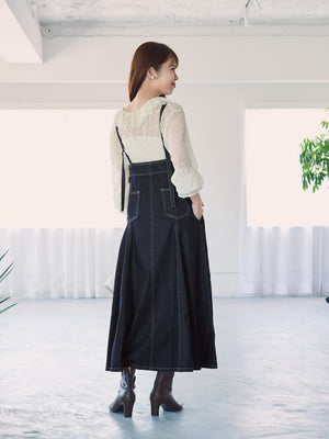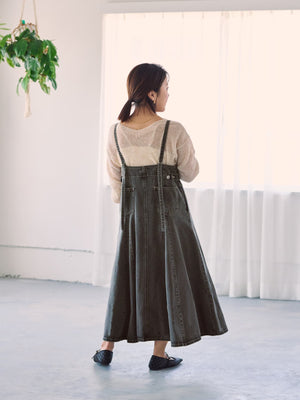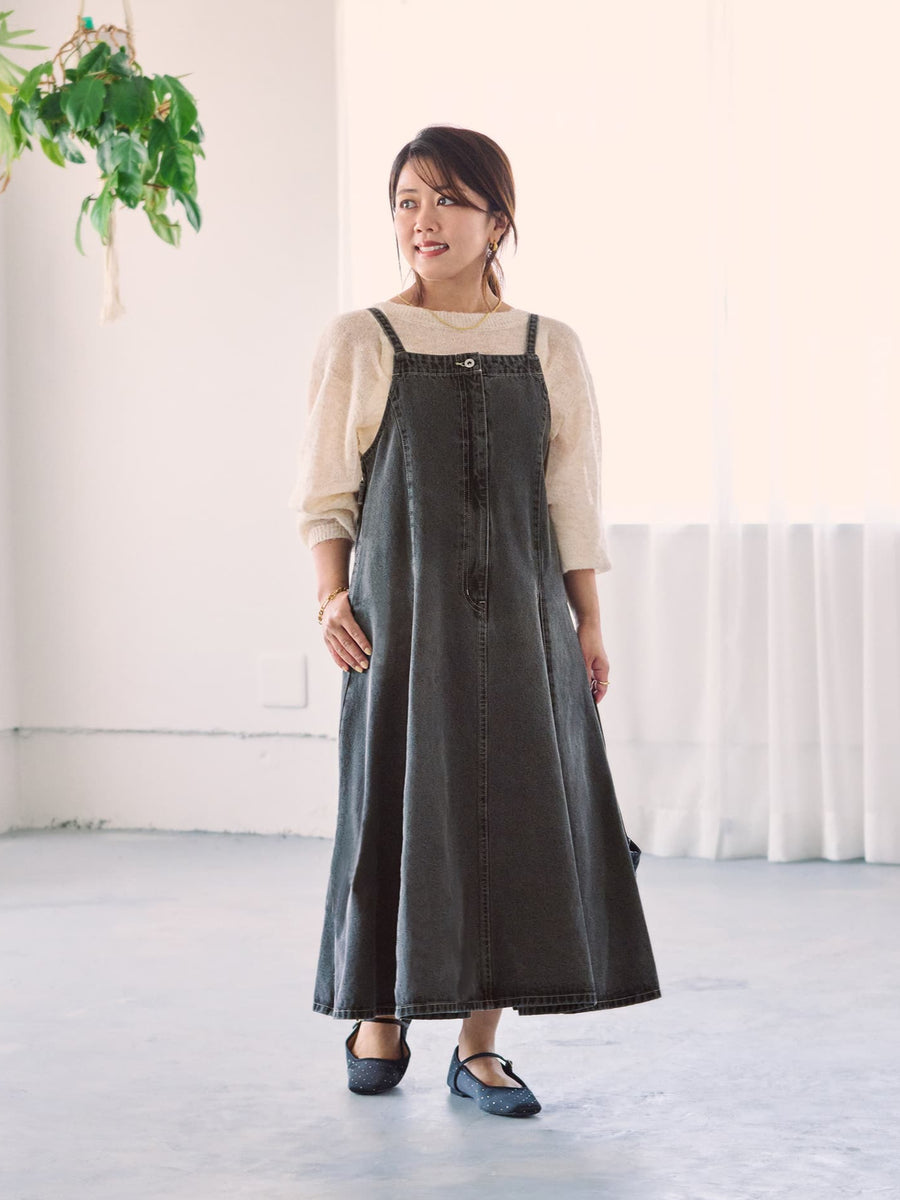 たっぷりとしたフレアが歩くたびに上品な印象を与えてくれるデニムのジャンパースカート。縦の切り替えですっきりとスタイルアップ効果もありながら、1枚で着映えするアイテム。