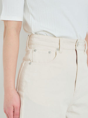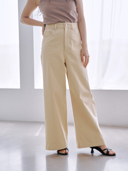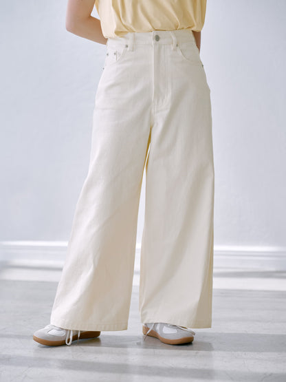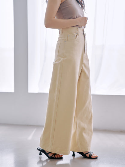 スタイルアップして見えるハイウエストや、脚長効果抜群のフレアワイドシルエットはそのままに。柔らかいニュアンスカラー展開は、いつものデニムコーデを新鮮な印象に仕上げてくれます。