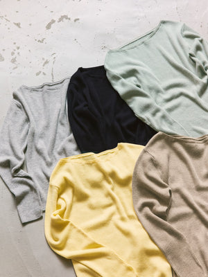 滑らかな肌触りと、保温性にも優れたシルクウール混の糸を使用。定番のライトベージュ、グレー、ネイビーと綺麗見えするミントやイエローを差し色に加えた5色展開。ご自宅での洗濯機洗いが可能です。