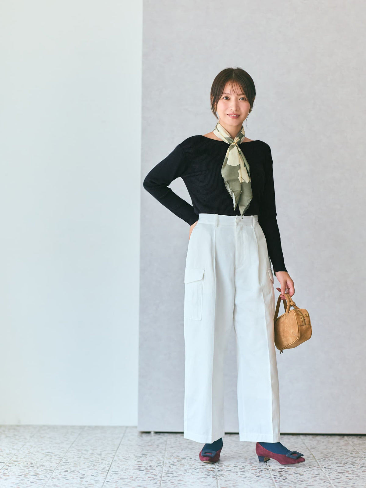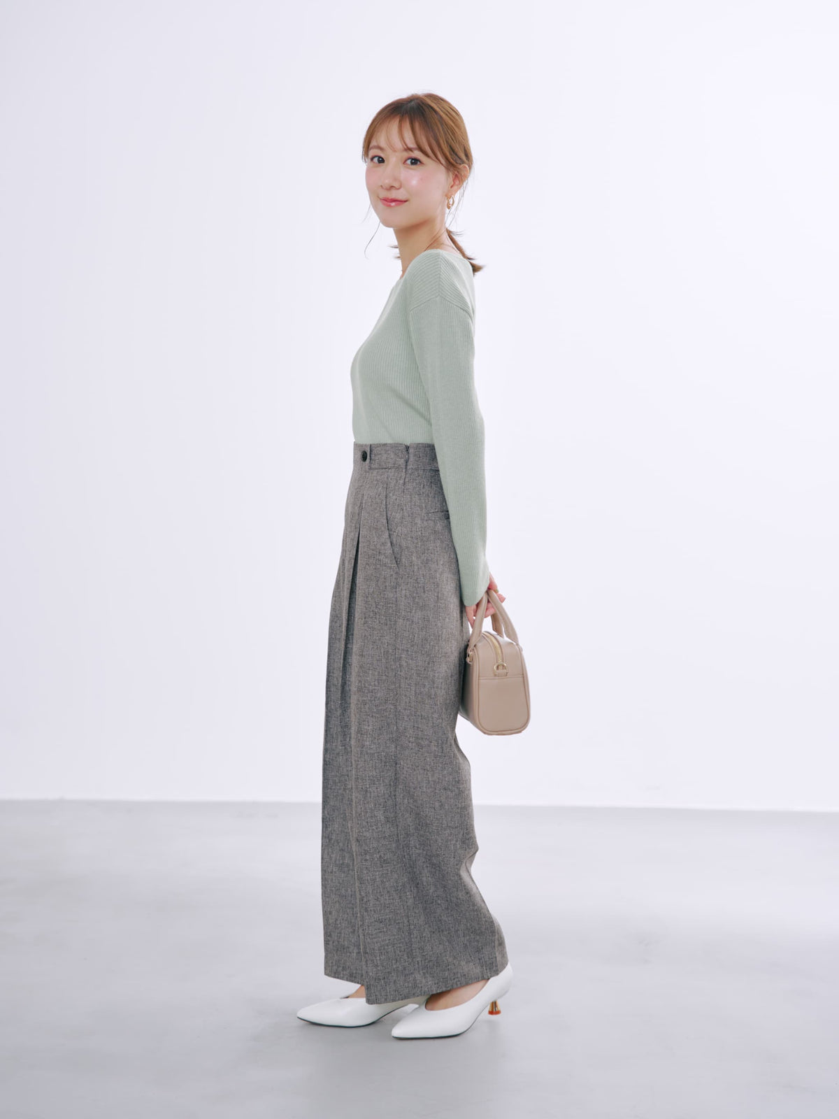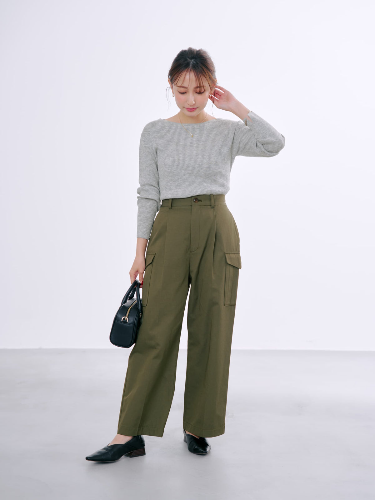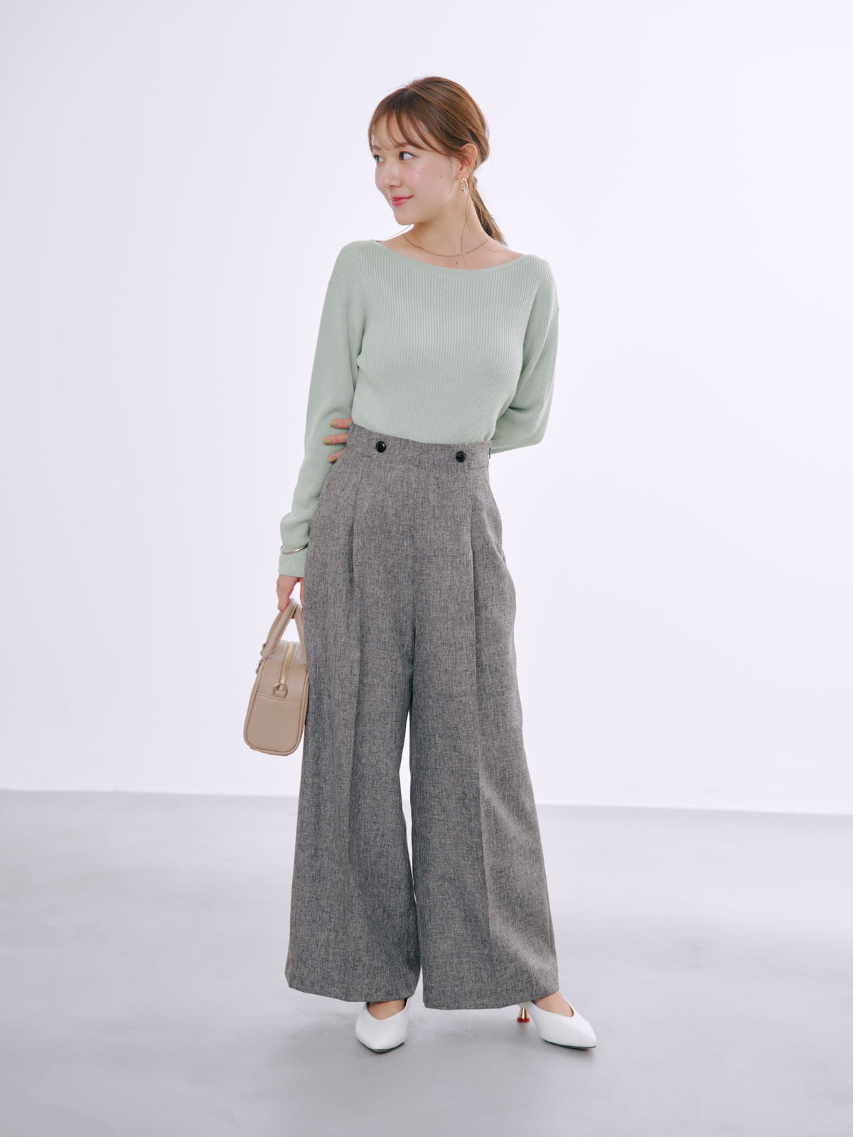 鎖骨が綺麗に見えるボートネックで女性らしさをプラス。袖口のスリットもさりげなくポイントになっています。