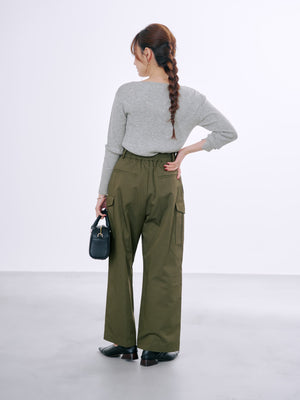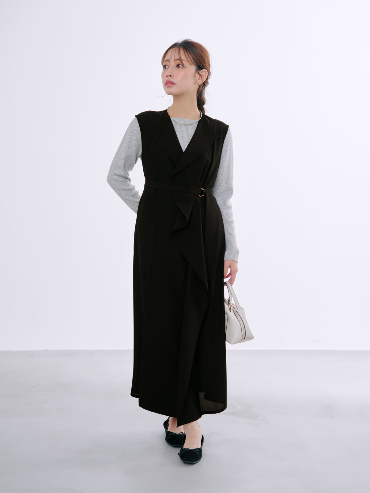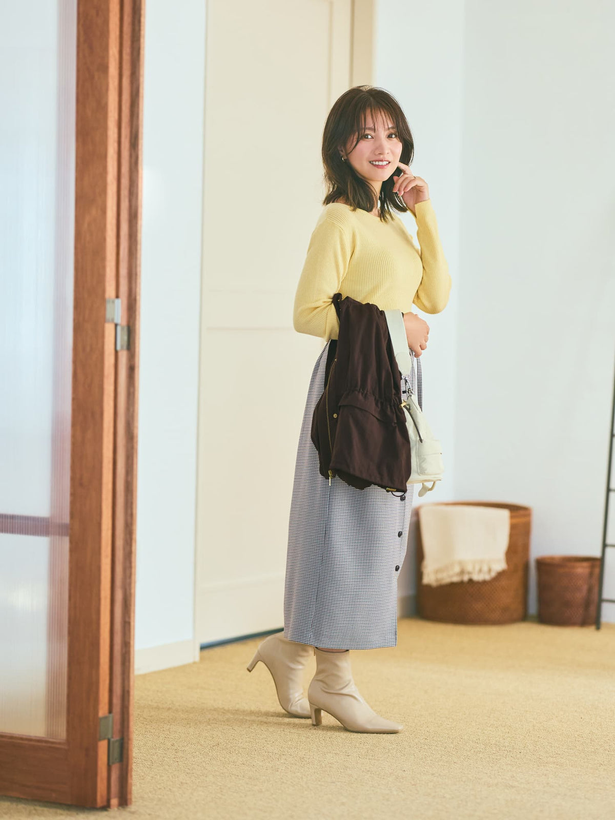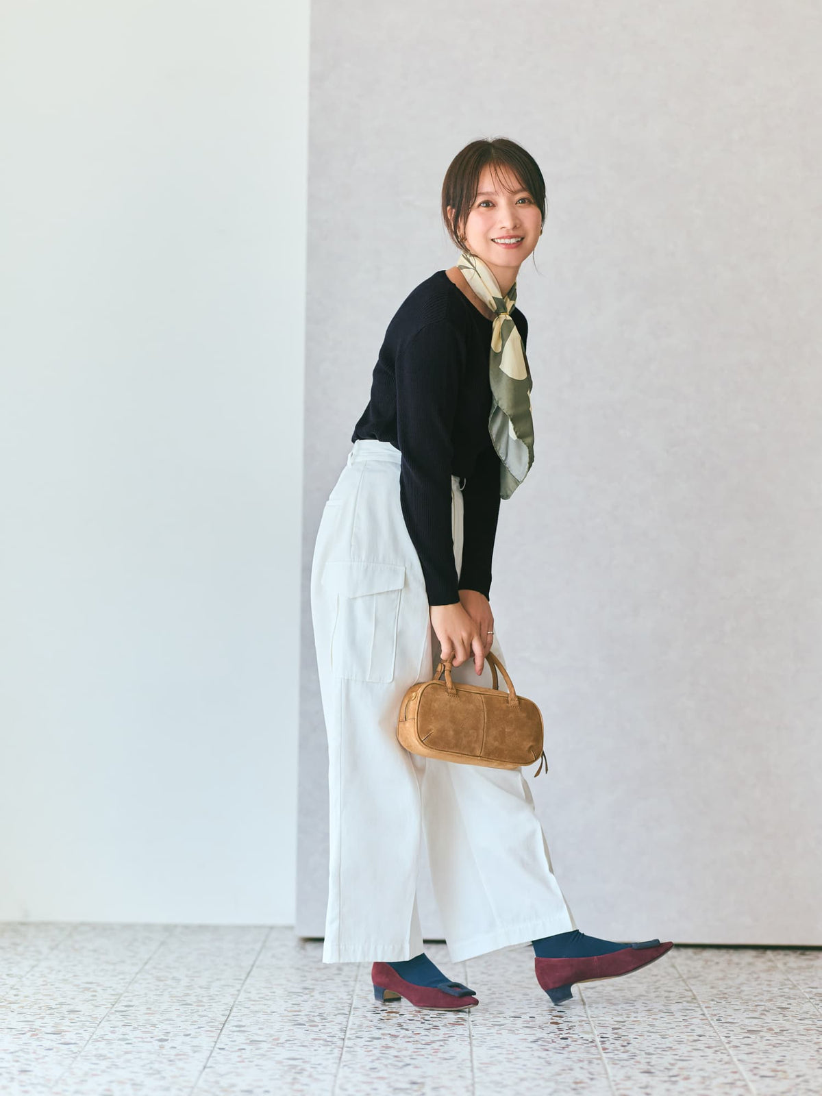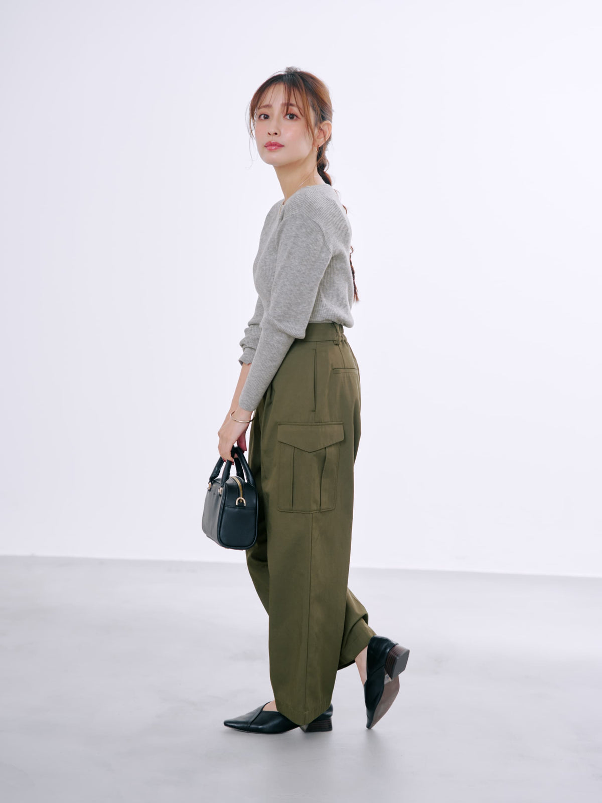 鎖骨が綺麗に見えるボートネックで女性らしさをプラス。袖口のスリットもさりげなくポイントになっています。