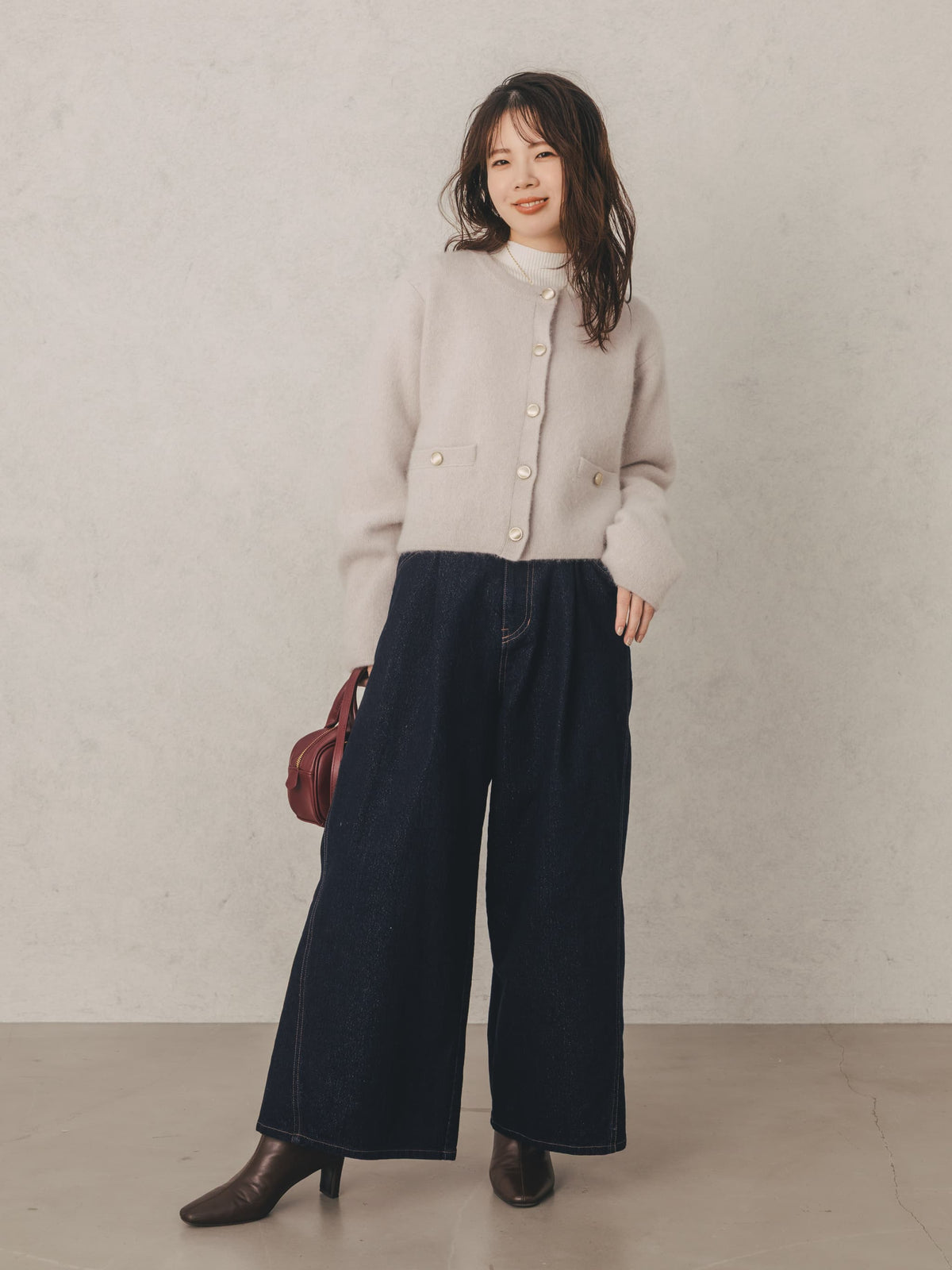 デニムコーデにきちんと感のあるニットジャケットを合わせて、今年らしい洗練された雰囲気に。