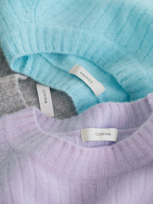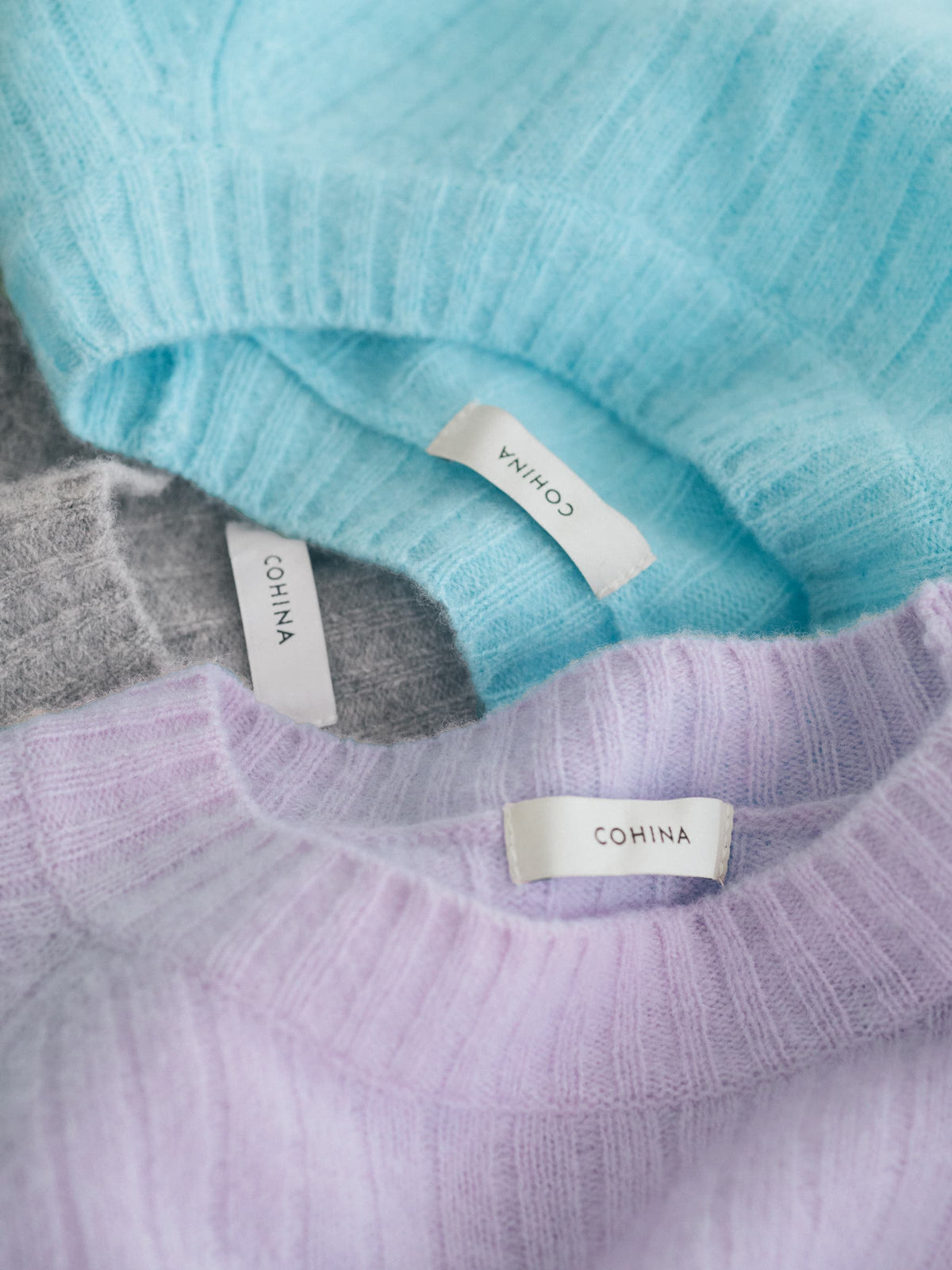 ・繊細な素材を使用しているため、カバンなどの摩擦により毛羽立ちやピリング(毛玉)などが発生する場合があります。ピリングができましたら引っ張って取ろうとせず、ブラッシングするか、小さなハサミで一つ一つ取り除いて下さい。