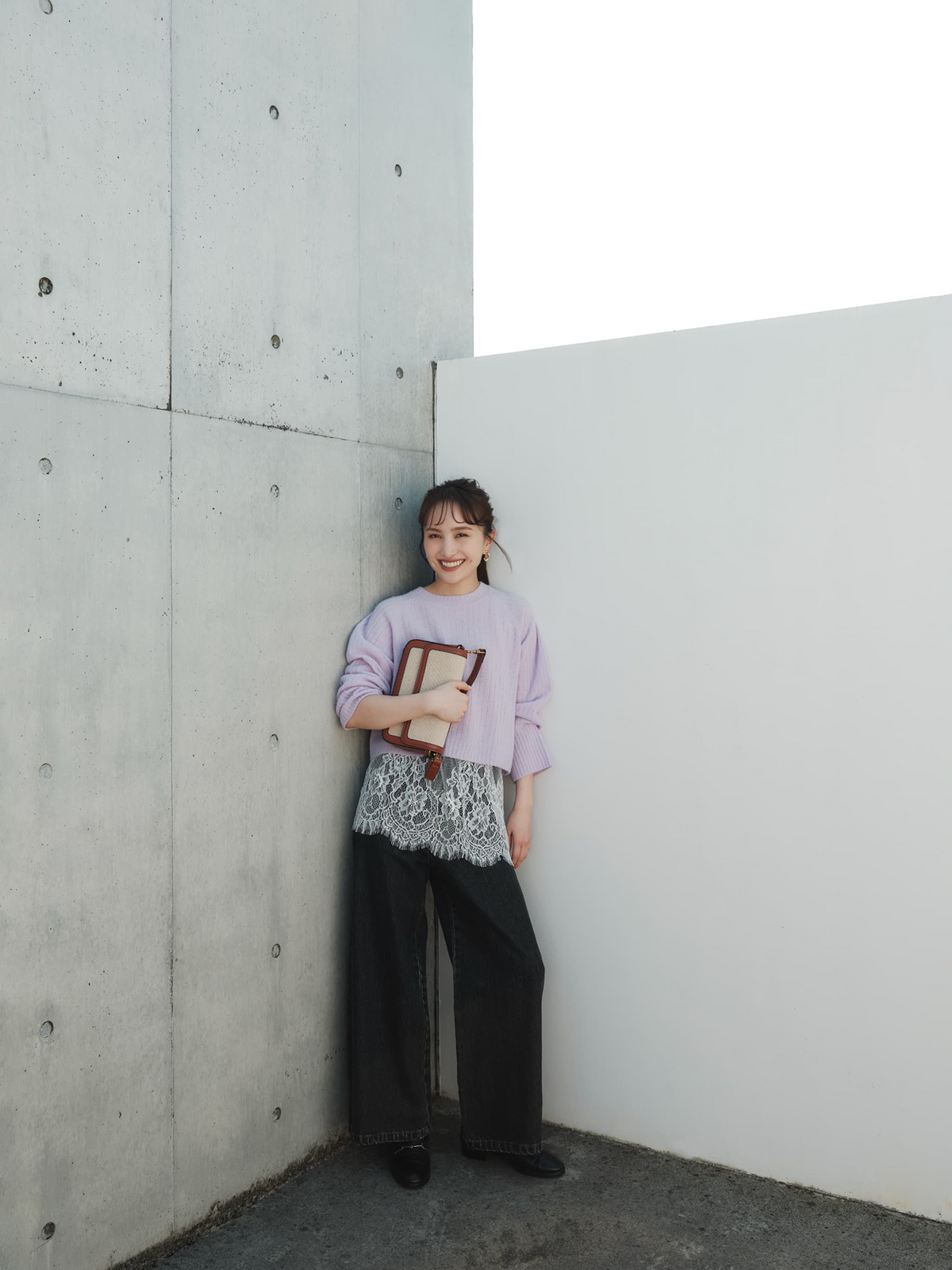 ワイド目なリブのニットなので、身体のラインを拾いすぎることなく、程よいゆとり感もありながらもスッキリと見せてくれます!