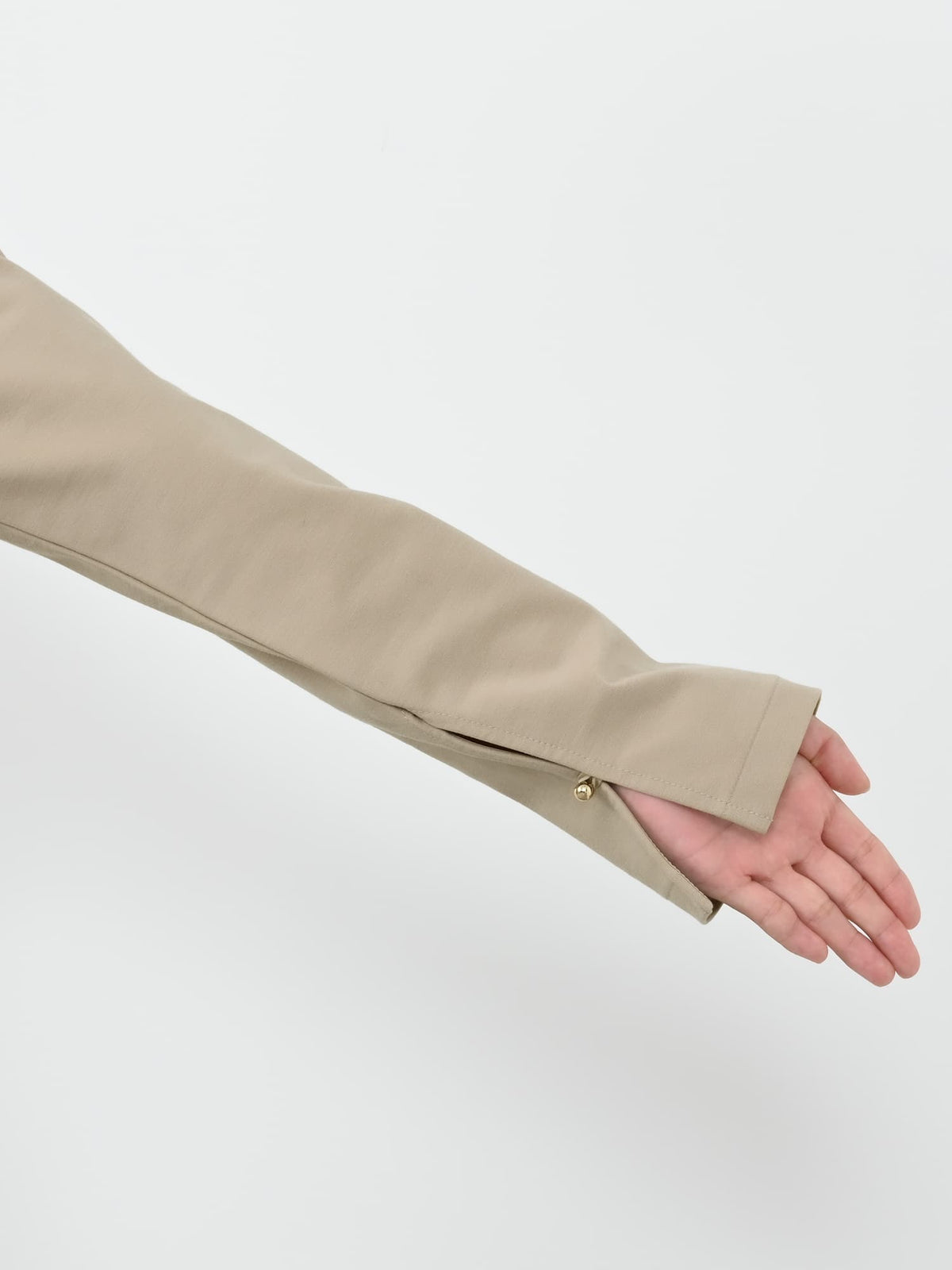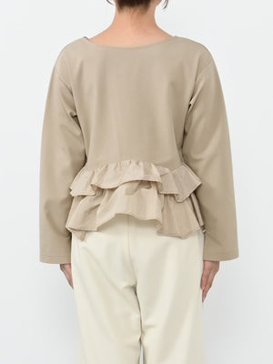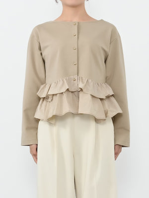 裾のペプラム部分は軽やかな異素材を使用し、動きのあるデザインは重たくなりすぎず華やかさと軽やかさをプラスしてくれます。袖下のスリット開きで更に抜け感のある着こなしに。インナーとのレイヤードも楽しめます。