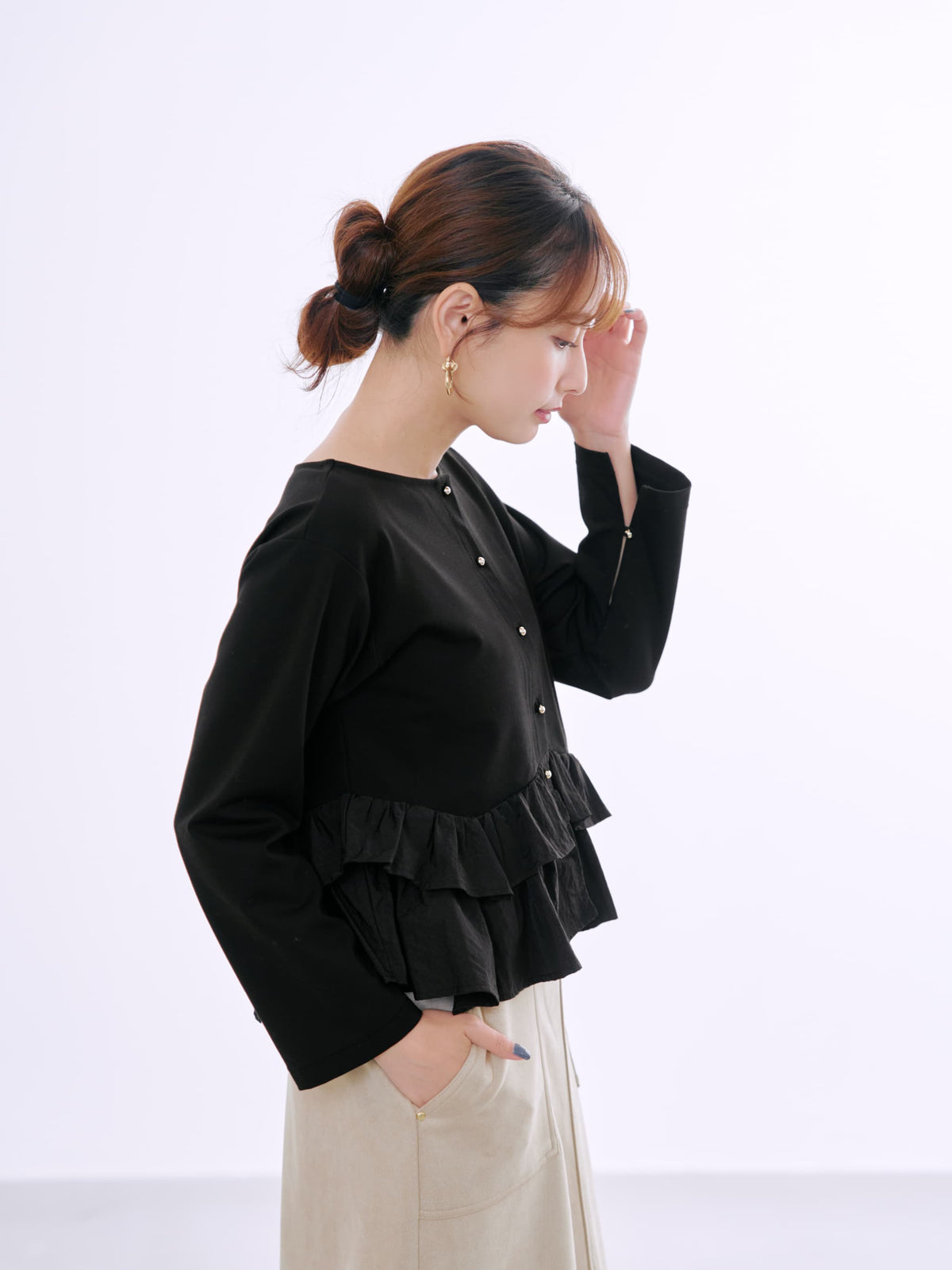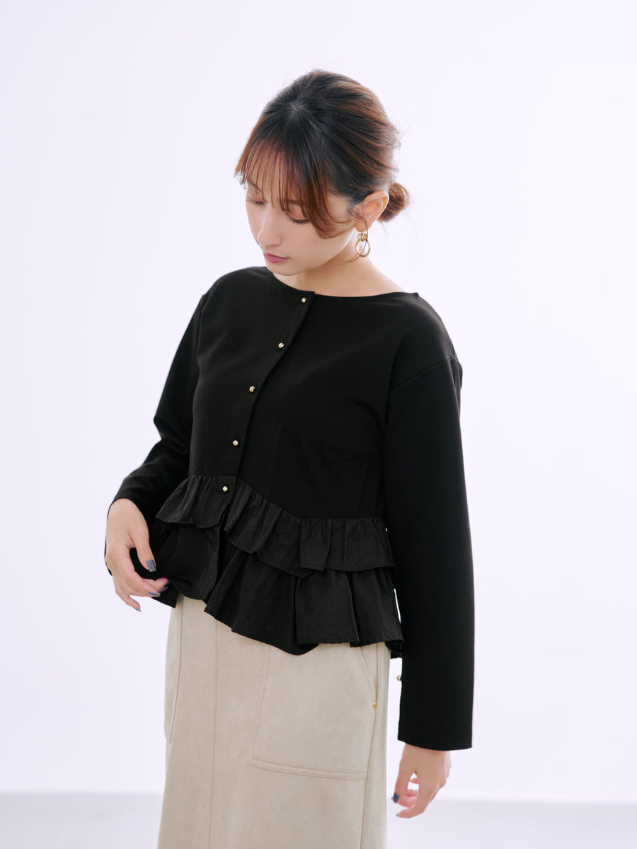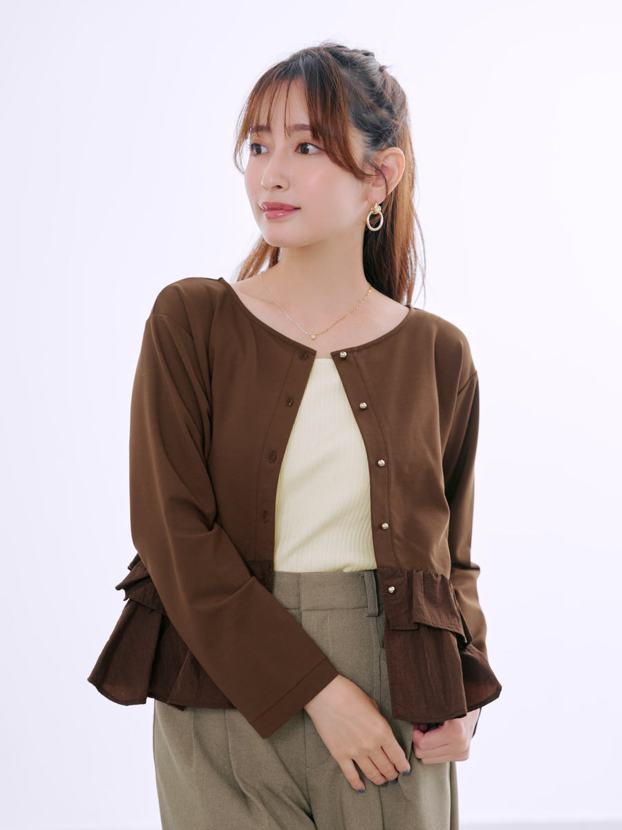 ランダムに流れるペプラムデザインが着映えしてくれる、トップスとしてもカーディガンとしても使える着回し力のあるアイテム。
