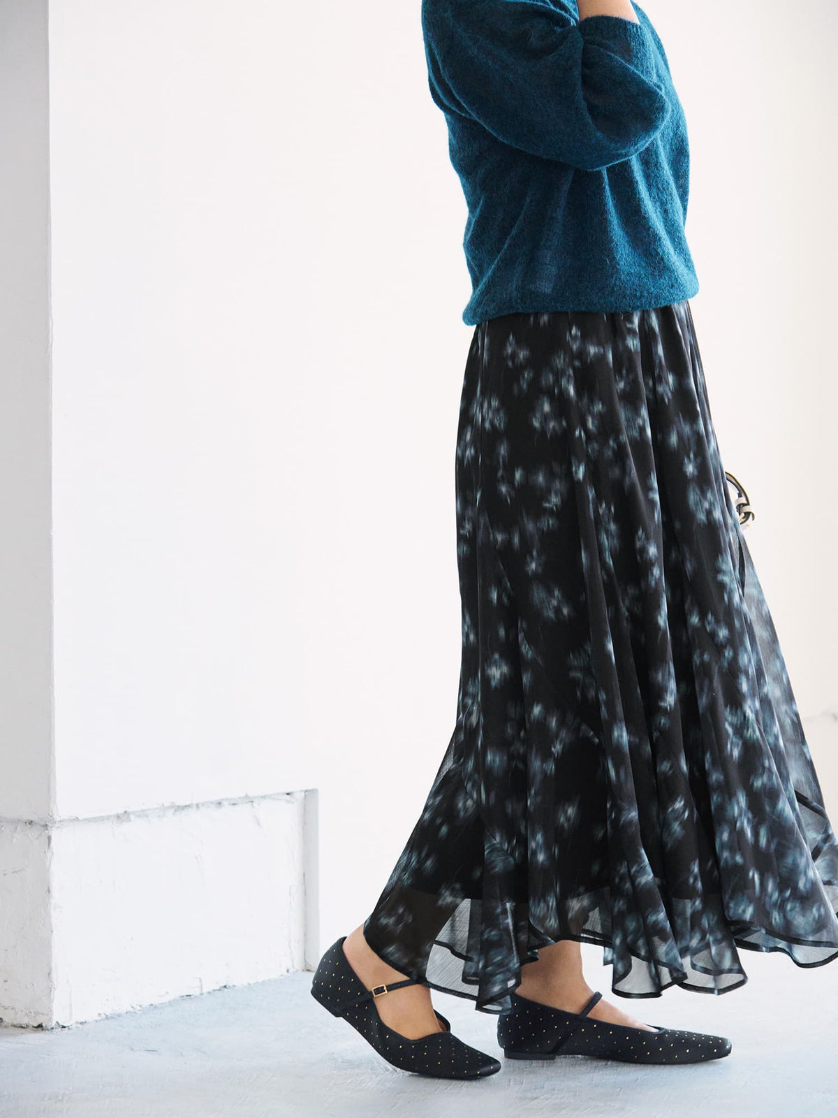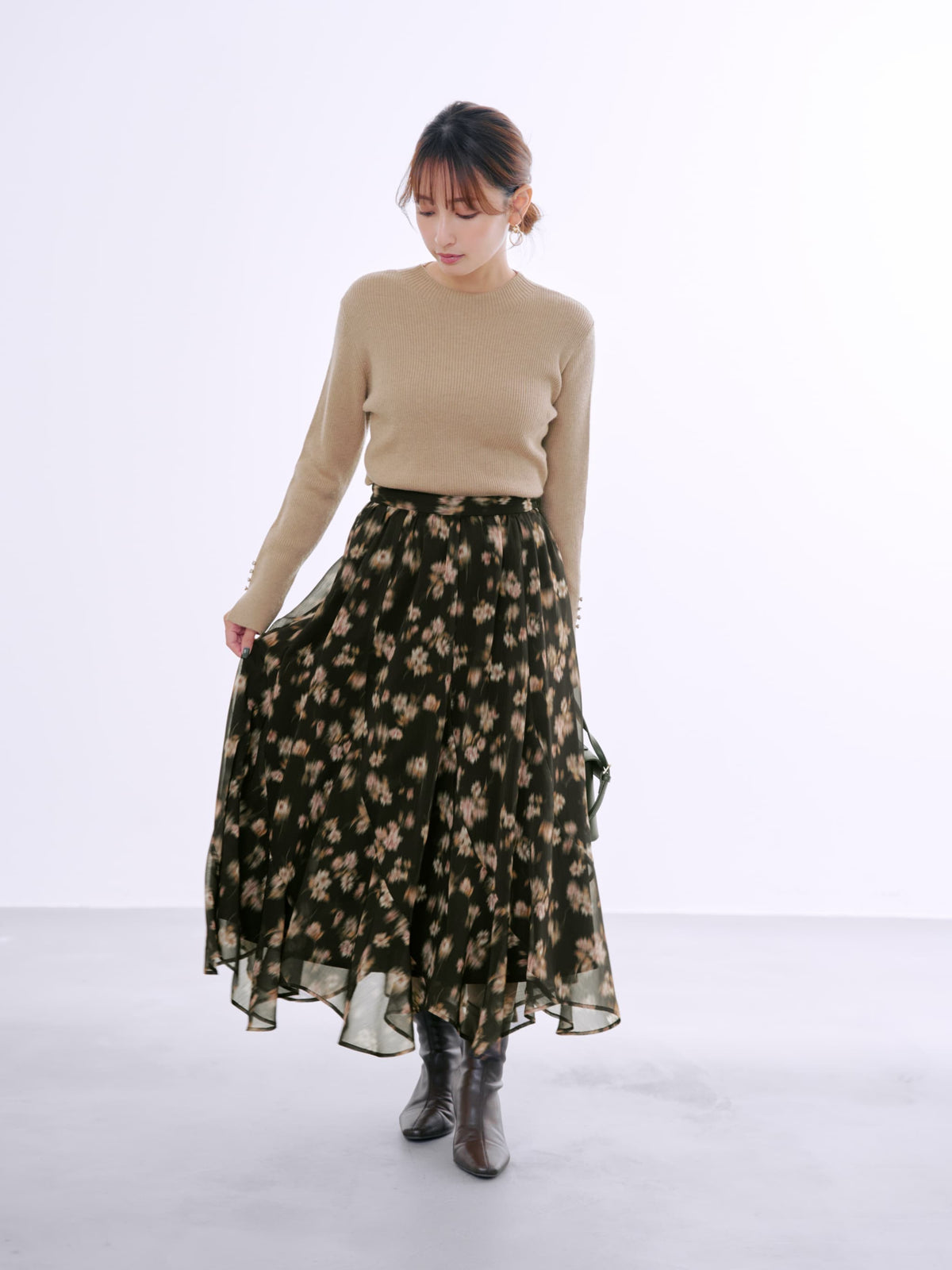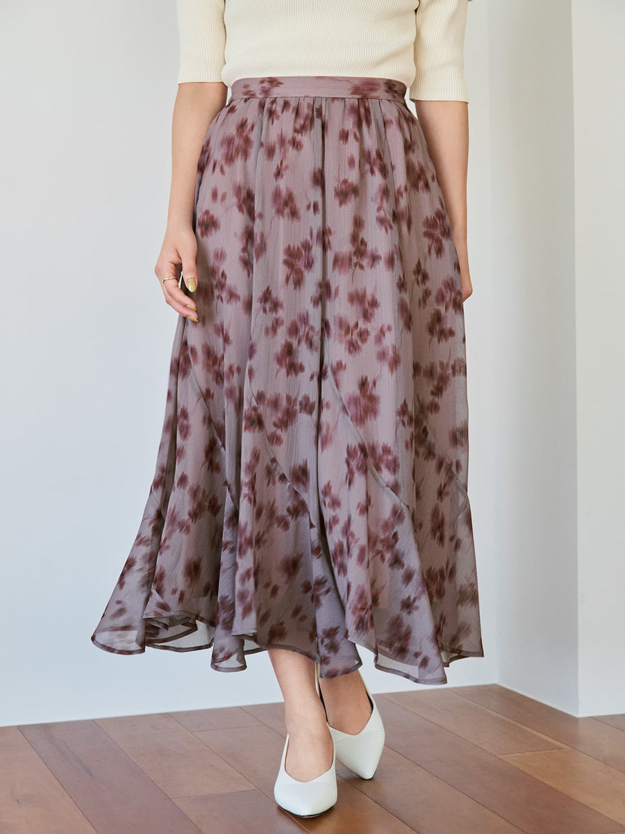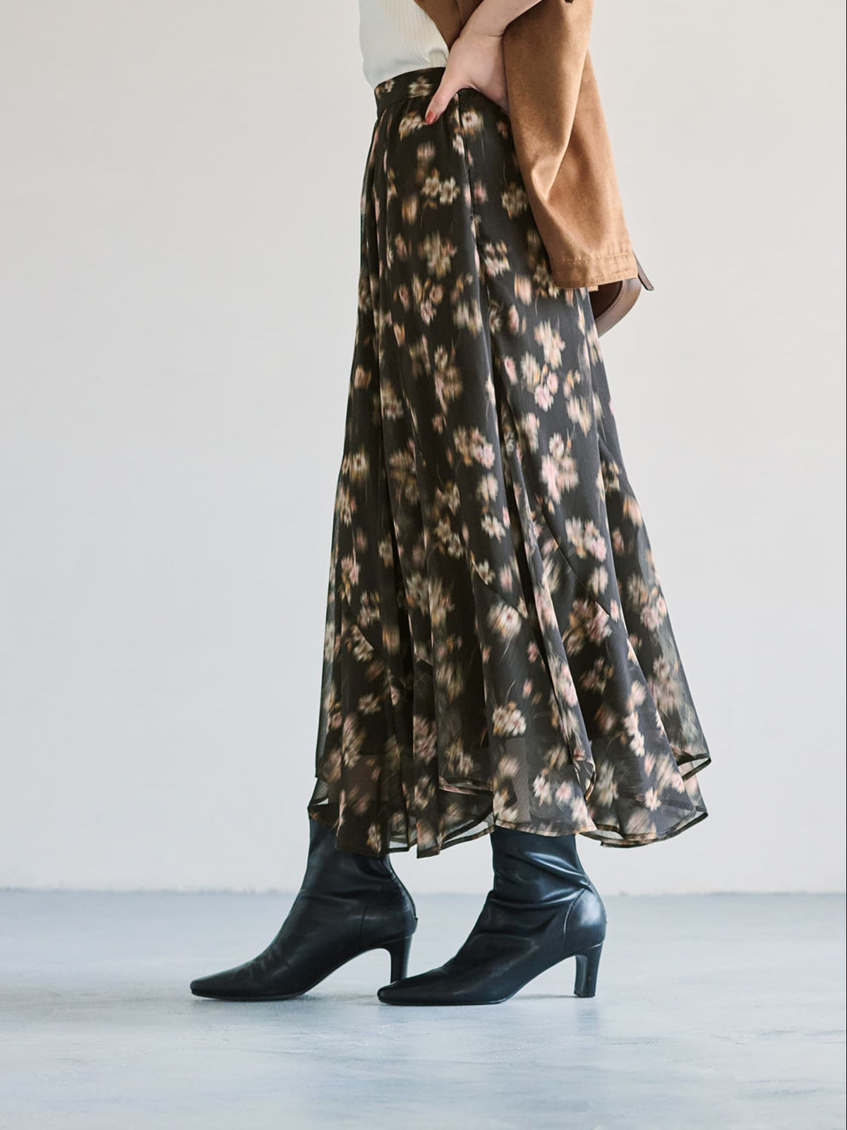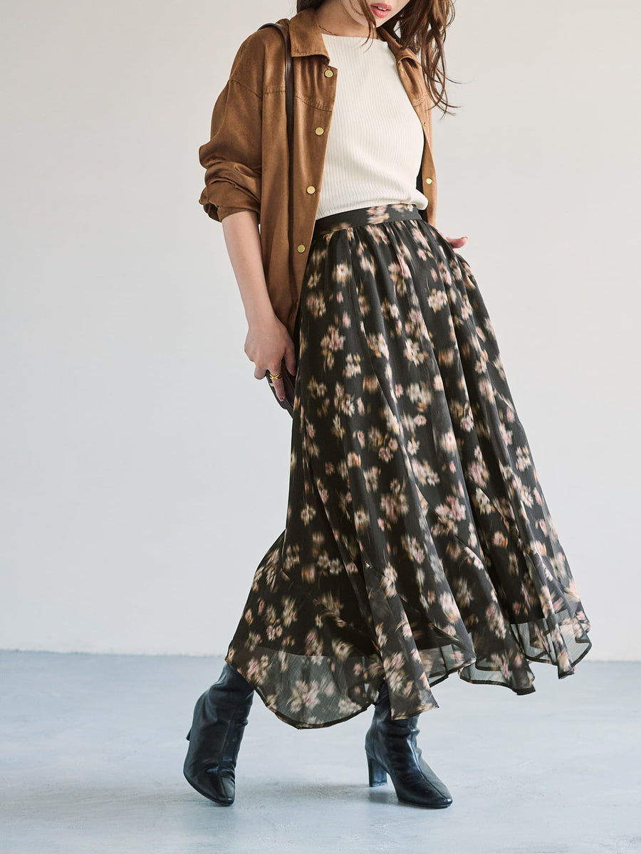 COHINAオリジナルシェードフラワープリントスカート。柔らかなタッチで溶け込むようなフラワーが印象的な柄にしてみました。