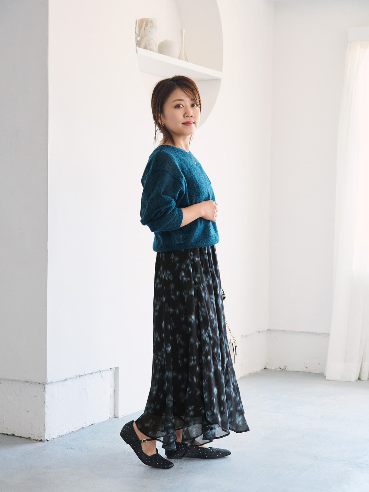 軽い着心地で、まだまだ暑い9月から着れました!ブラウン狙いが即完売したのでネイビーを購入しましたが、上品な色合いで品がありビジネス用にも活躍しています。ブルー系なので白いトップスと合わせると夏も爽やかにも着れます。花柄は甘すぎないか心配でここ数年買っていませんでしたが、こちらはぼかしているので甘すぎなくてよかったです!同じ素材のワンピースも欲しくなりました。