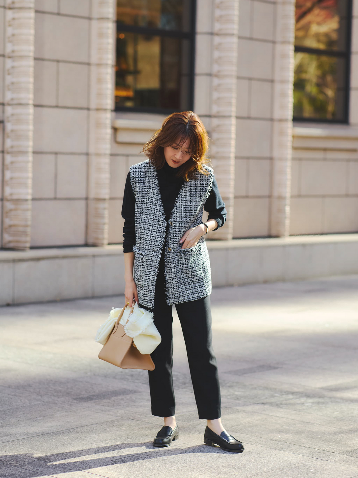ブラックはマニッシュなパンツ合わせ、デニムでカジュアルとの掛け算コーデもおすすめです。