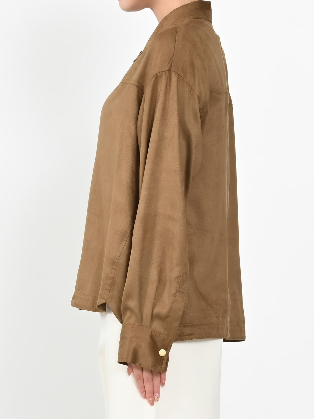 スウェードライクのお素材は上品な風合いで秋コーデを格上げしてくれるアイテム。ジョーゼットシャツとデザインは同じですが、こちらの方が落ち感がある印象で、アレンジもしやすいのがポイント。