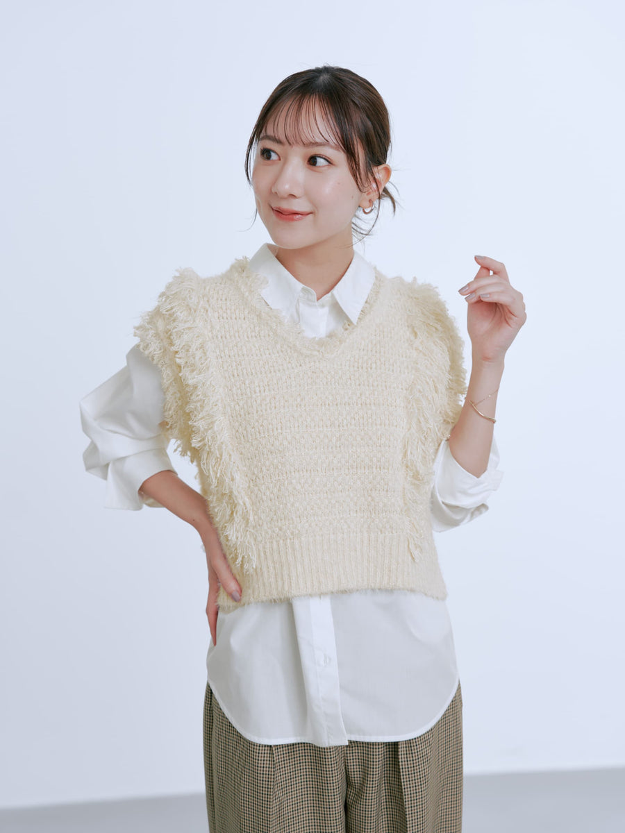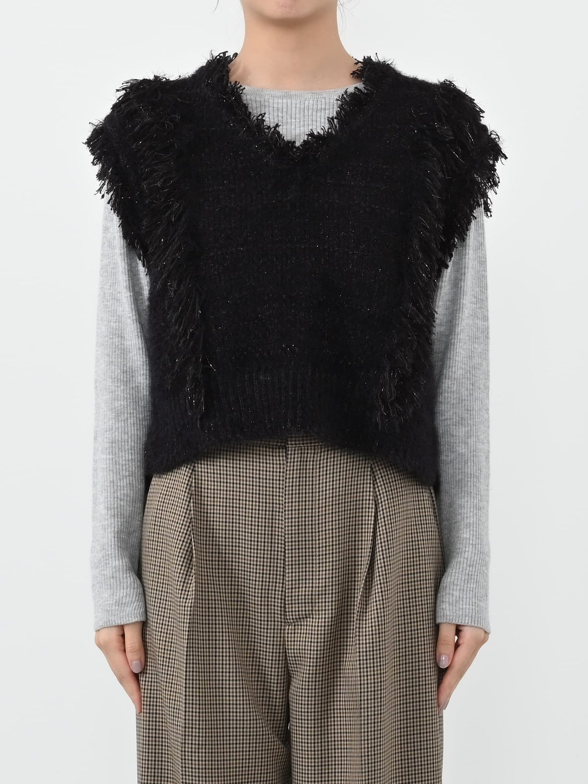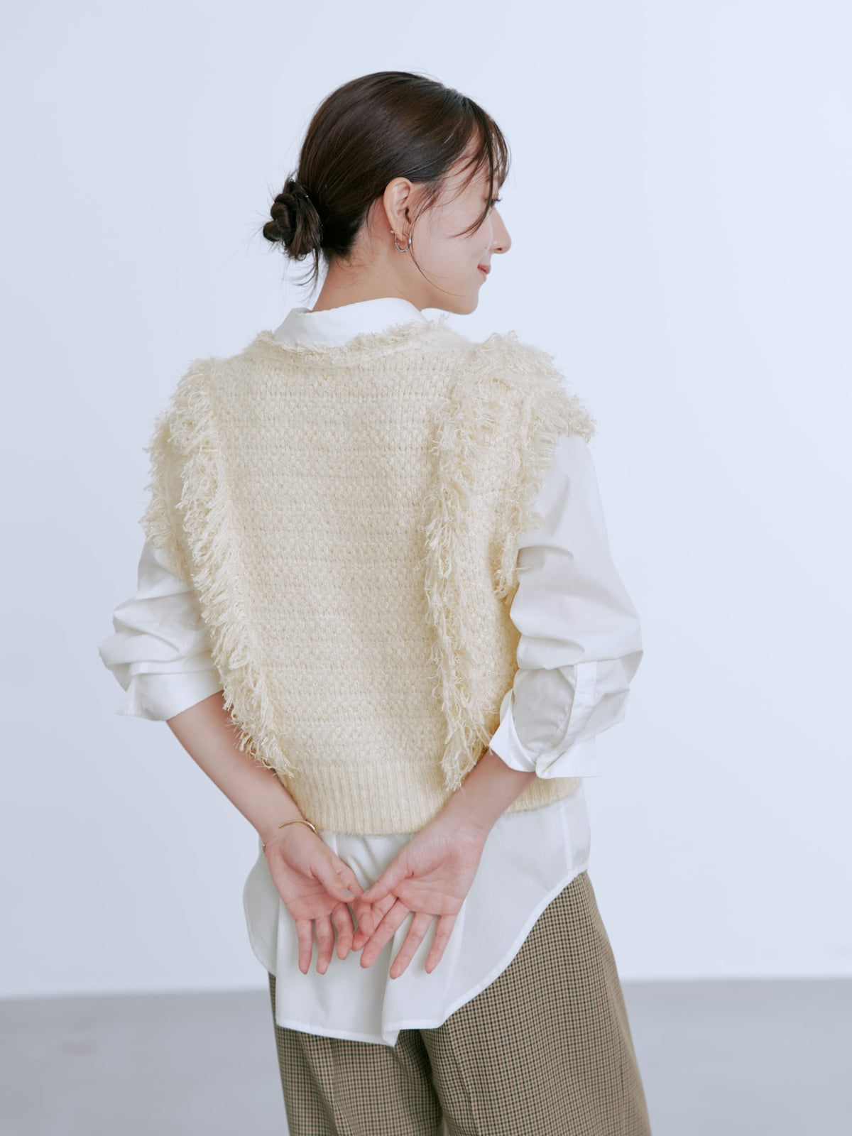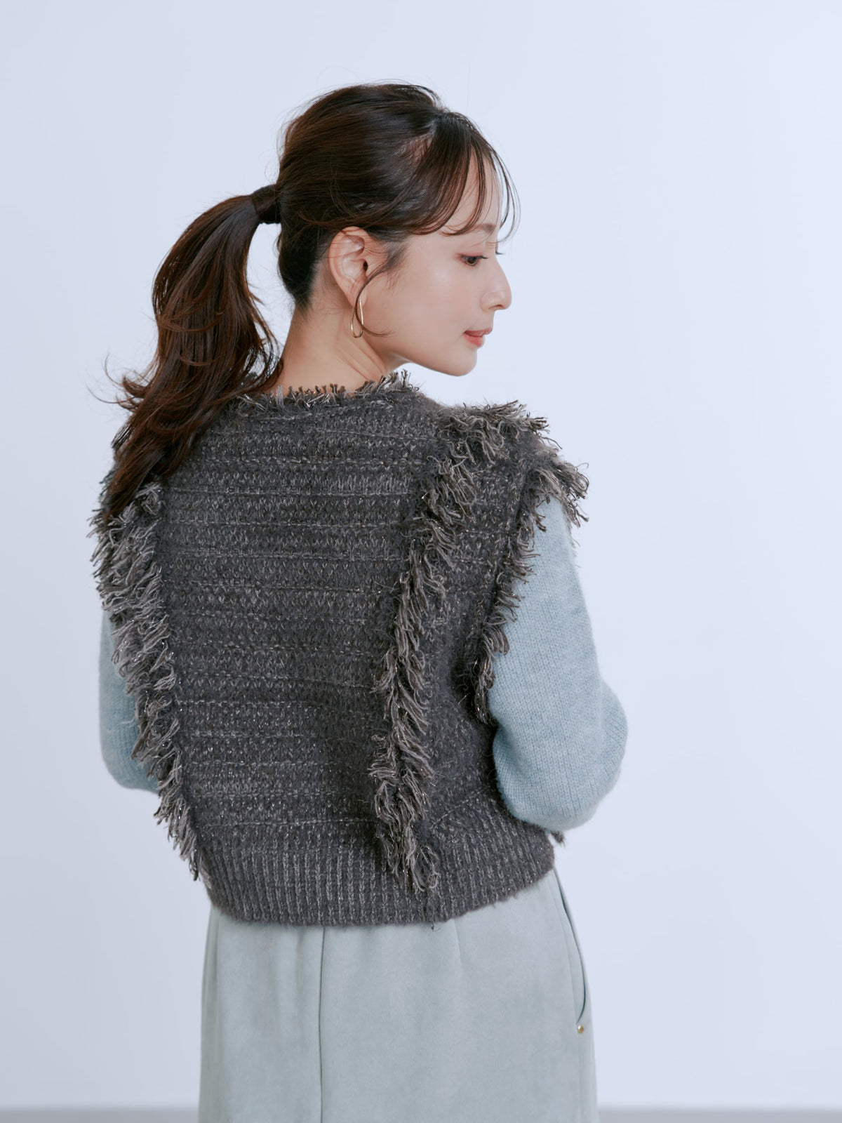 さりげないラメ糸の煌めきとフリンジの表情が魅力的なニットベスト。シンプルなシャツやカットソーに重ねるだけで、旬なレイヤードスタイルが完成します。