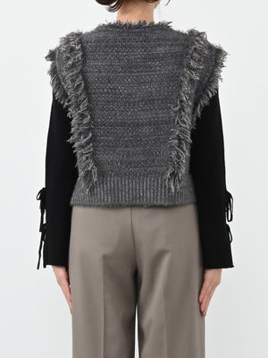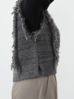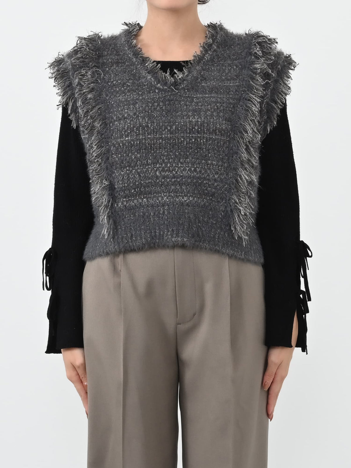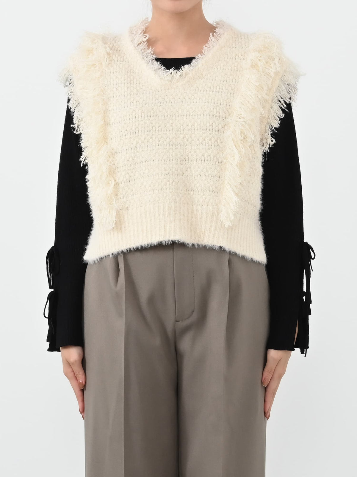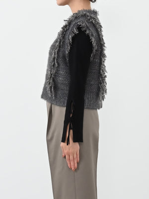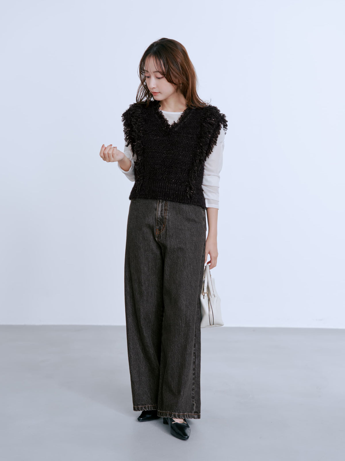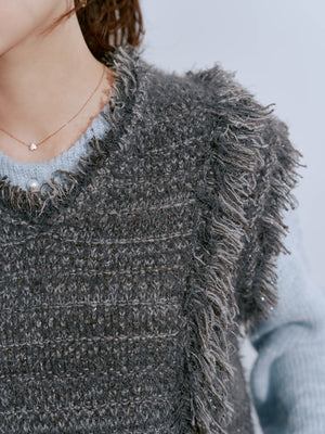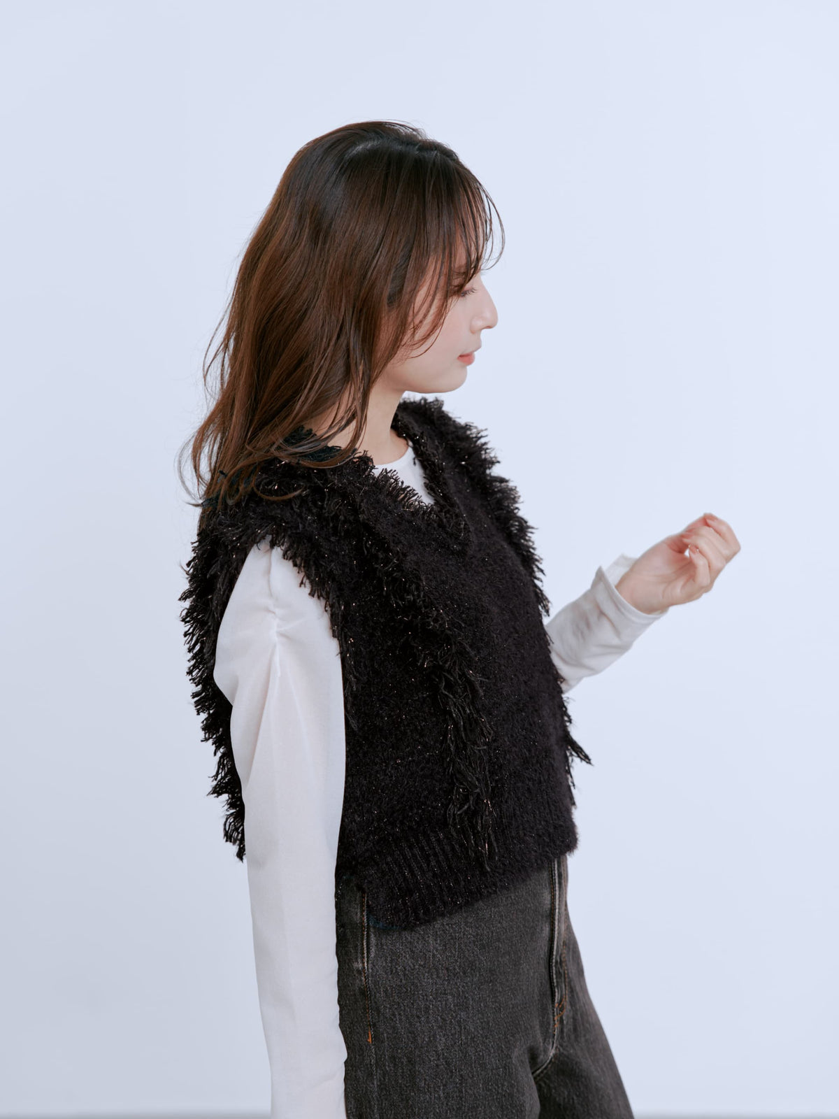 さりげないラメ糸の煌めきとフリンジの表情が魅力的なニットベスト。シンプルなシャツやカットソーに重ねるだけで、旬なレイヤードスタイルが完成します。