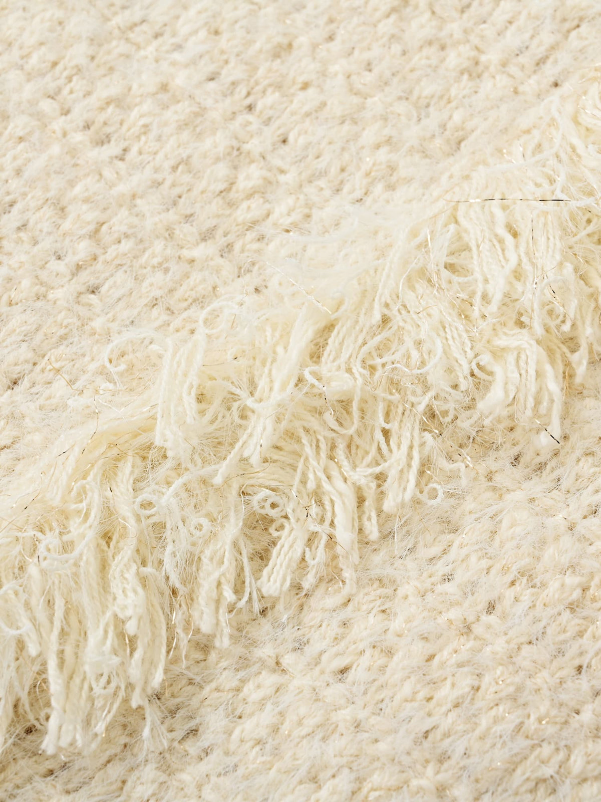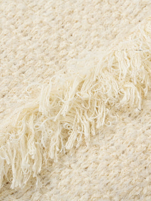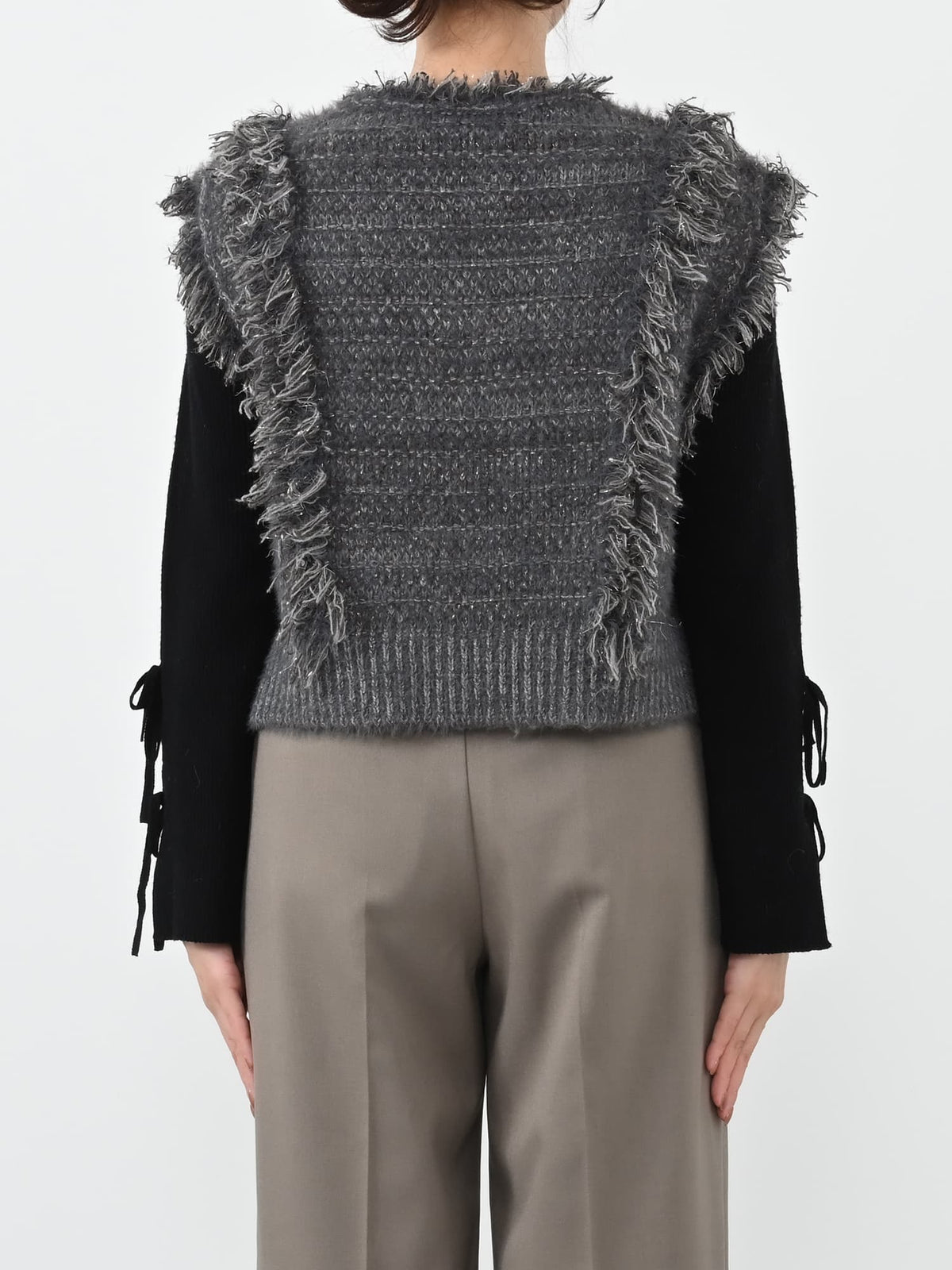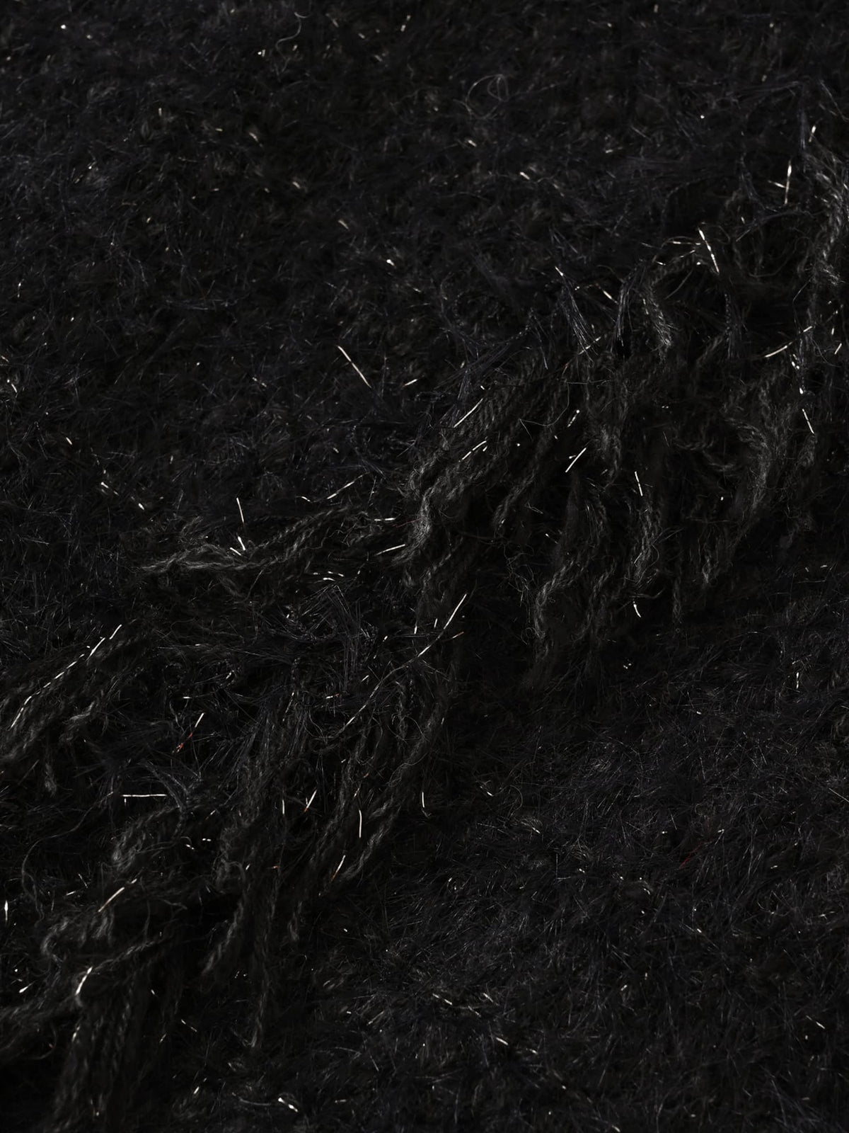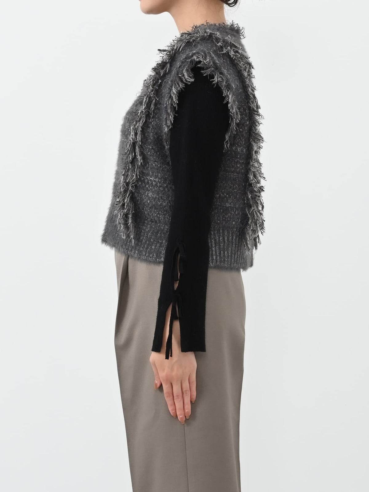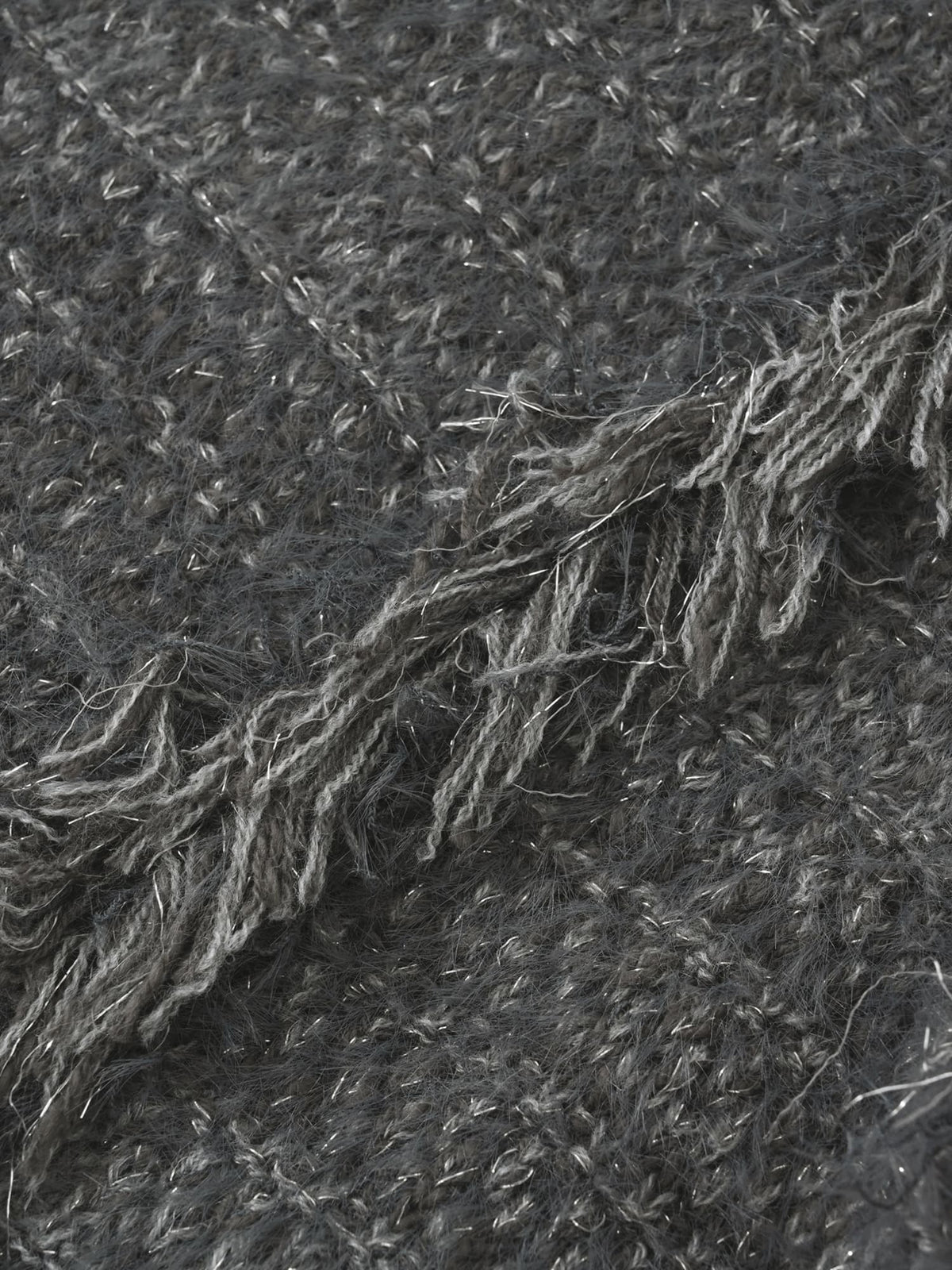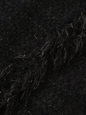 3種類の糸をミックスし、表情豊かな編み地が着映えしてくれます。軽やかなフリンジにラメが混ざり合い、女性らしさをより引き出してくれます。