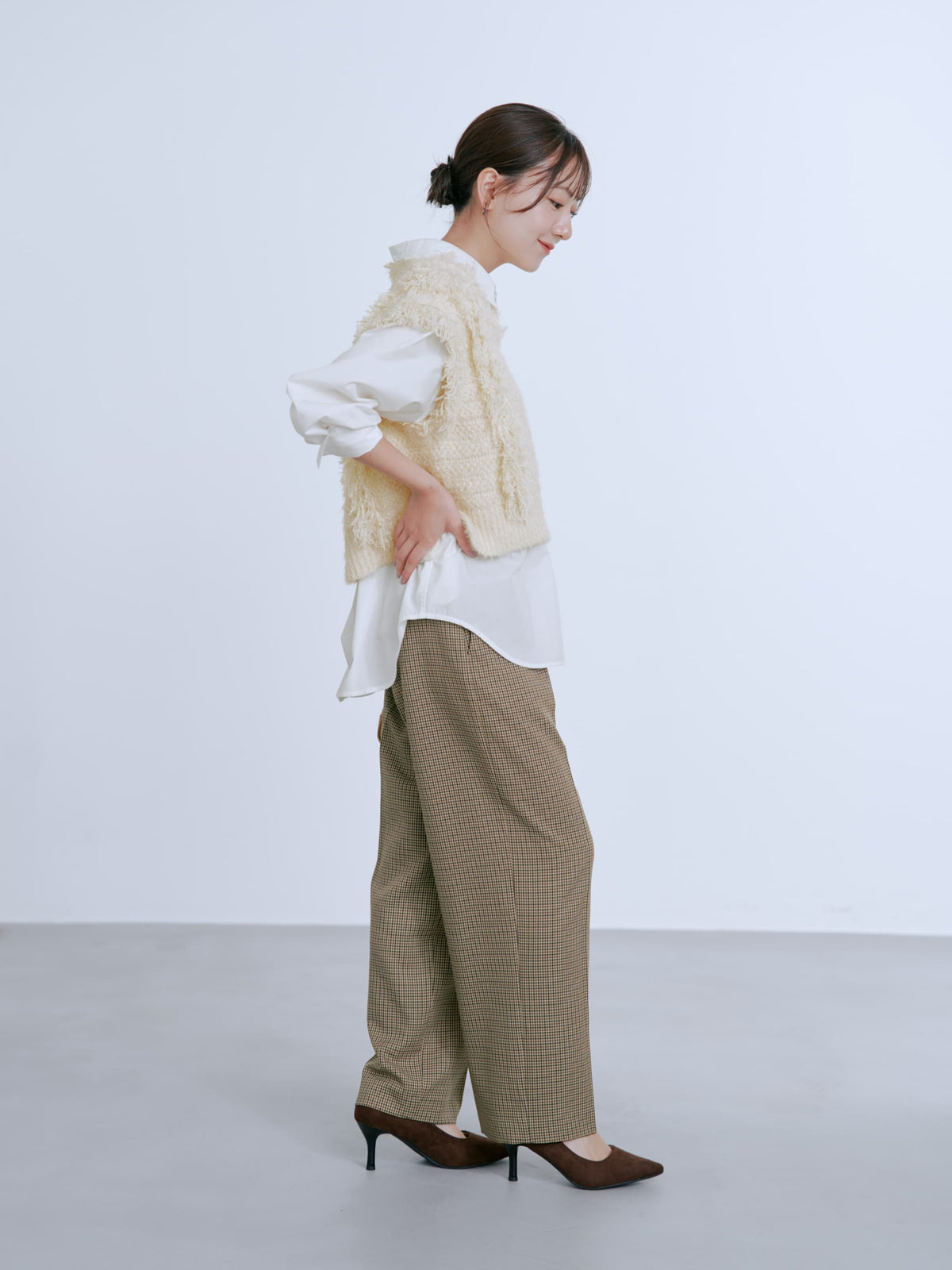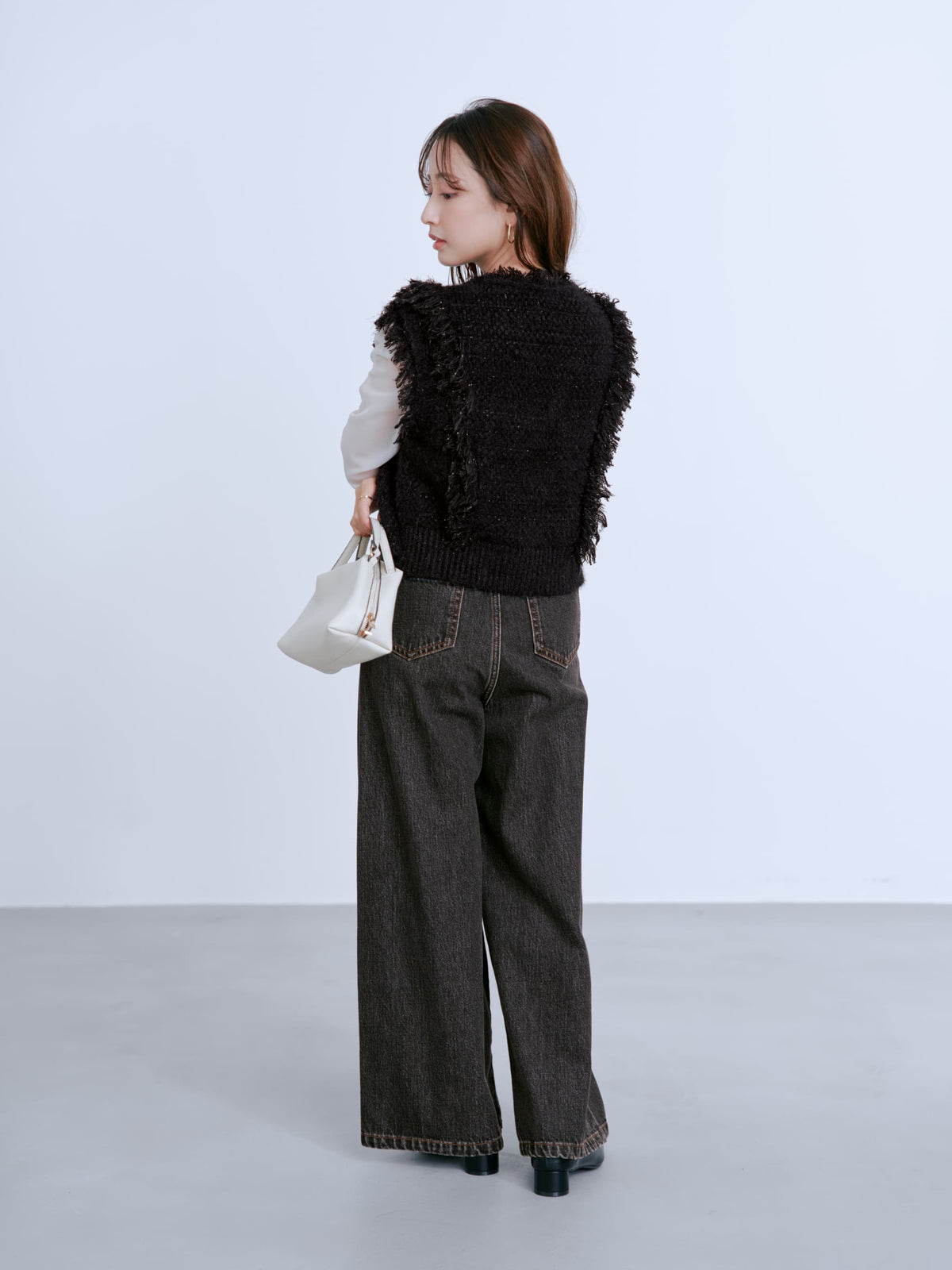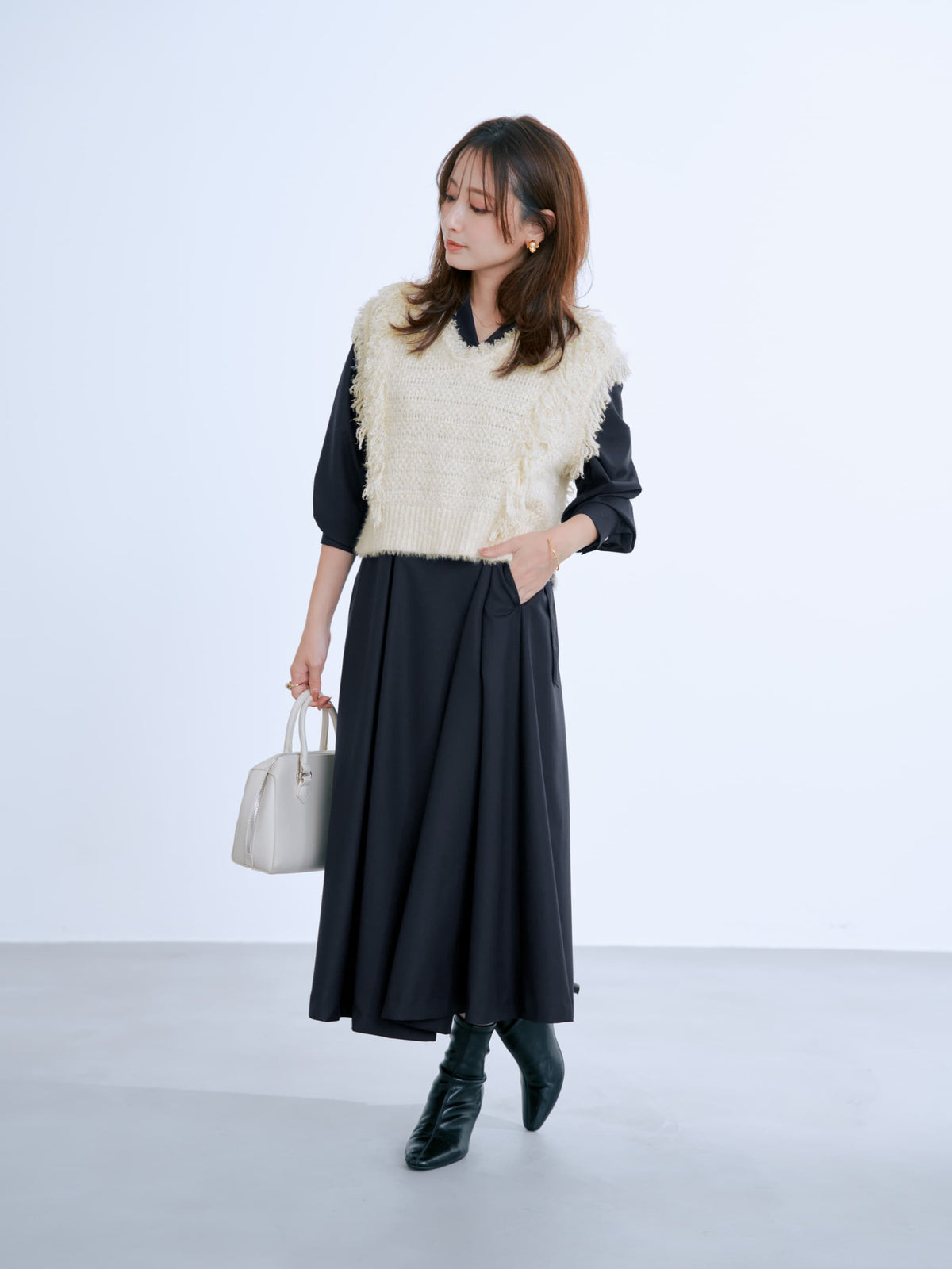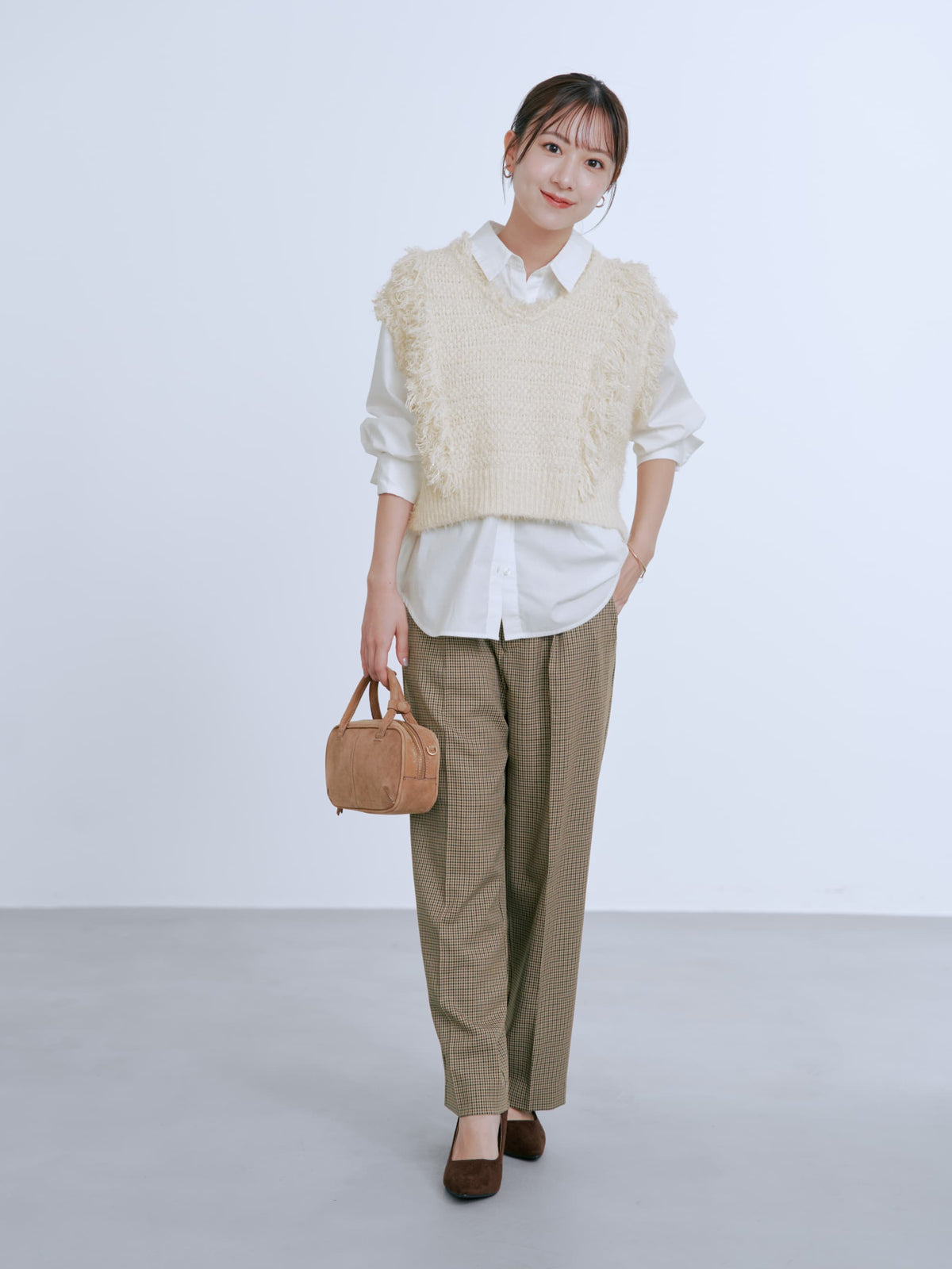 骨格ストレートで、上半身にボリュームがあるものを持ってくるのは苦手意識があったのですが、フリンジの毛の長さまでこだわったベストなので、むしろすっきり・スタイルアップして着られました◎
