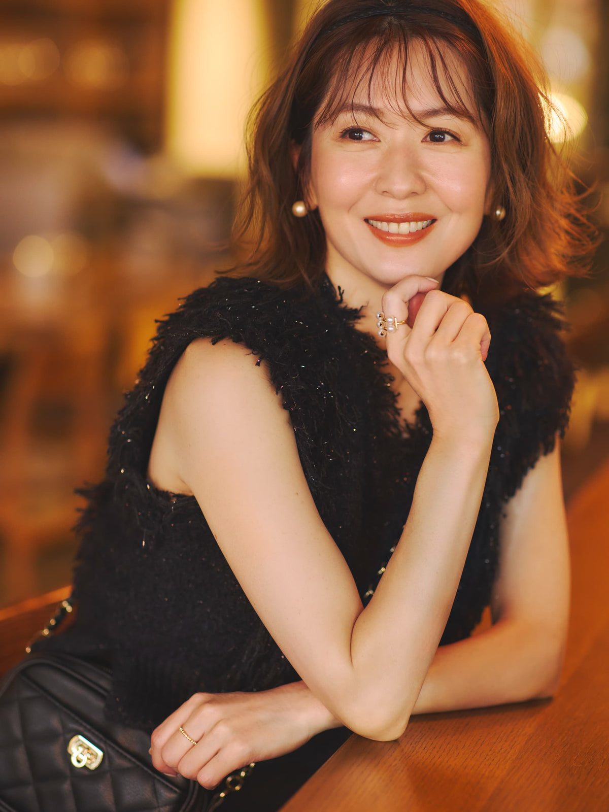さりげないラメ糸の煌めきとフリンジの表情が魅力的なニットベスト。シンプルなシャツやカットソーに重ねるだけで、旬なレイヤードスタイルが完成します。