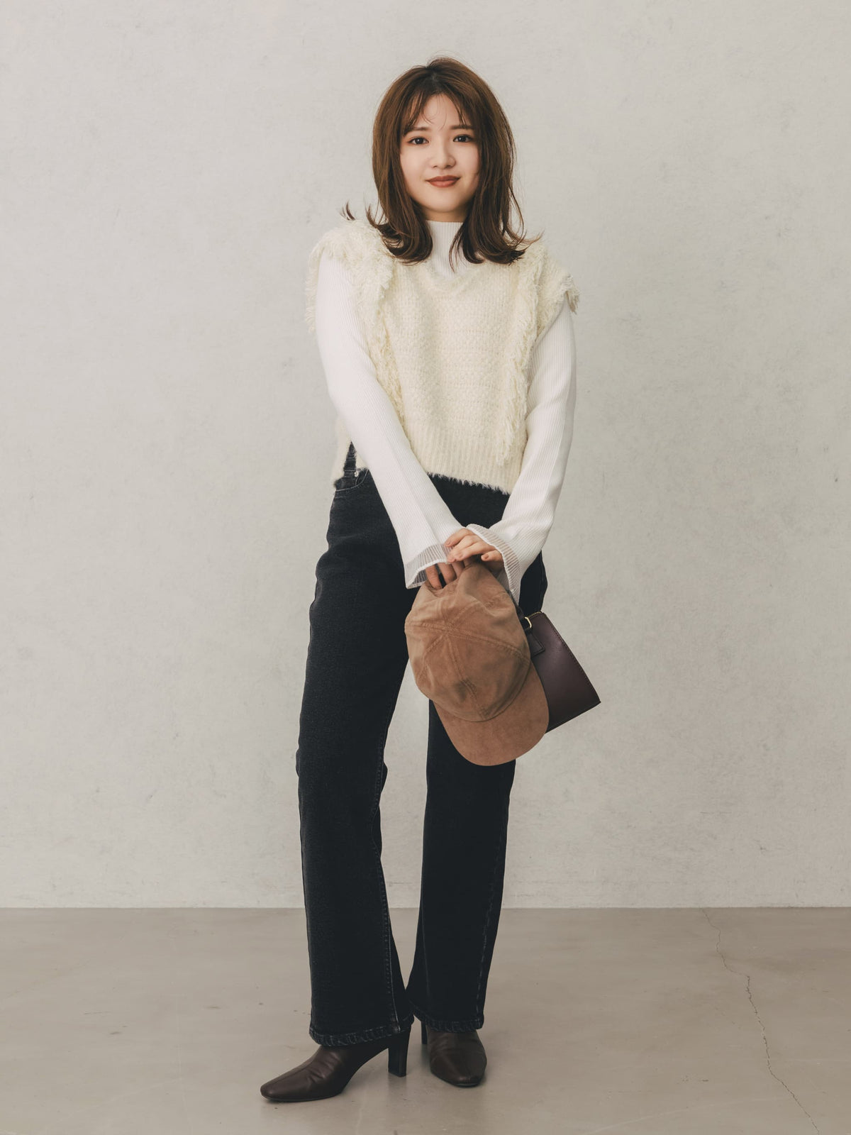 骨格ストレートで、上半身にボリュームがあるものを持ってくるのは苦手意識があったのですが、フリンジの毛の長さまでこだわったベストなので、むしろすっきり・スタイルアップして着られました◎