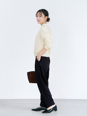 襟ぐりはすっきりとさせ、1枚着としてもレイヤードでも映える合わせやすいデザイン。パールボタンで品良くアクセントをプラス。抜け感と女性らしさが絶妙なニュアンスのある1着です。
