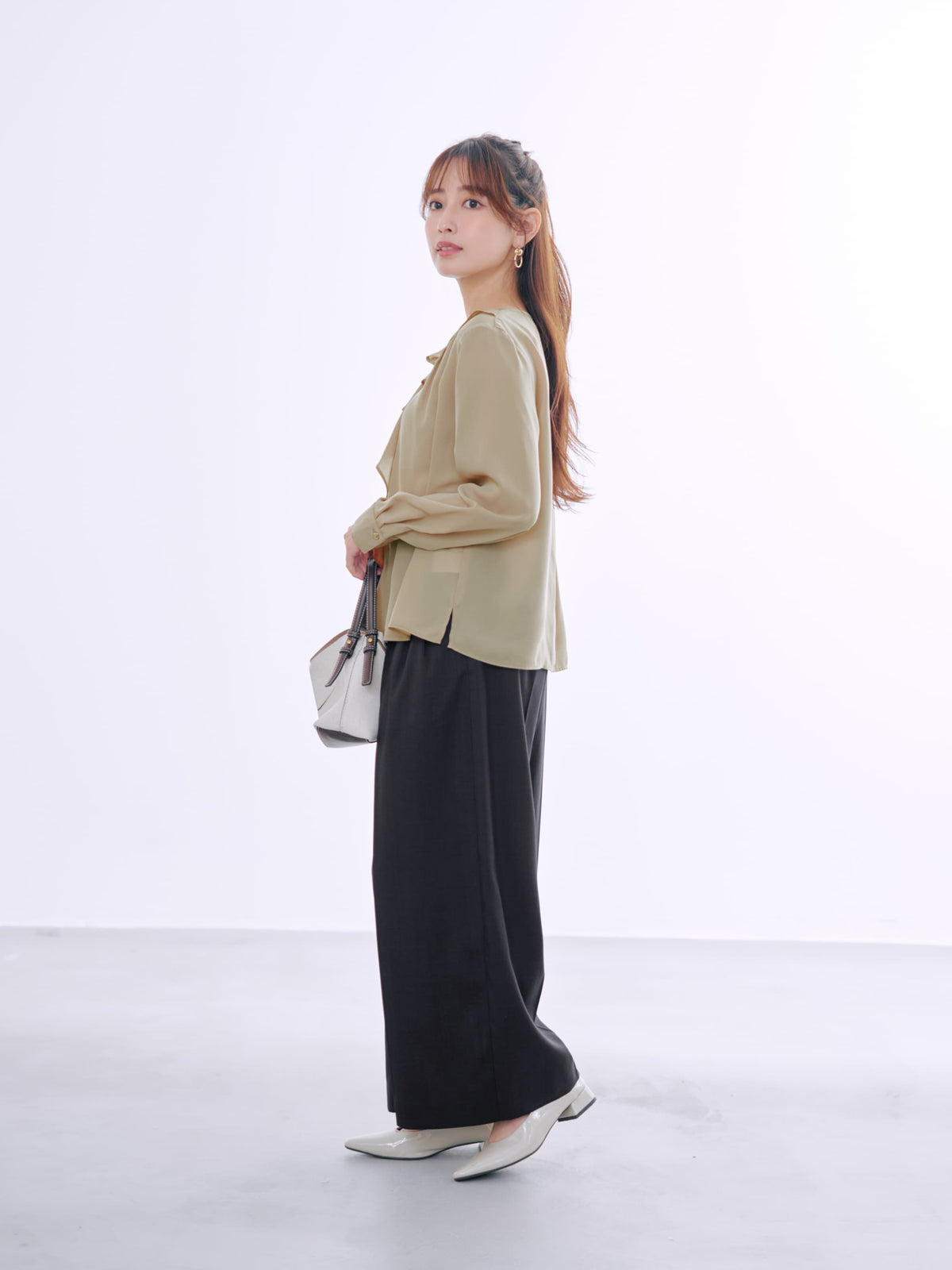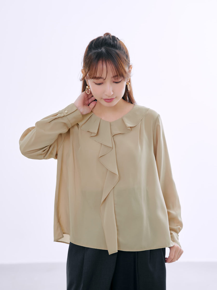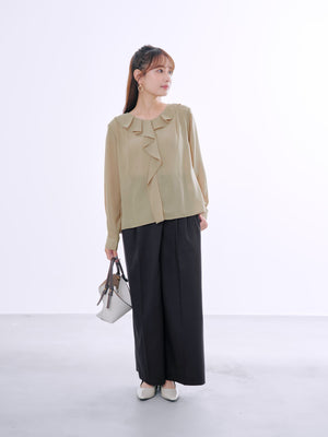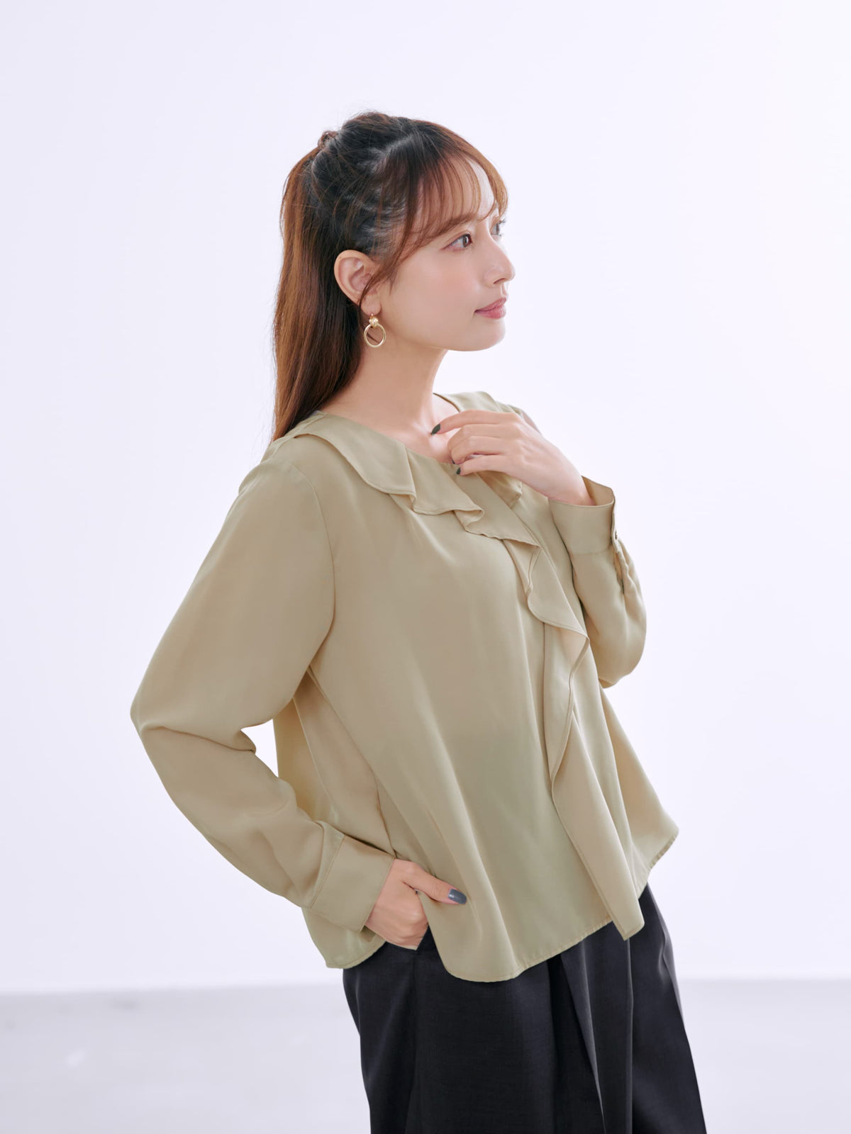 揺れるラッフルカラーが華やかに映える、大人のとろみブラウス