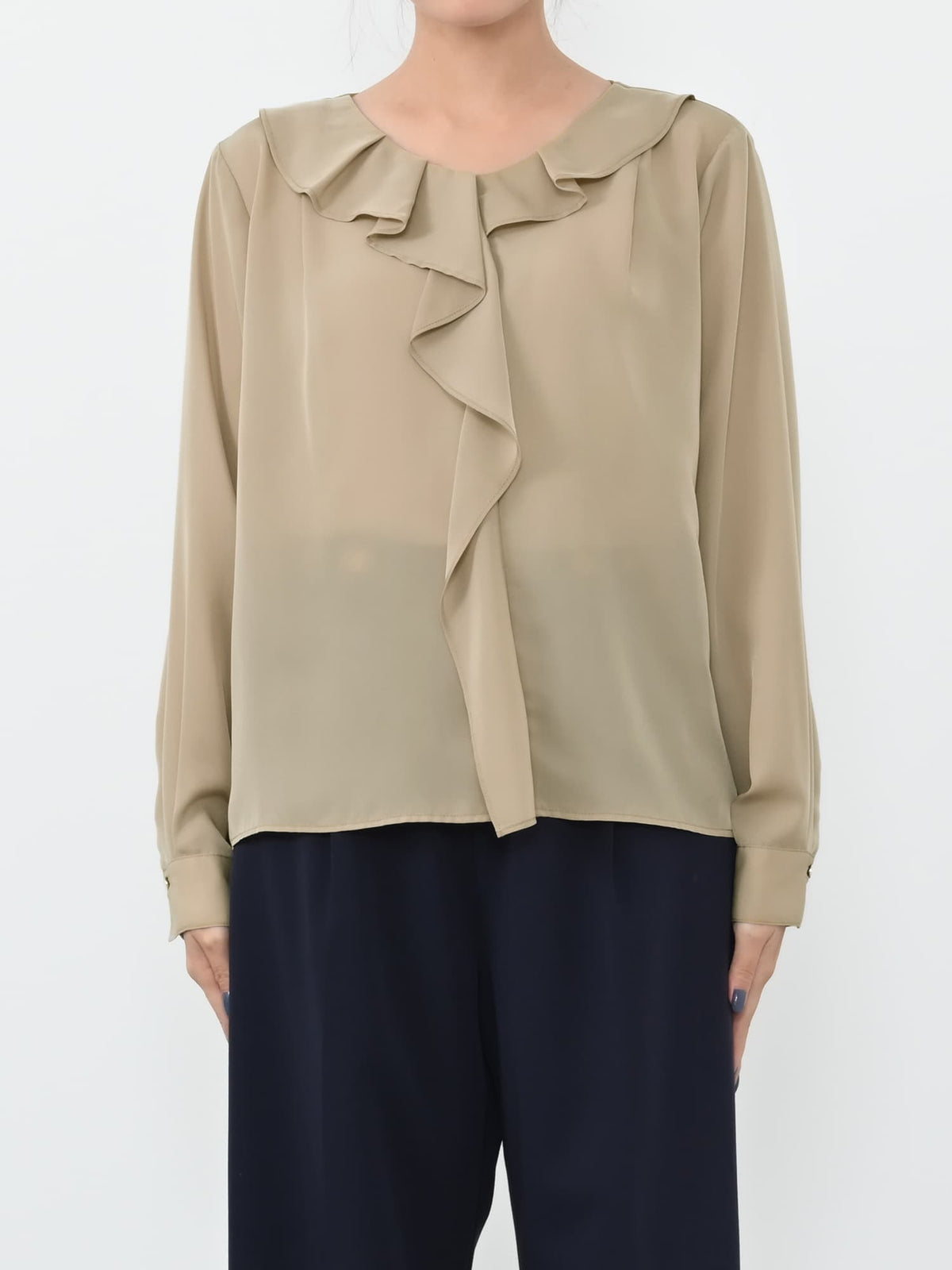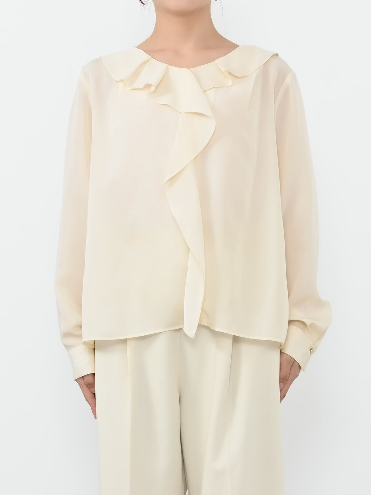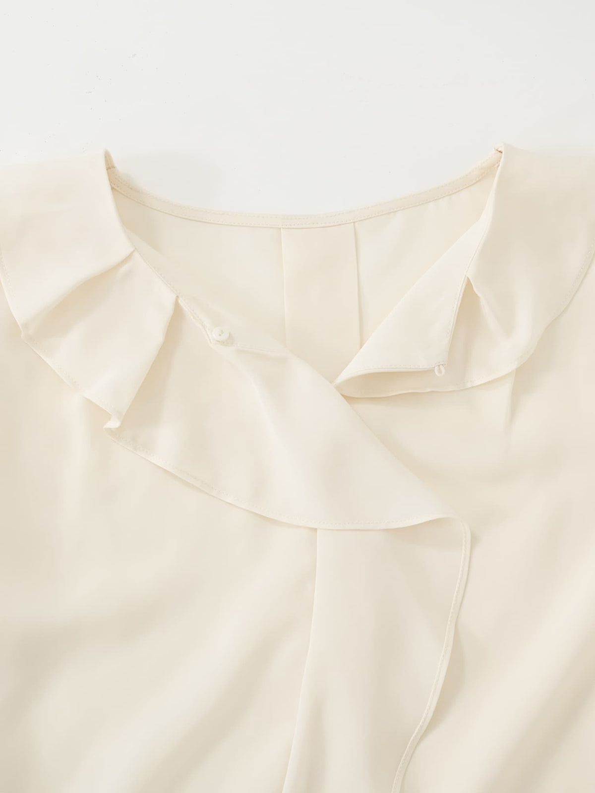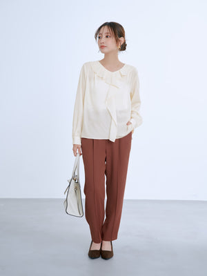 揺れるラッフルカラーが華やかに映える、大人のとろみブラウス