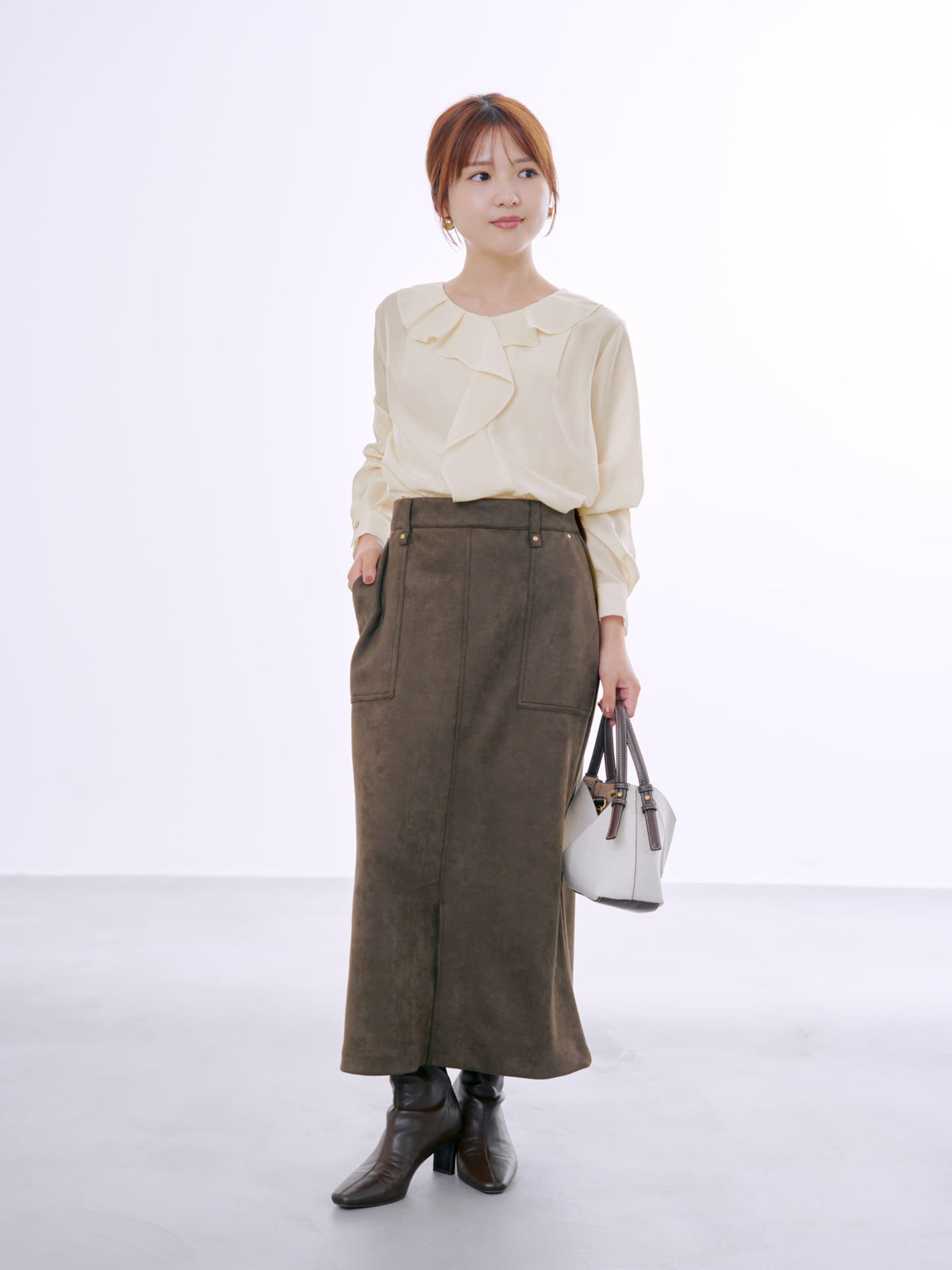体型をさりげなくカバーしつつ、上品に着こなせます。オフィススタイルにも使いやすい2色展開です。