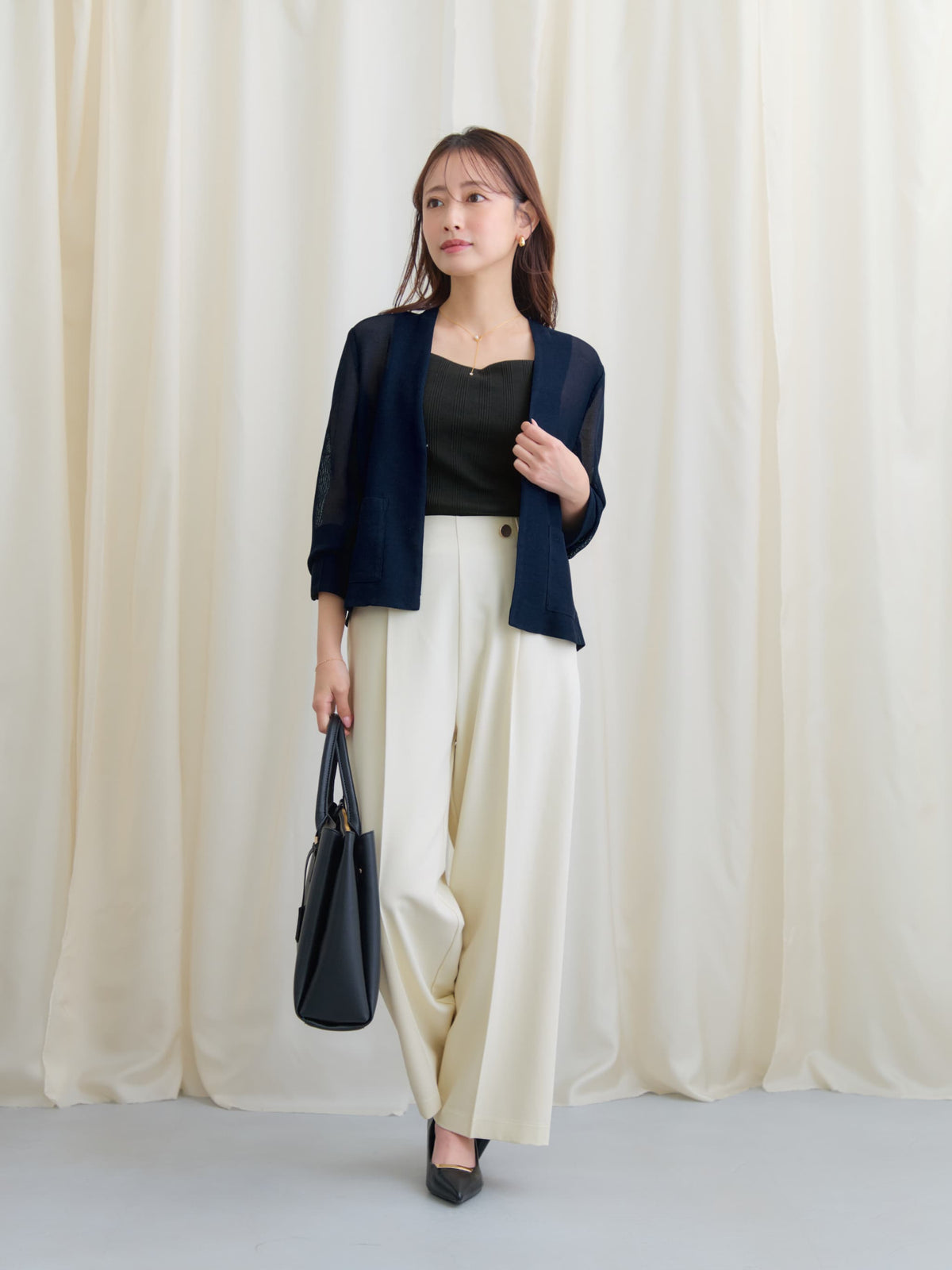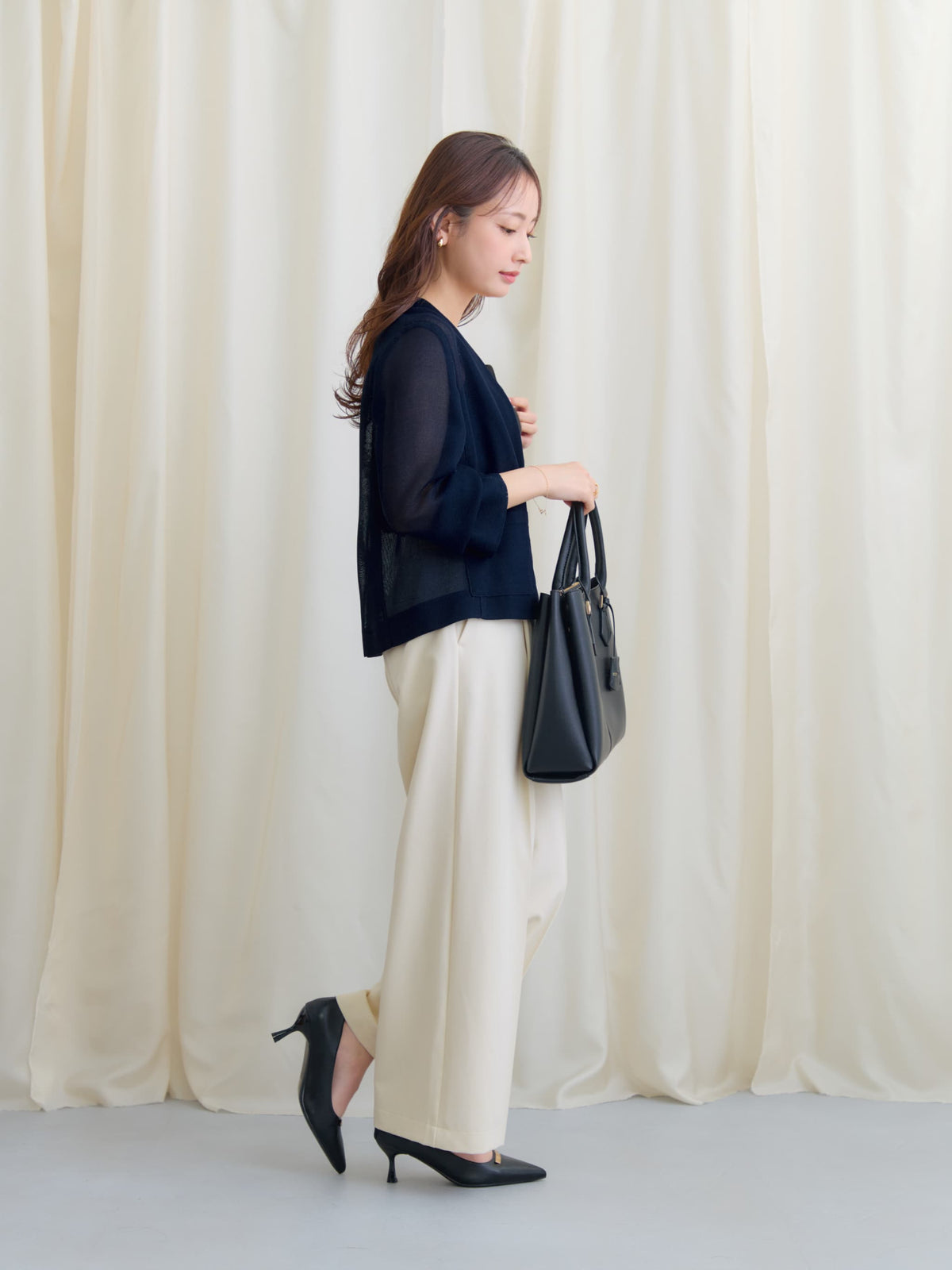 襟付きシャツやジャケットを合わせたハンサムなスタイリングから、綺麗めブラウスやハイゲージニットを合わせて品良くまとめたスタイルなど、様々な着こなしにマッチ。カジュアルなニットやカットソー合わせのデイリー使いも上品にまとまります。