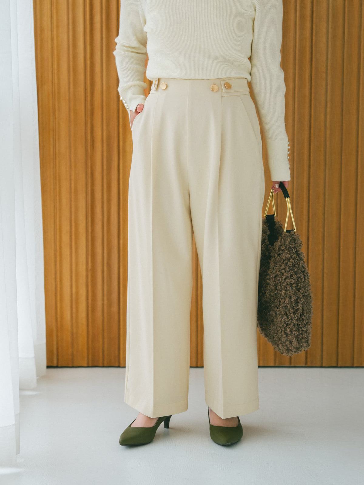 フロントのゴールドボタンがさりげなく、ハイウエストなので自然と腰位置が高く見え、スタイルアップ効果抜群のパンツ。