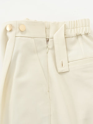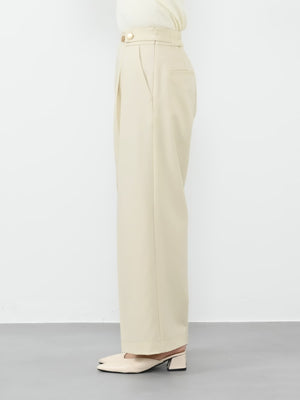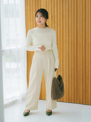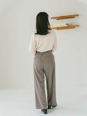 サイドファスナー仕様で、ウエストまわりをすっきりと見せてくれるデザインです。ストンと落ちるIラインシルエットとセンタープレスの縦ラインですらりとした印象の綺麗めパンツに仕上げました。