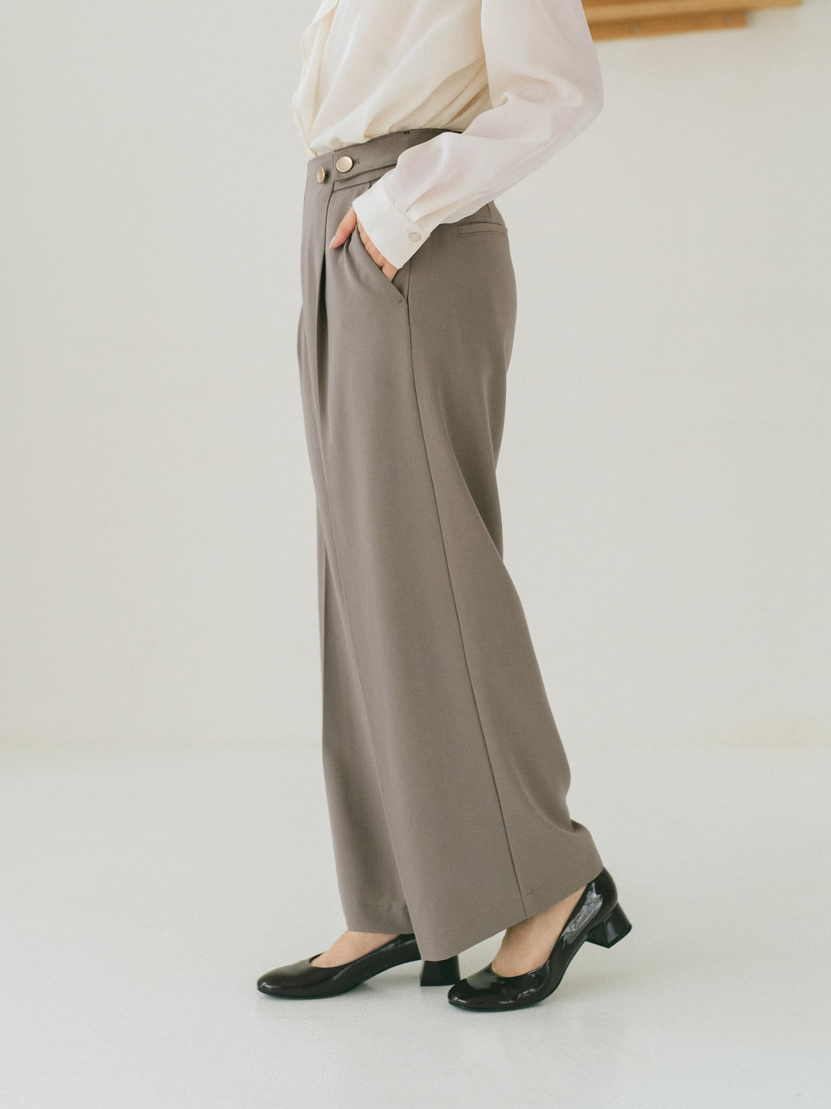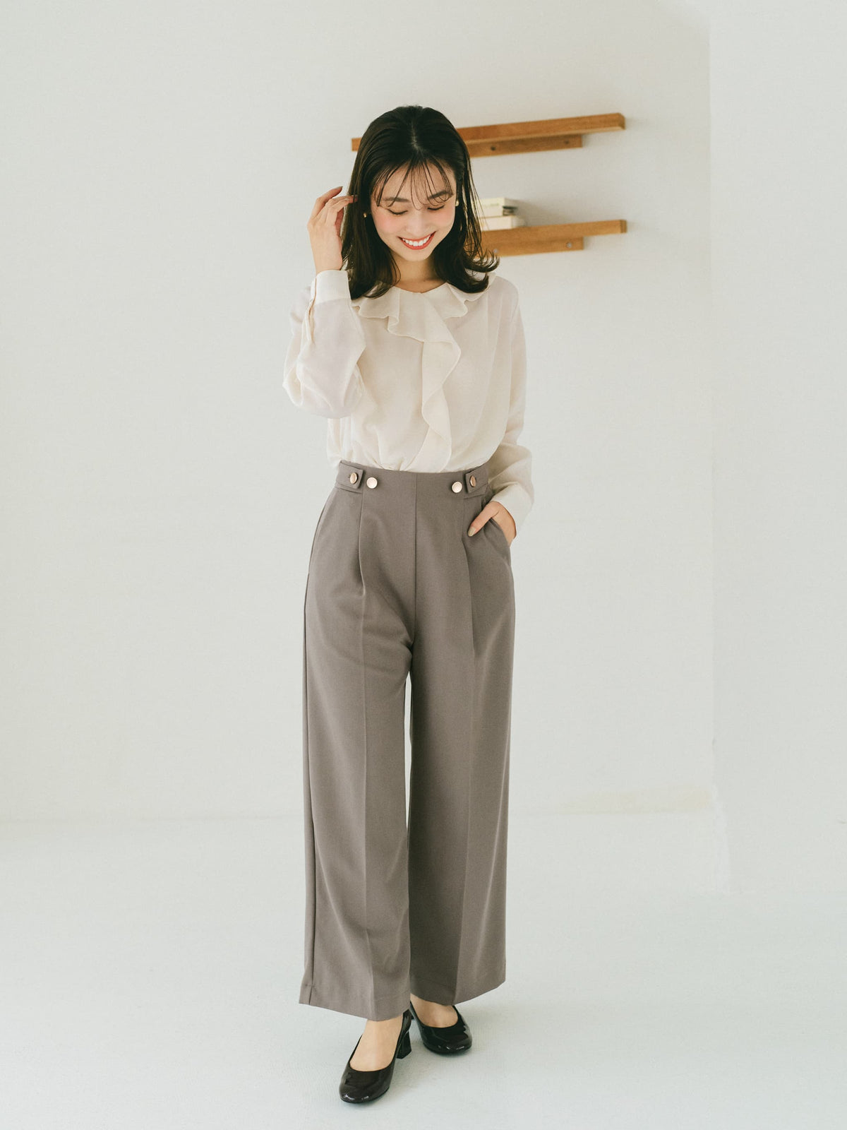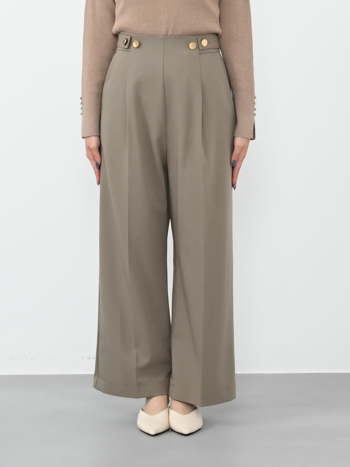 ※こちらが実物のカラーに一番お色味が近くなっております。(グレージュ)<br>149cm | B:77 W:60 H:83 股下:68.5 | regular-XS着用(ヒールの高さ: 3.5cm)