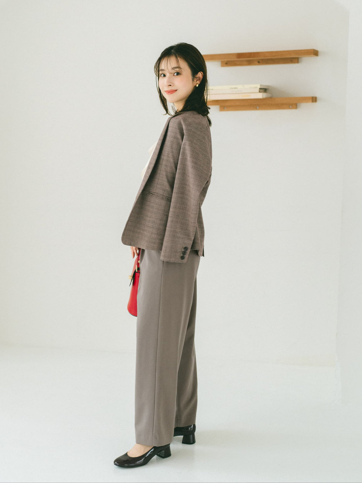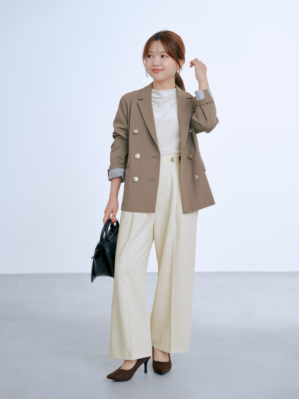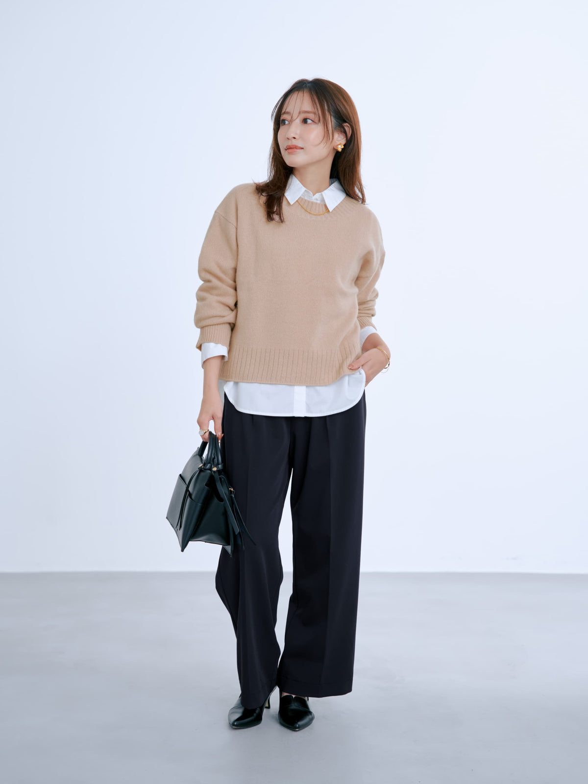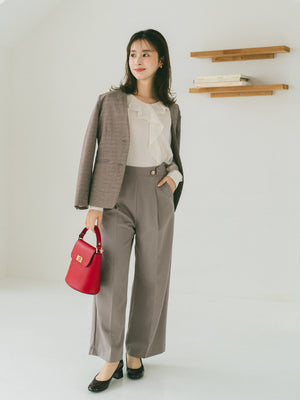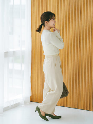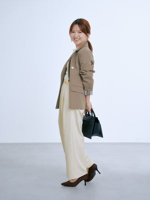 襟付きシャツやジャケットを合わせたハンサムなスタイリングから、綺麗めブラウスやハイゲージニットを合わせて品良くまとめたスタイルなど、様々な着こなしにマッチ。カジュアルなニットやカットソー合わせのデイリー使いも上品にまとまります。