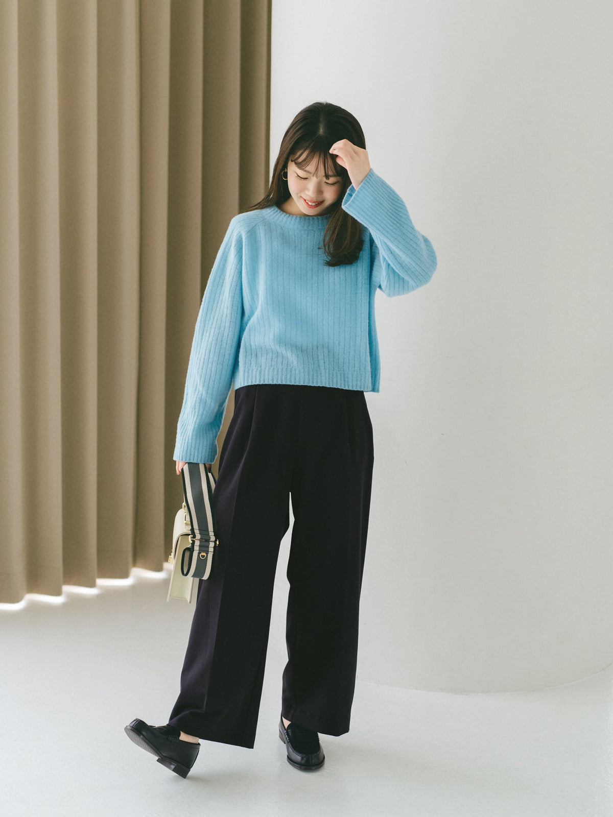 ・繊細な素材を使用しているため、カバンなどの摩擦により毛羽立ちやピリング(毛玉)などが発生する場合があります。ピリングができましたら引っ張って取ろうとせず、ブラッシングするか、小さなハサミで一つ一つ取り除いて下さい。
