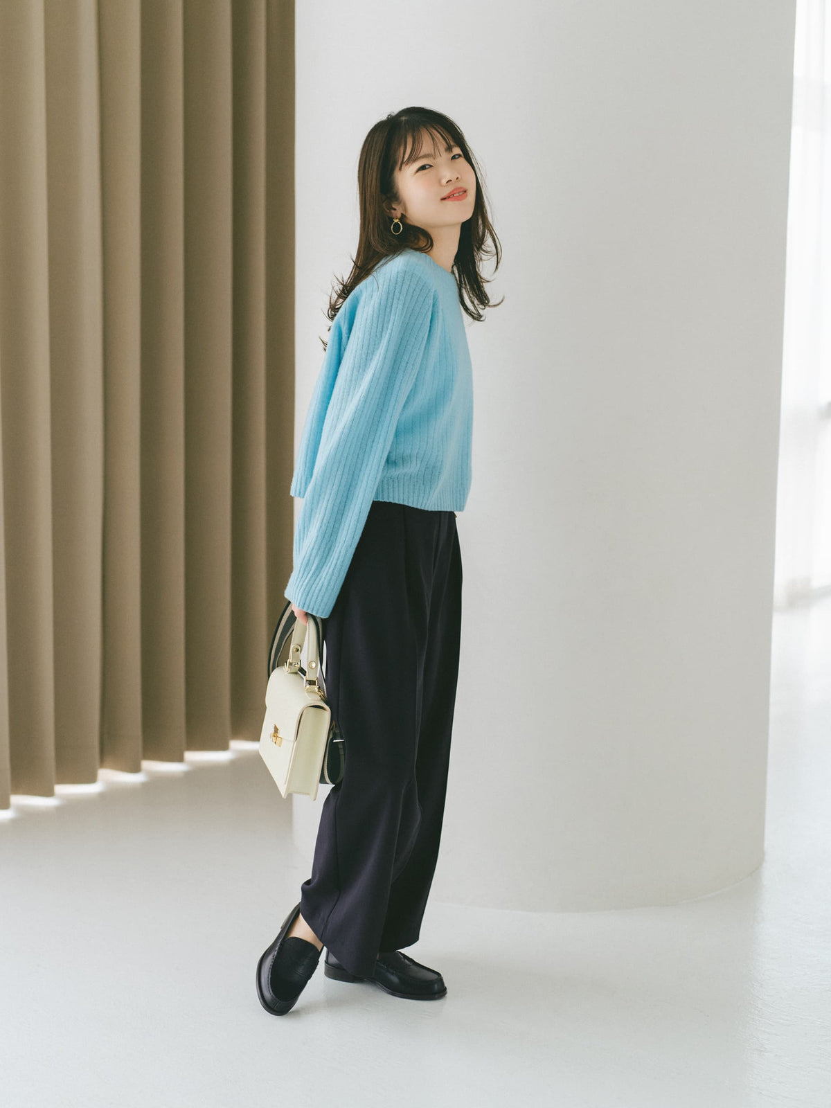COHINAでは毎シーズンマリンパンツが大人気!キラリと光るウエストのボタンが目線アップ効果と、綺麗め要素をプラスしてくれます♡身長148cmで足首が隠れる丈感なので、しっかりとフルレングスで楽しめます。フラットシューズやローファー合わせもバッチリ!リブニットをインしましたが、ゆとりがあったので、インコーデでも大活躍してくれます。(regular-XS着用)