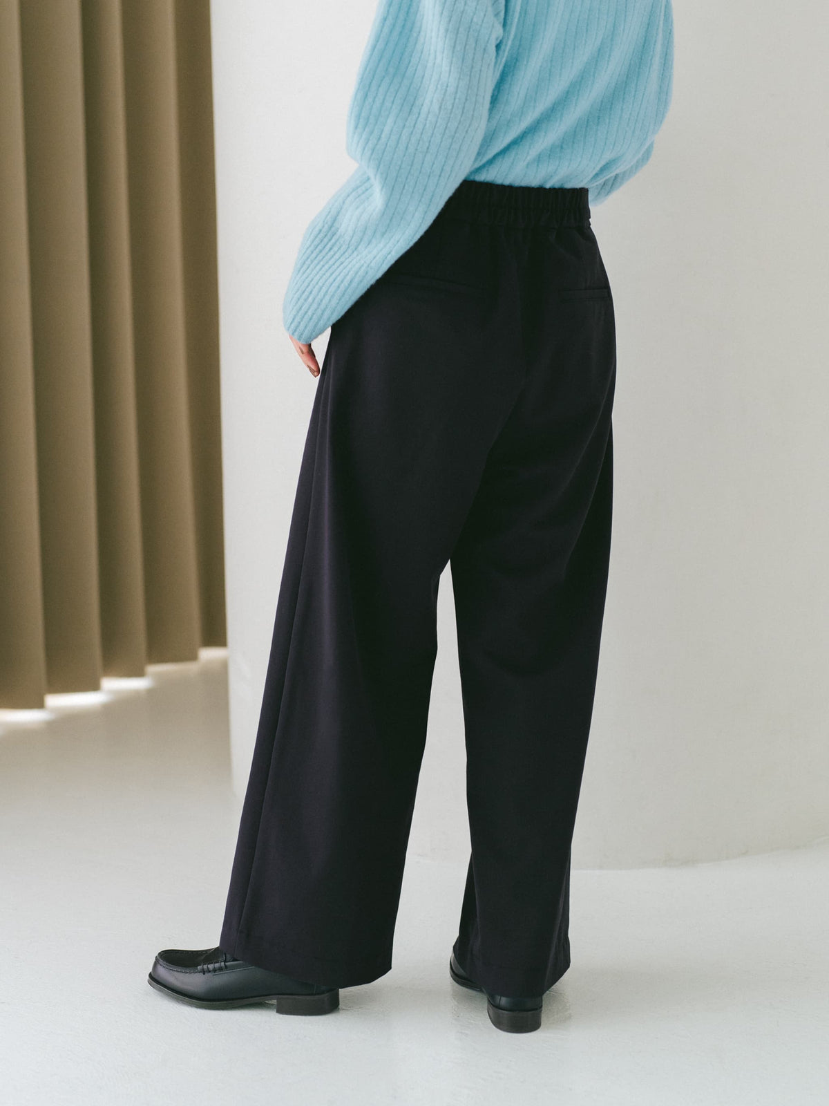 綺麗めな表情の綾目の合繊素材を使用。微ストレッチが効いており、きちんと感と履き心地の良さを両立。落ち感のある生地がストレートシルエットを強調し、脚をまっすぐ綺麗に演出してくれます。