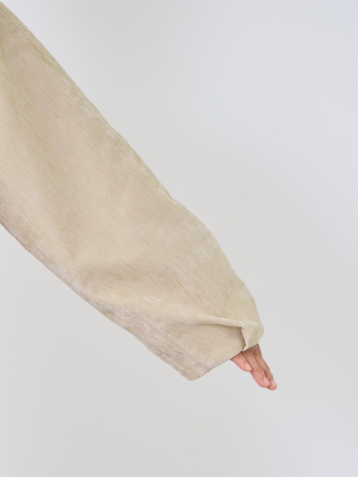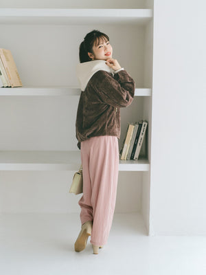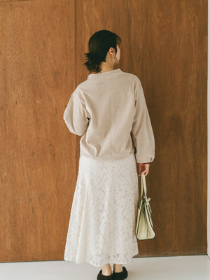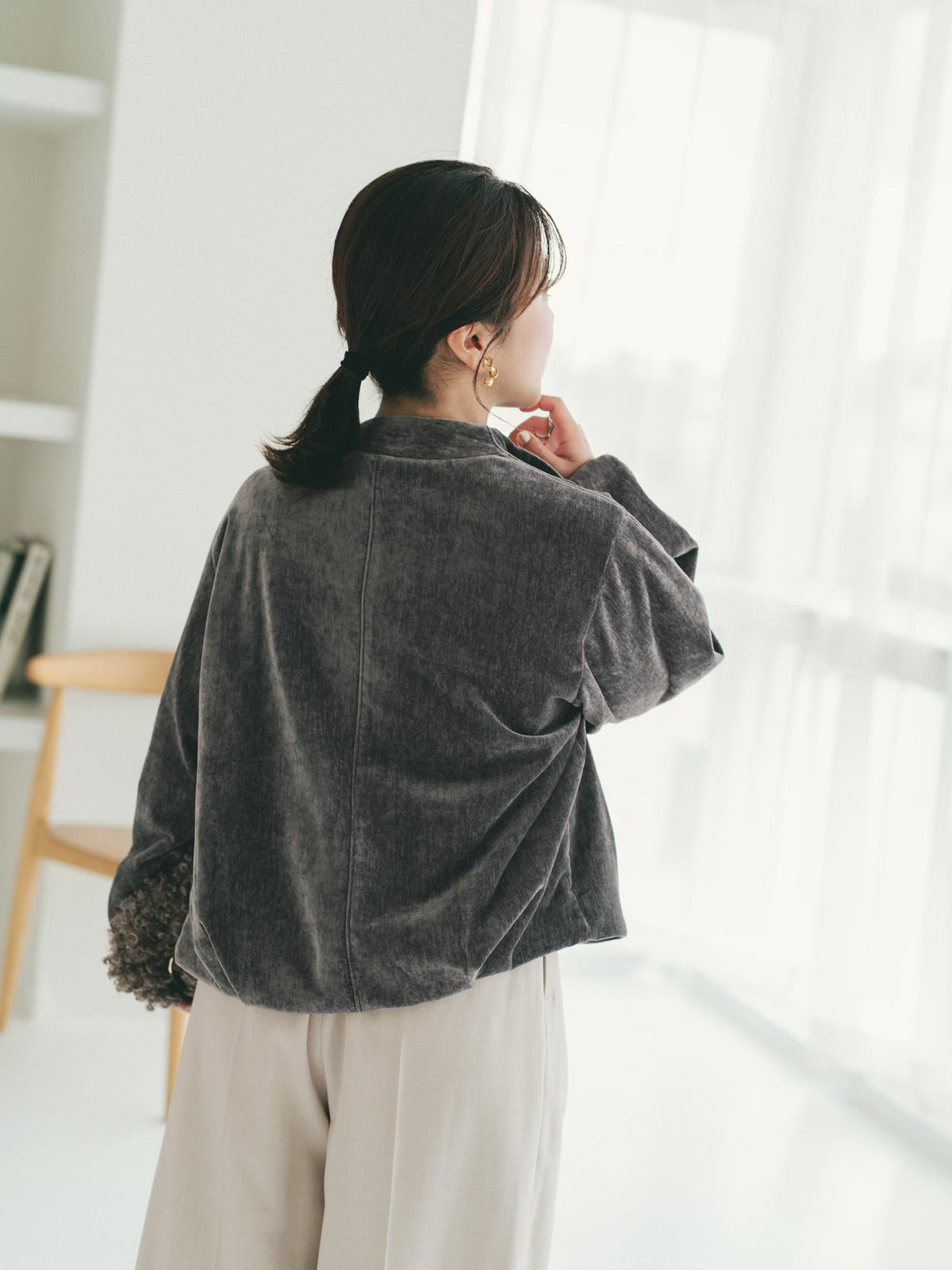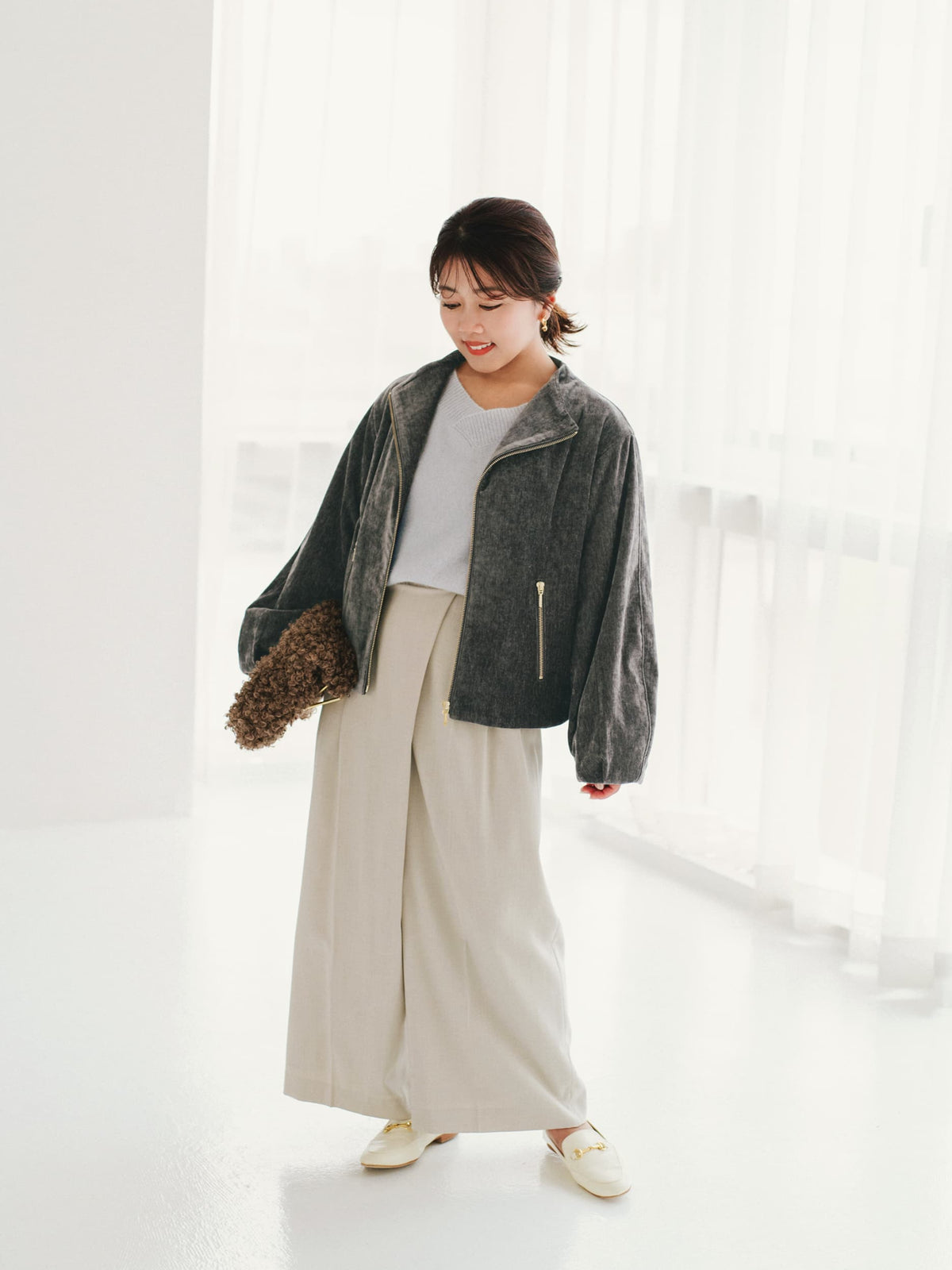 ワイドパンツやロングスカートで、ゆるっとした抜け感のあるスタイルに仕上がります。ニットの上に羽織れば、柔らかい素材同士の組み合わせで女性らしさを演出してくれます。同素材で展開しているパウダリーベロアIラインスカートとのコーディネートもおすすめです。