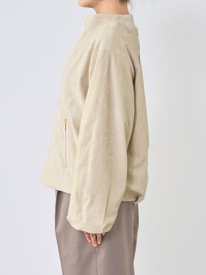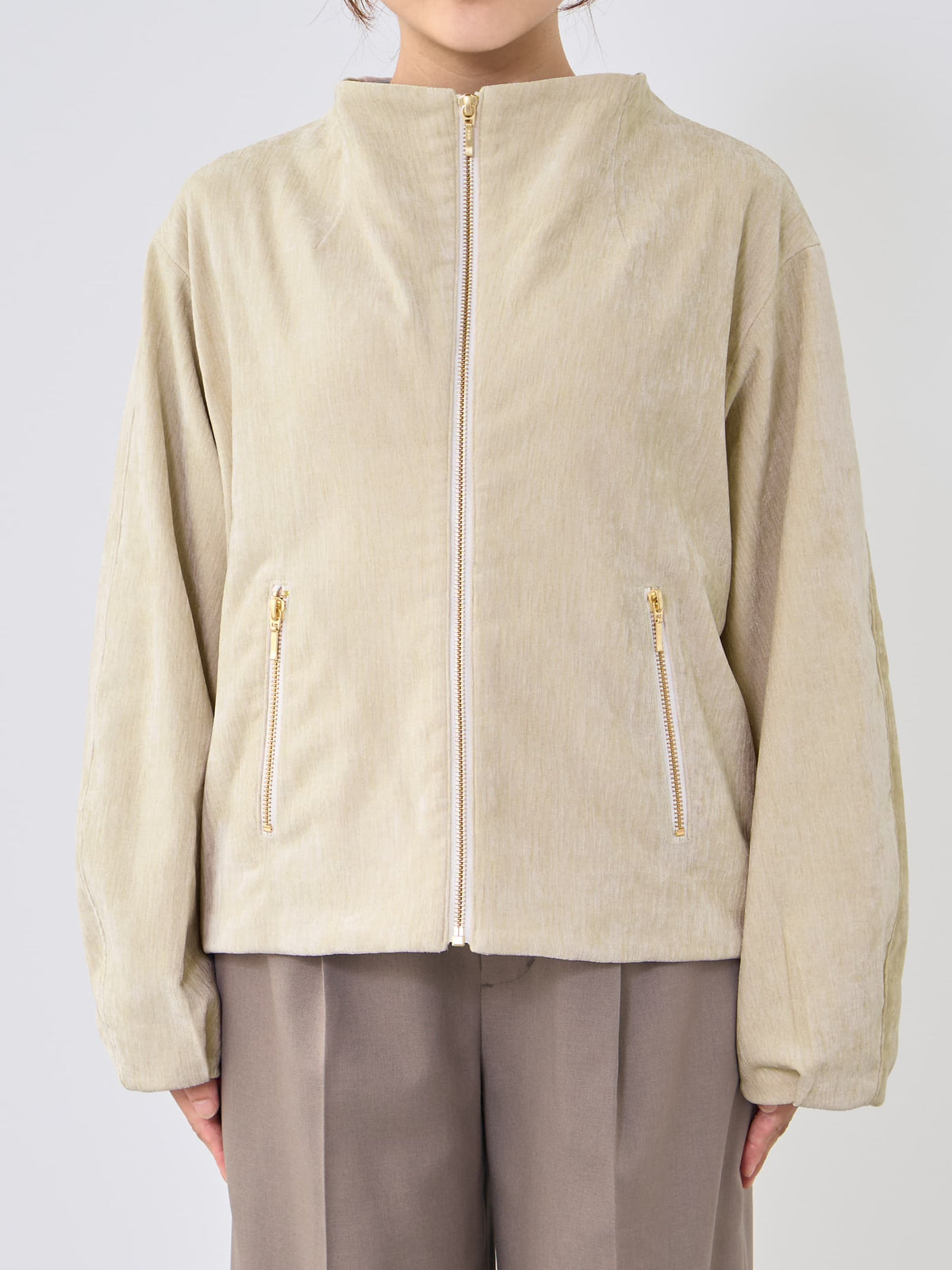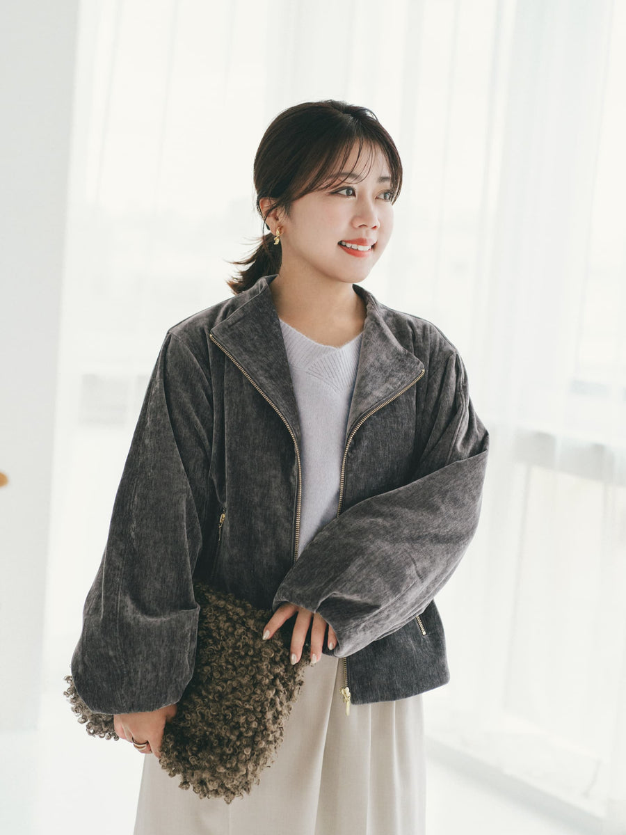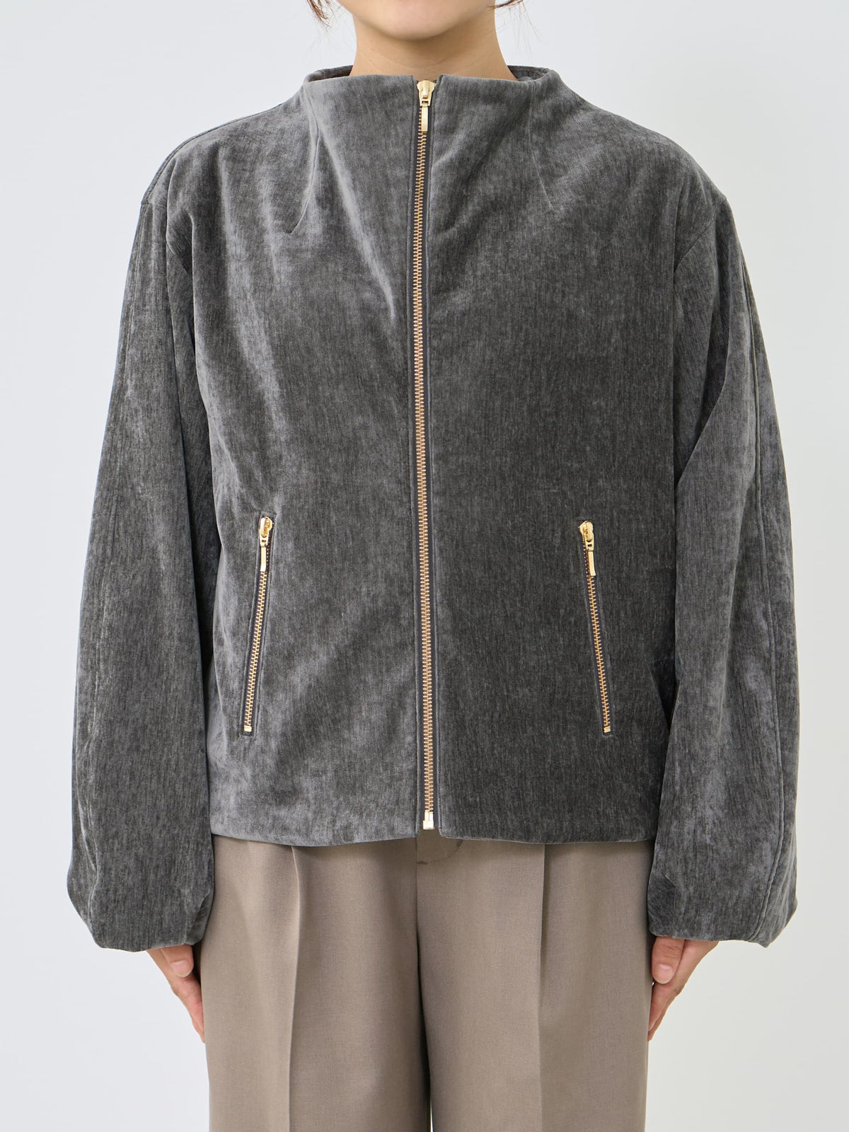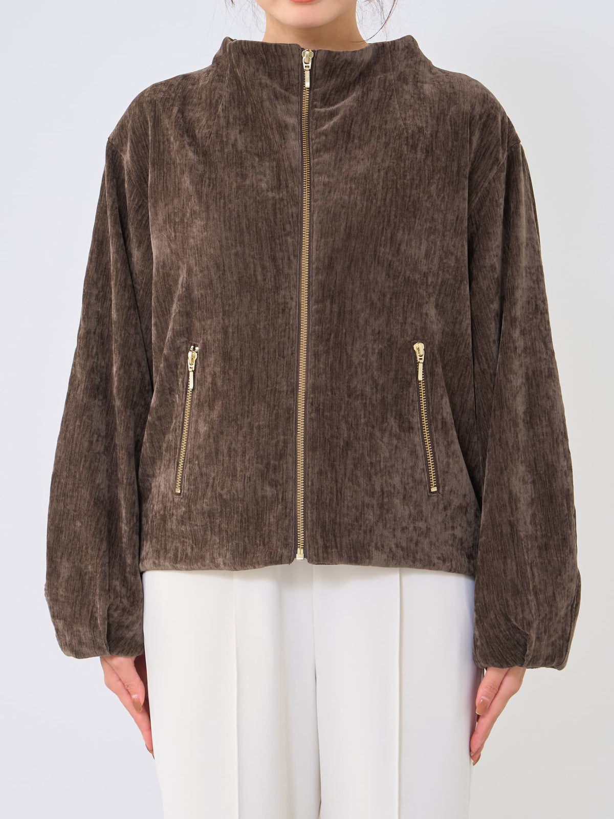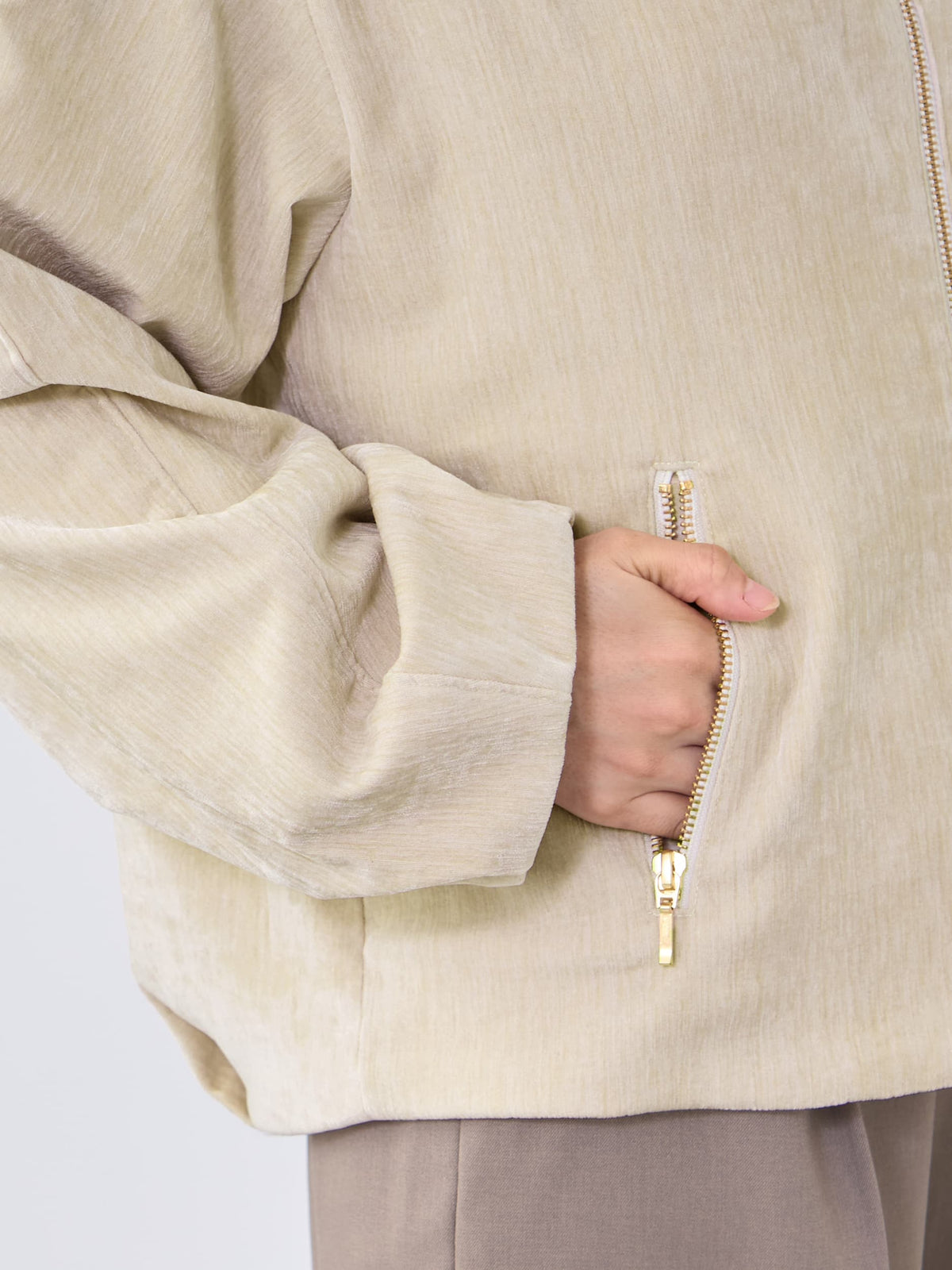 滑らかな肌触りと、ほんのりツヤを感じるパウダリー調のベロア素材が魅力のジップアップブルゾン。
