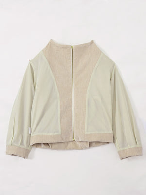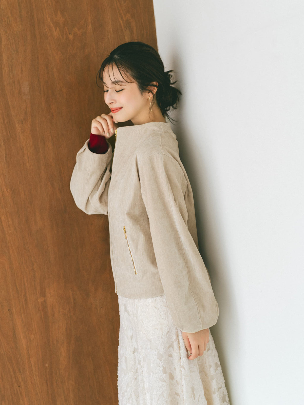 イエベ春(2ndブルベ夏)で、なんとなくベージュが良さそうかなと思って店舗で実物を見たところ、絶妙な白っぽさがmixされた優しいチャコールの色味に惹かれて、普段グレーはあまり選ばないのですが、こちらにしました。肌触りが柔らかくて滑らかで、軽くて全然窮屈さを感じないから、つい手が伸びてしまいそうです。生地のパウダリーな見た目と滑らかさ、ゴールドのジップが高見えして、15000円には見えないと思いました。袖や裾のポワンとしたシルエットは他ブランドでは小柄さんは着られてしまうデザインで、初めて見た時は無意識に「大丈夫かな?」と思ってしまったのですが、試着してみてそんな心配はCOHINAでは無用だったと反省しました笑 着用感はゆとりがあるのに見た目はスッキリ、さすがです。厚手のニットも余裕で着られて、風を通さないので10℃くらいまでは全然行けそうな体感です。前を開けて着るとライダースっぽく見えて可愛いです。チャコールは写真では他の色より大人っぽくクールに見えて、タイトスカートやデニム合わせはもちろん素敵ですが、花柄のワンピースなどフェミニンな洋服と合わせると甘辛mixになってこれもまた大人可愛いくて好きです。コーデの幅が広くて大活躍の予感です。