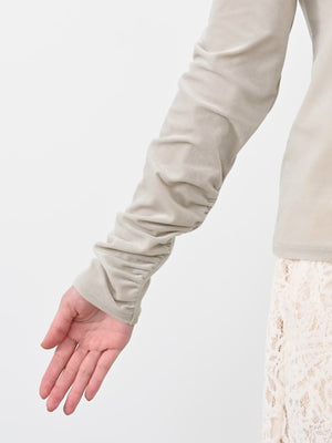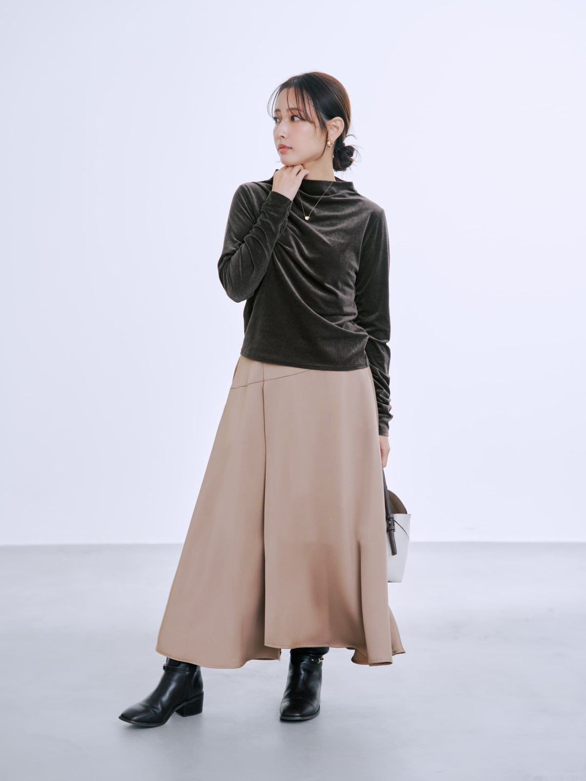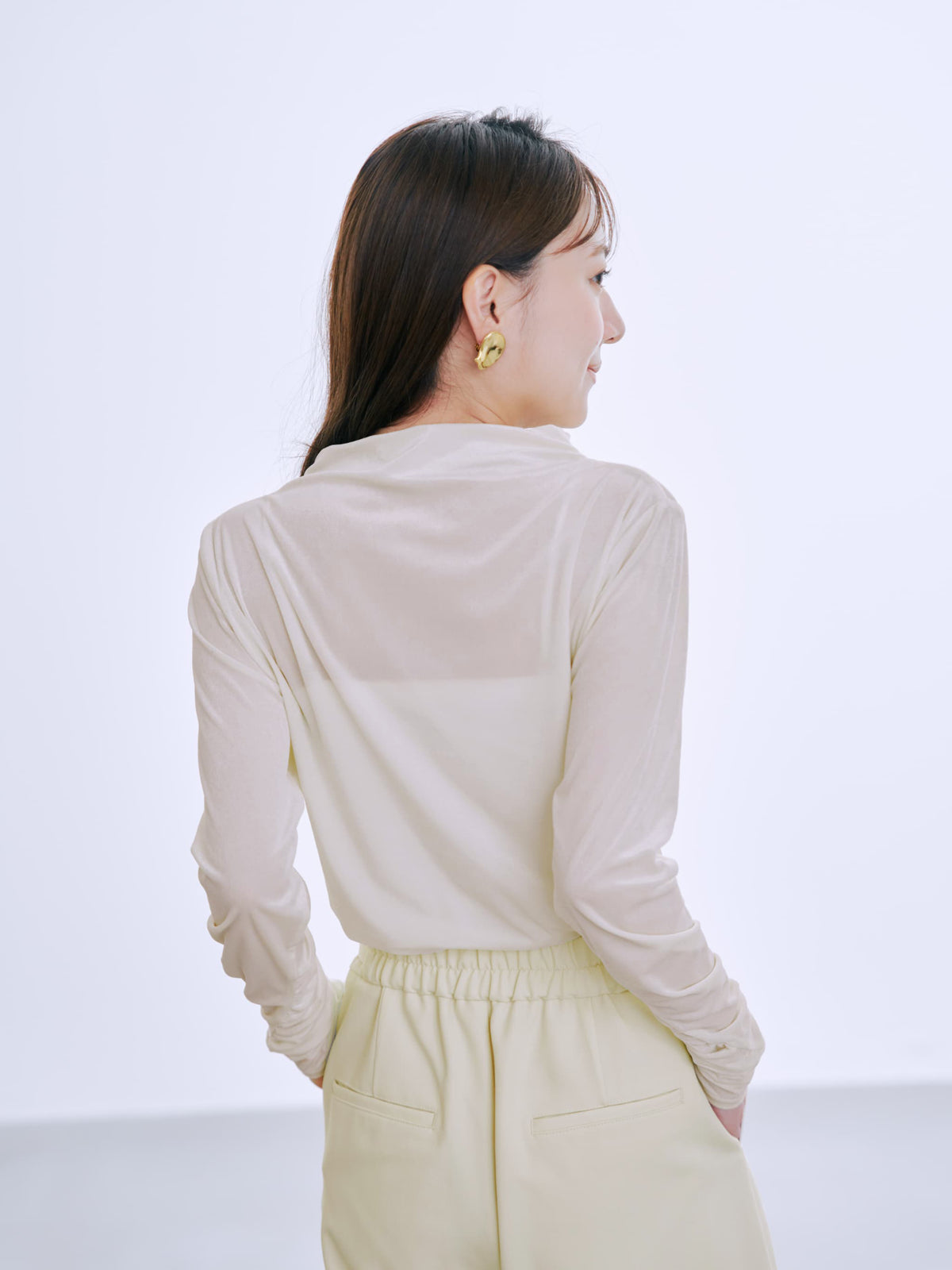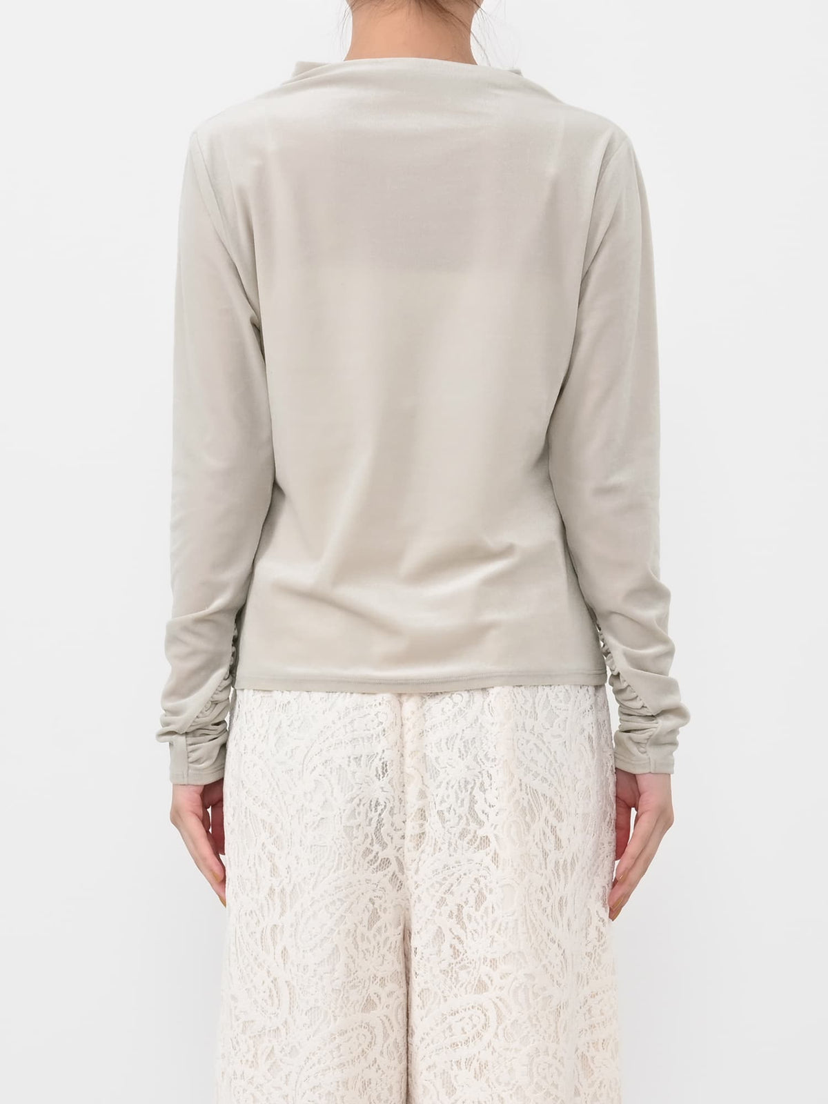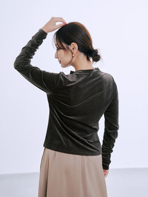 ほどよい光沢感のあるベロア素材で、シンプルなのに着るだけで華やか見えする1枚。くしゅくしゅとした袖のギャザーがポイントで、手元をオシャレに見せてくれます。