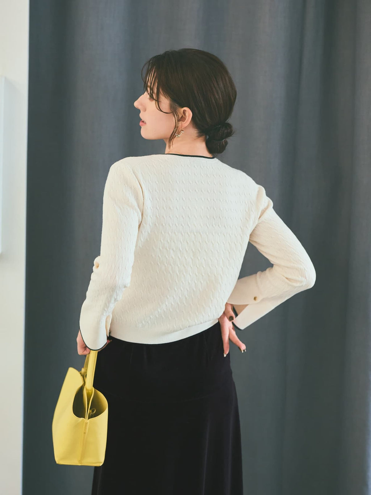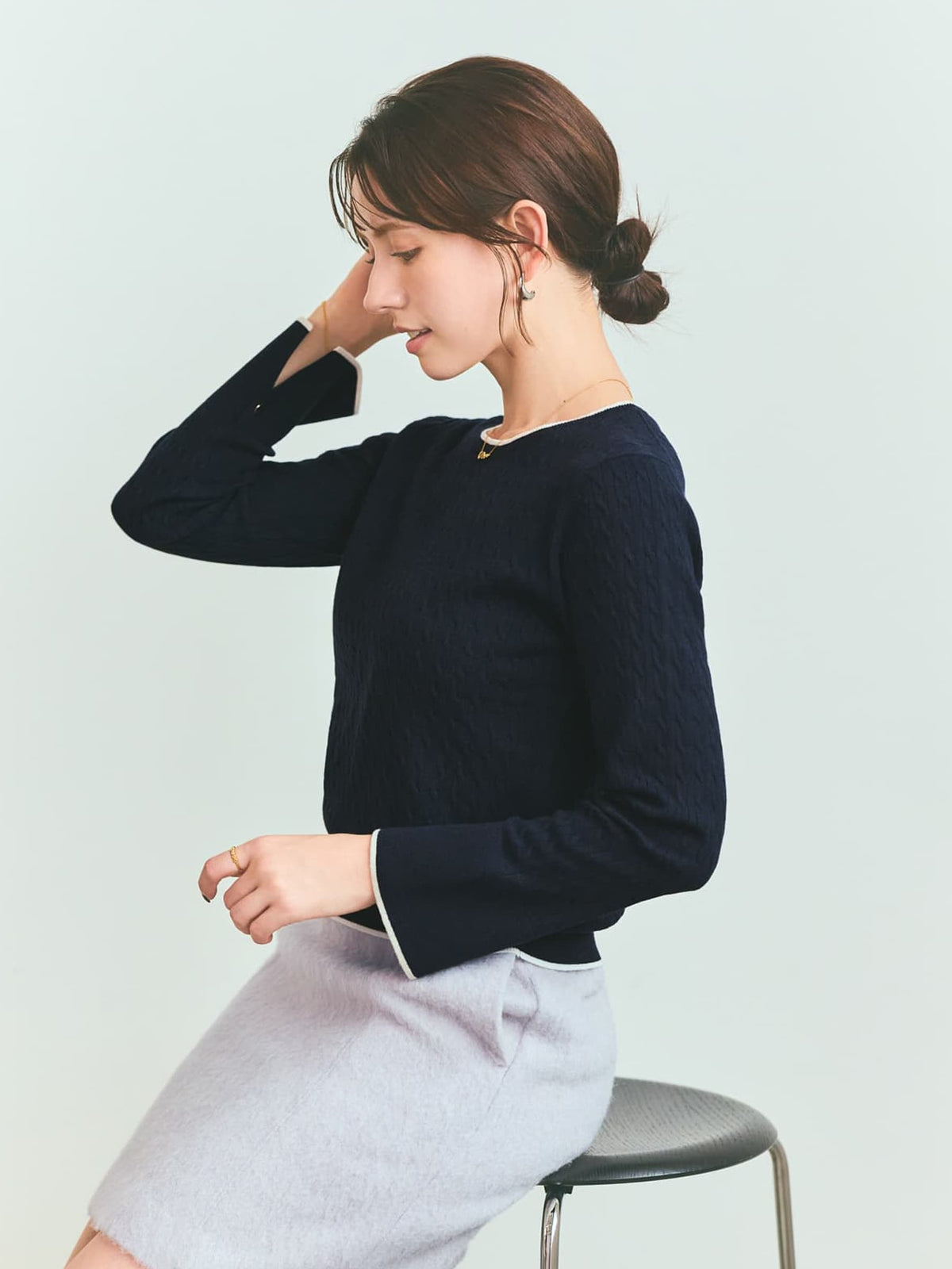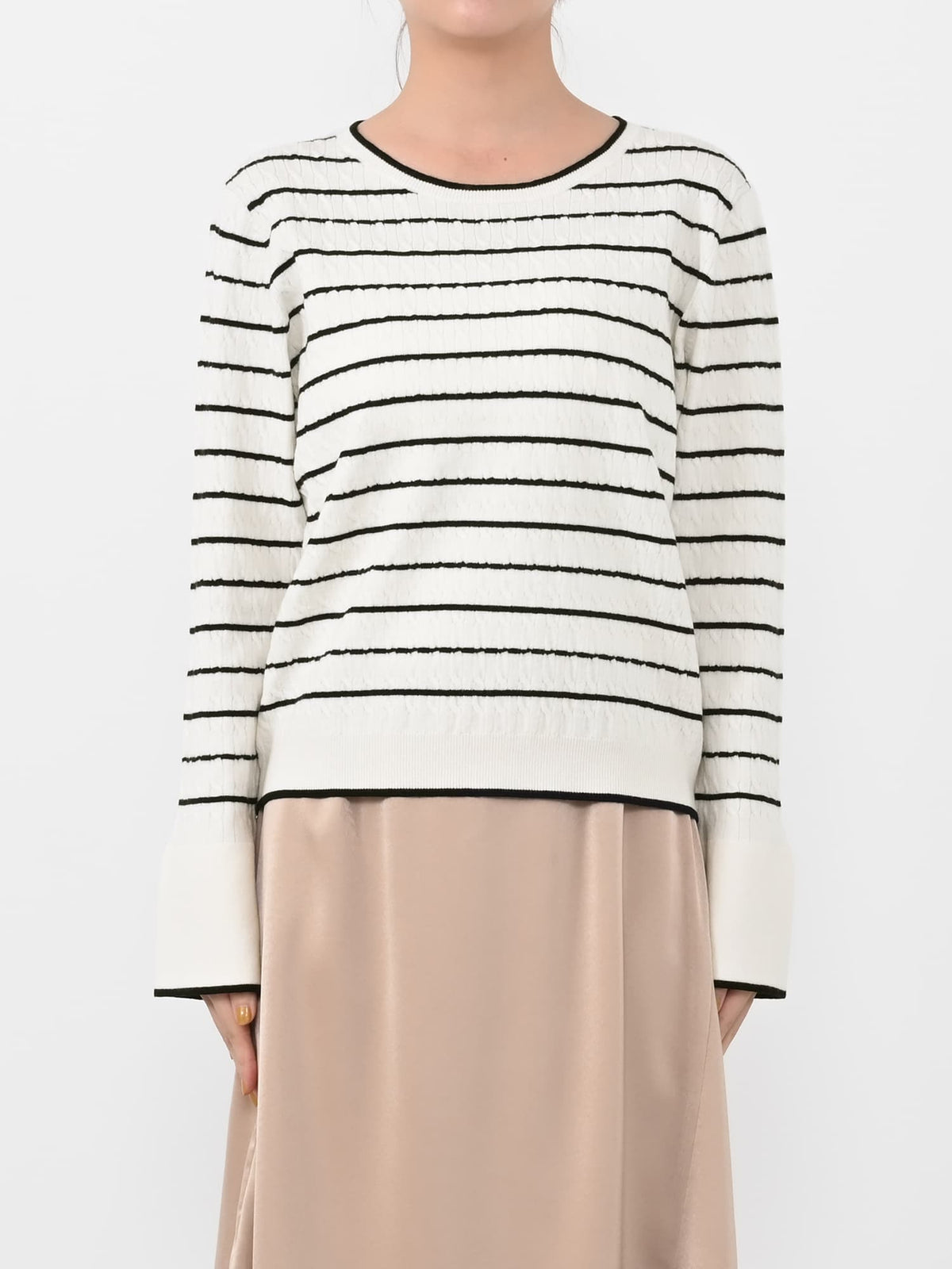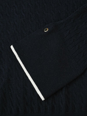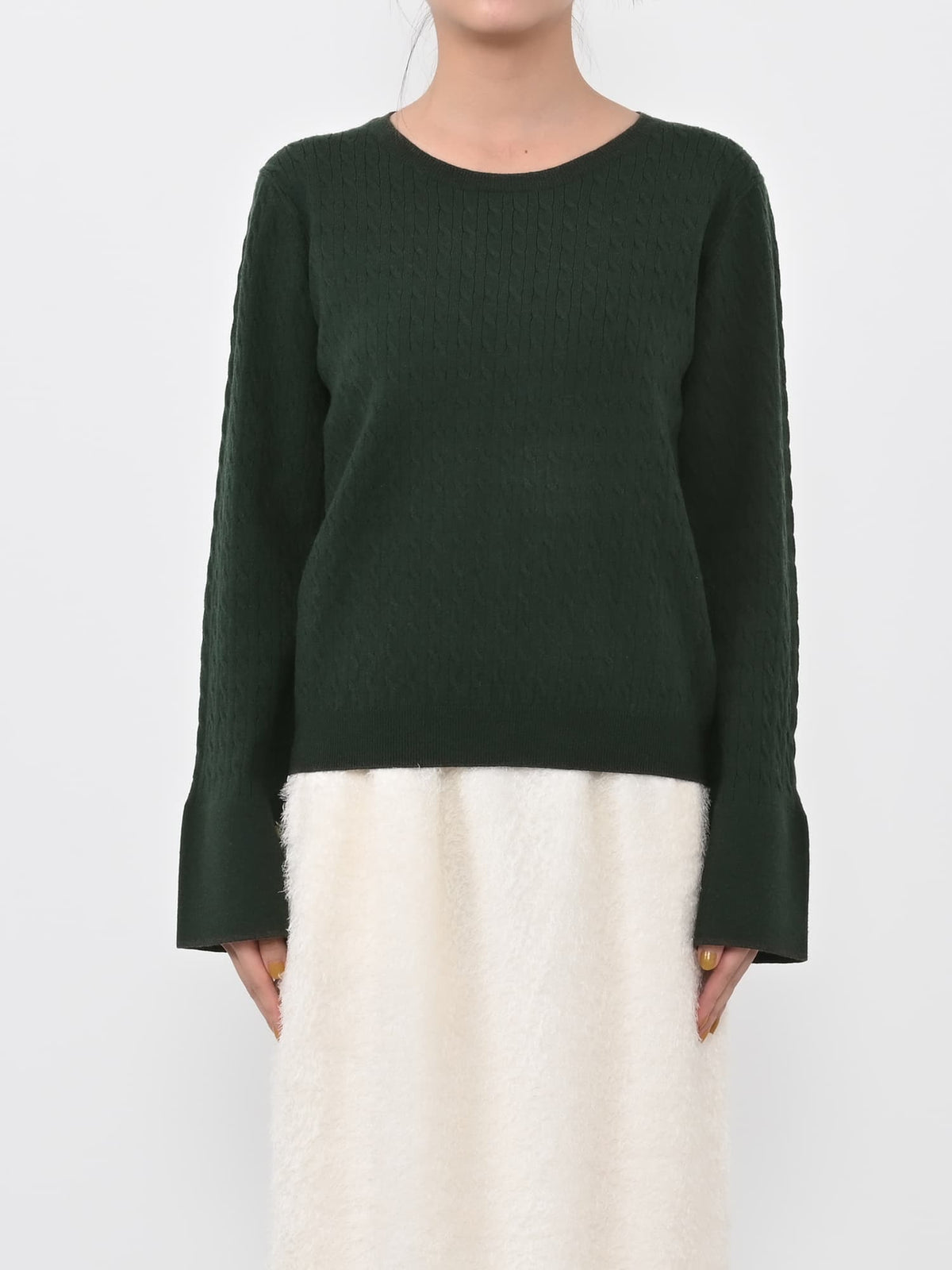 全体に施された細やかなミニケーブル編みが、上品な立体感を演出。