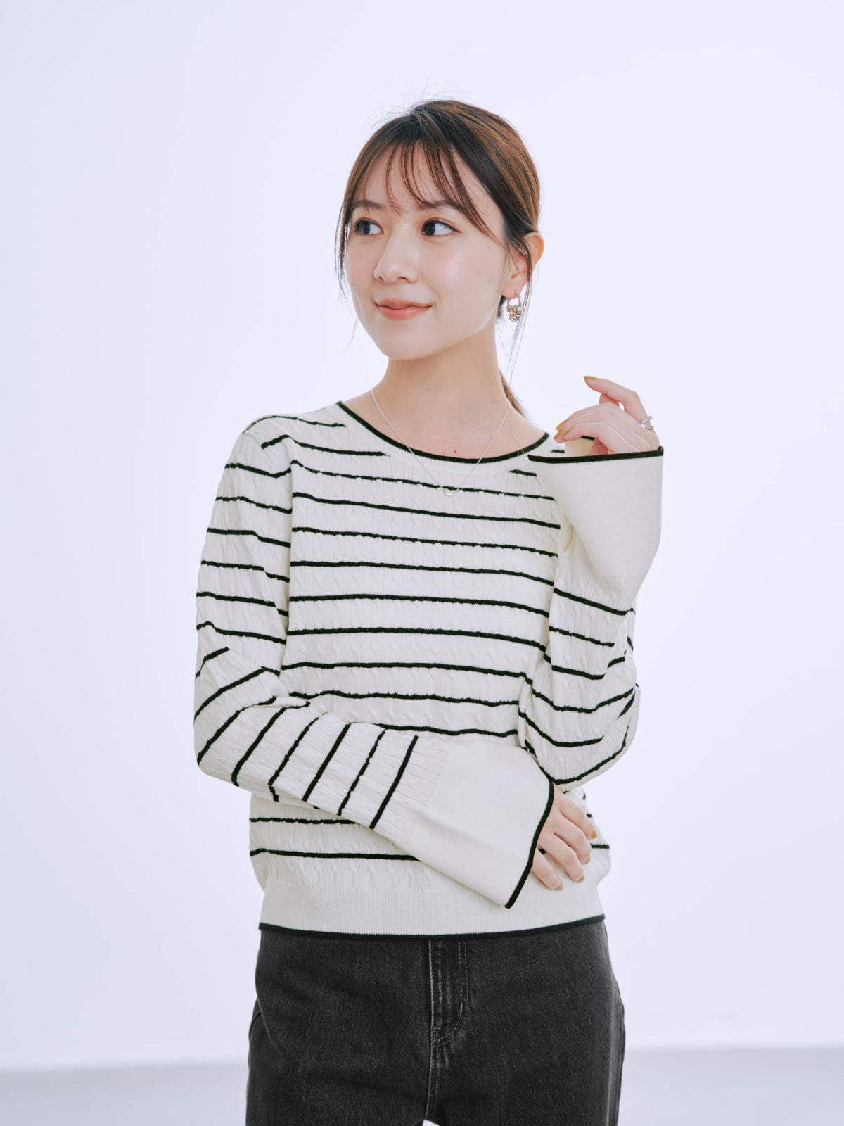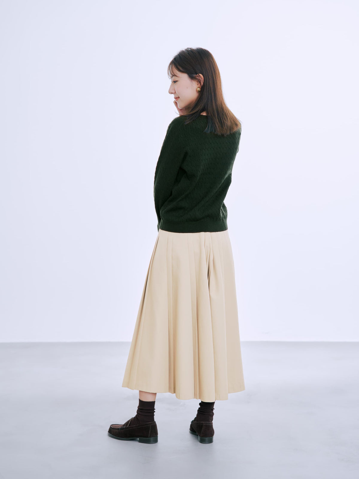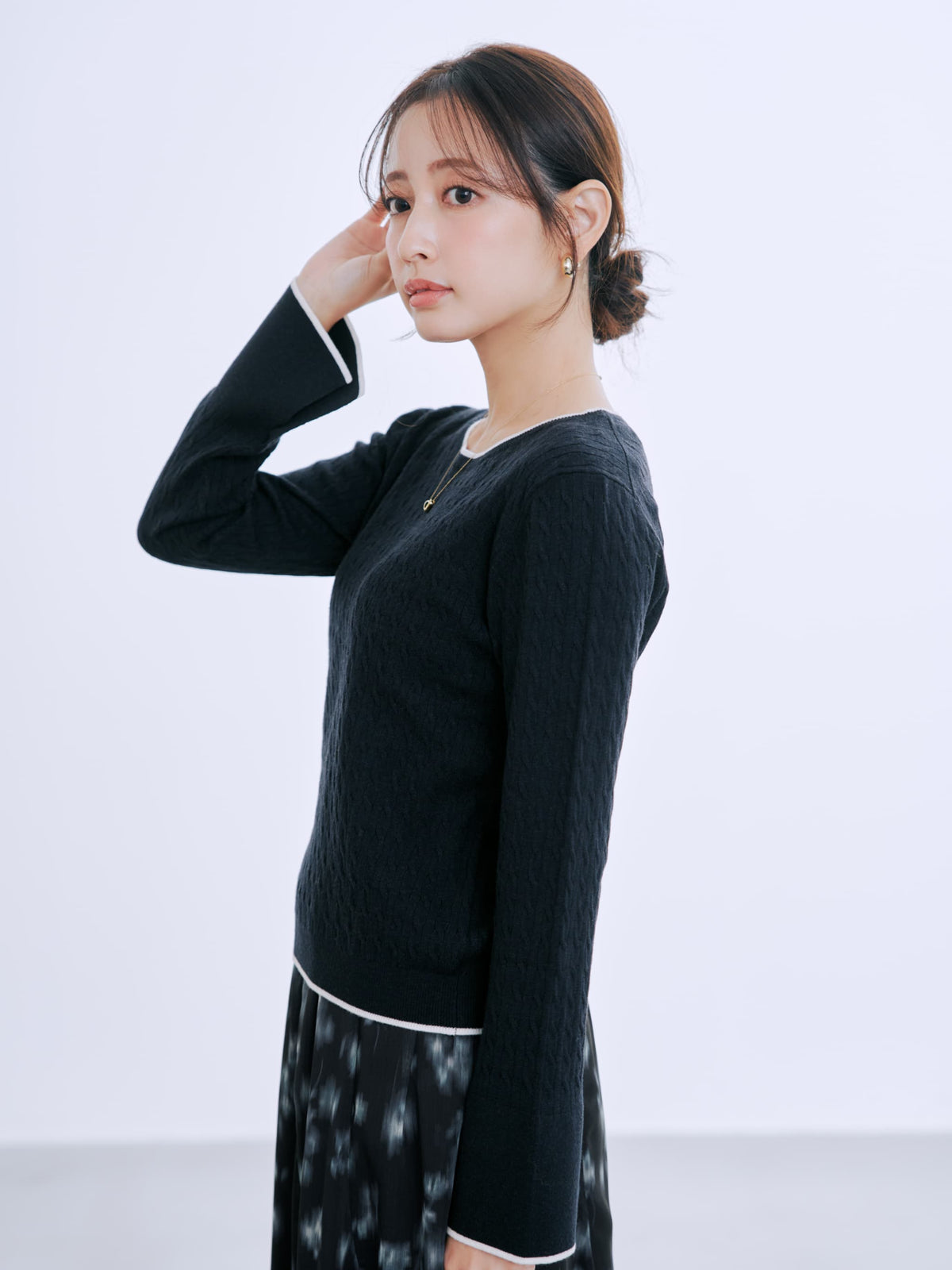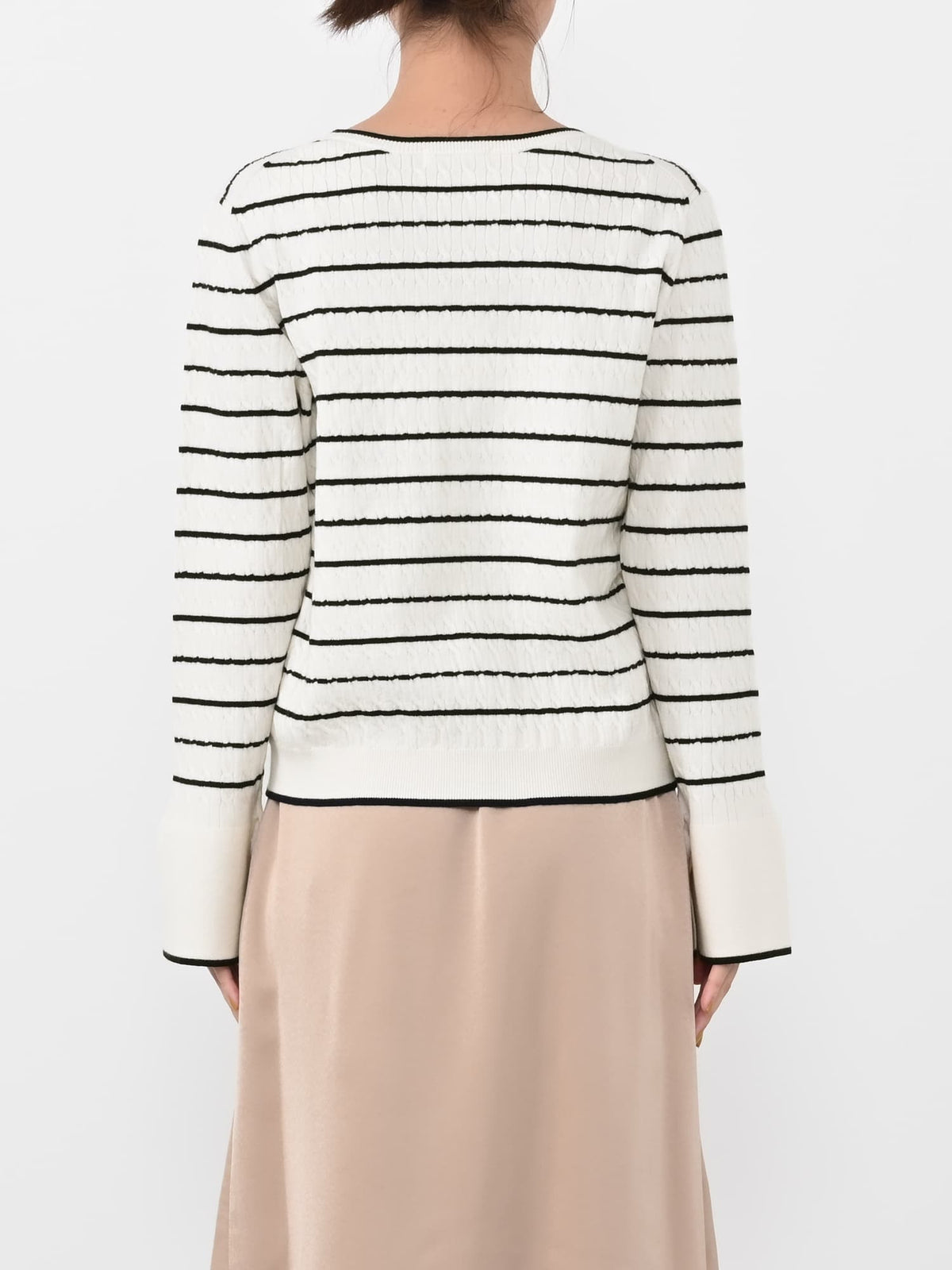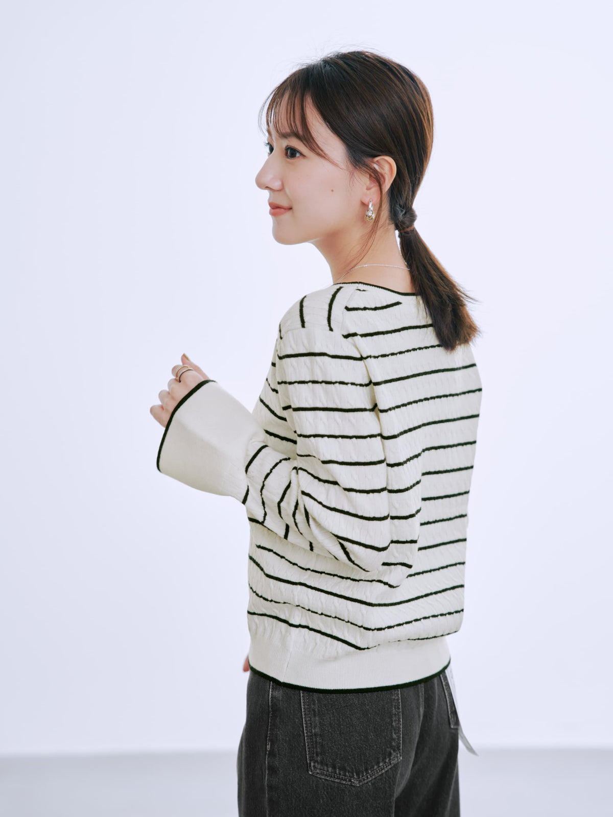 全体に施された細やかなミニケーブル編みが、上品な立体感を演出。