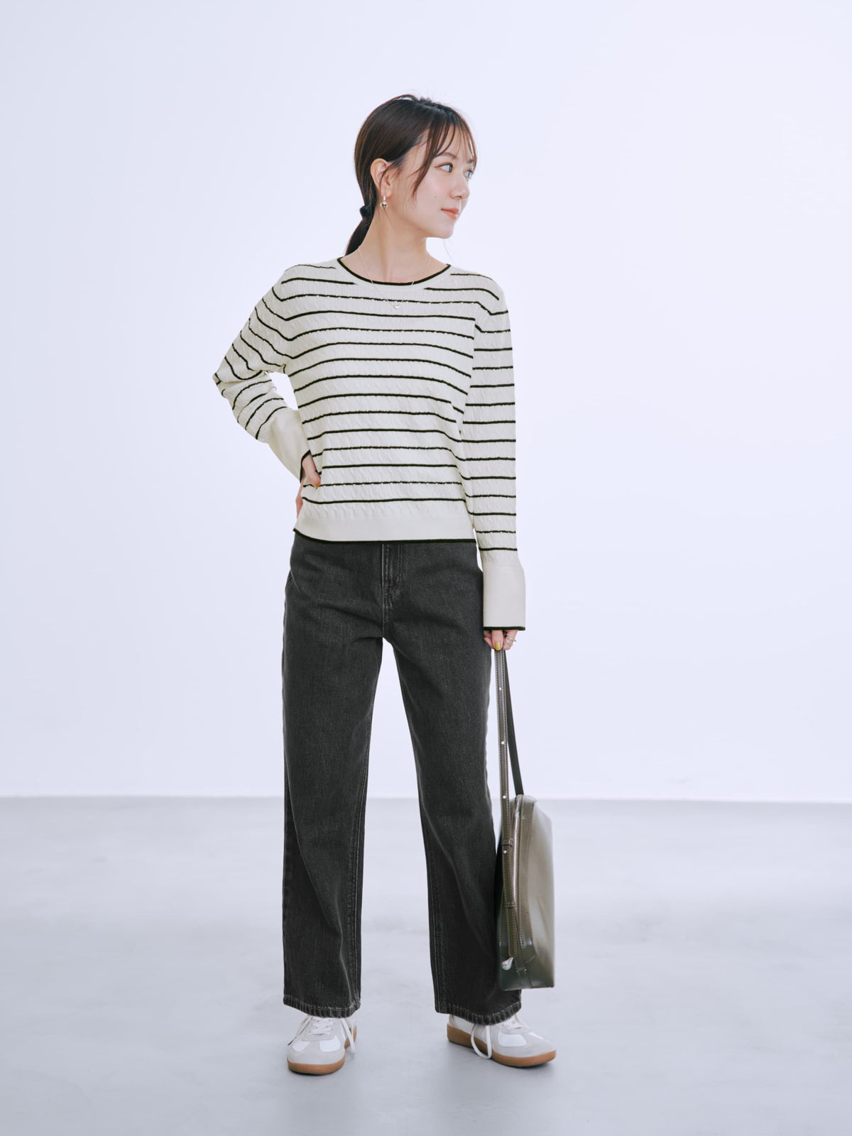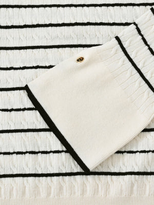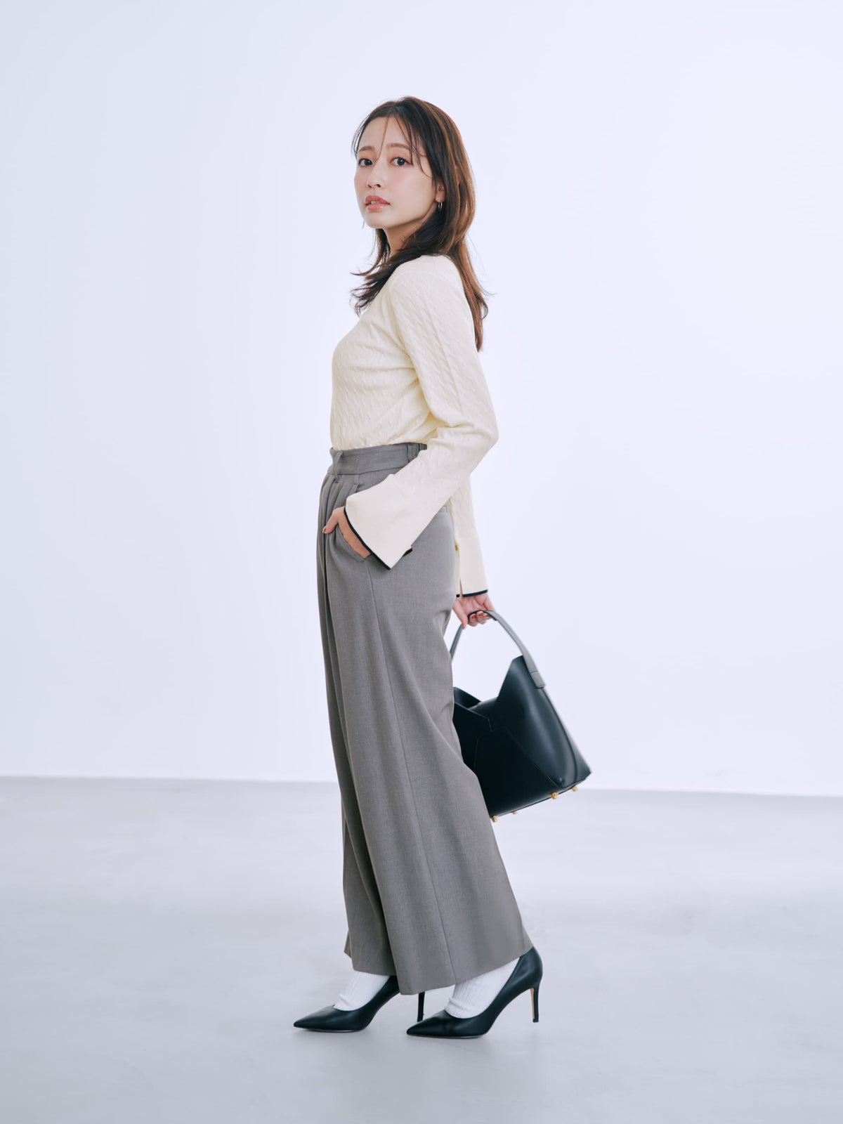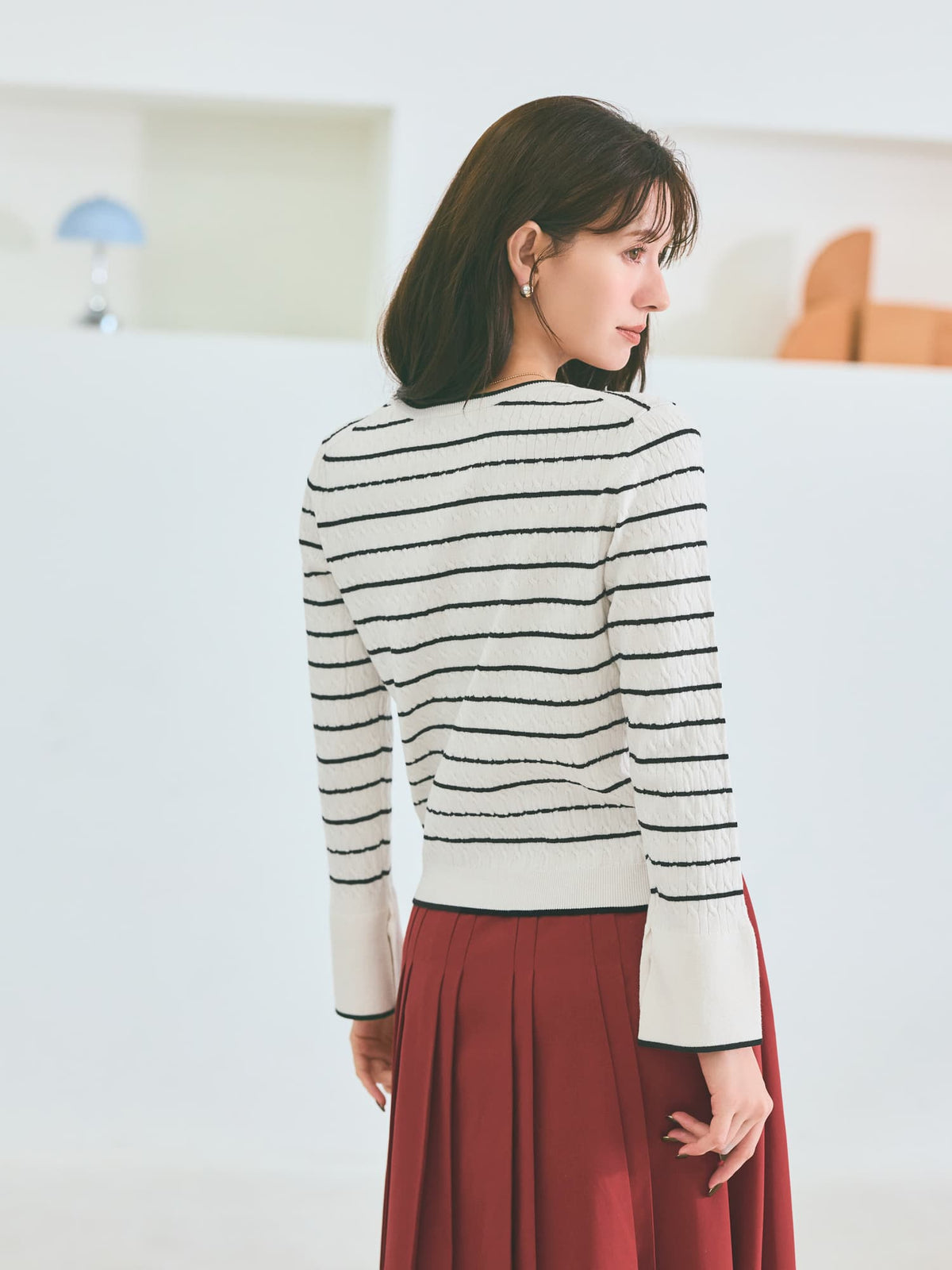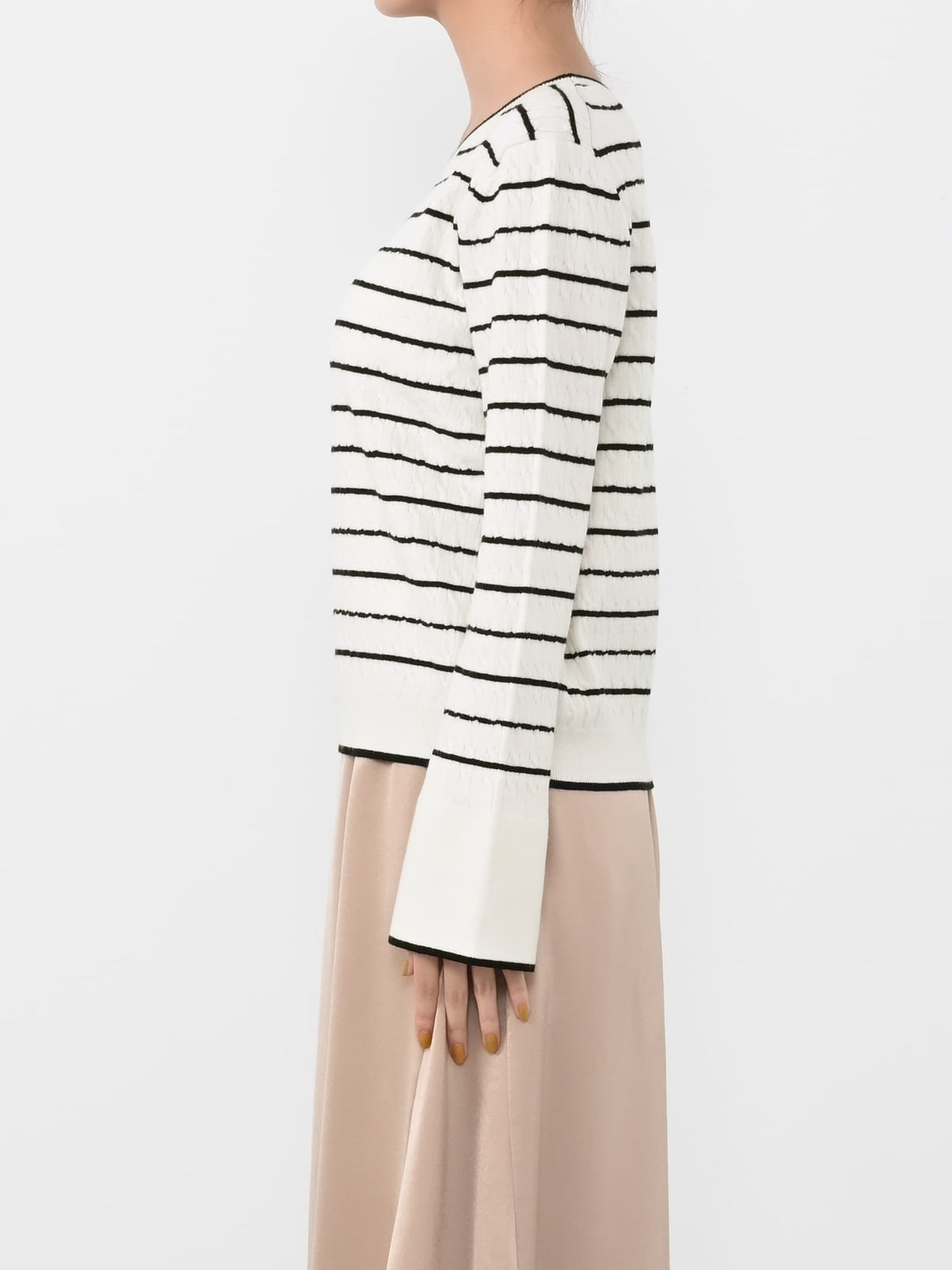 全体に施された細やかなミニケーブル編みが、上品な立体感を演出。