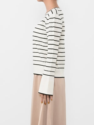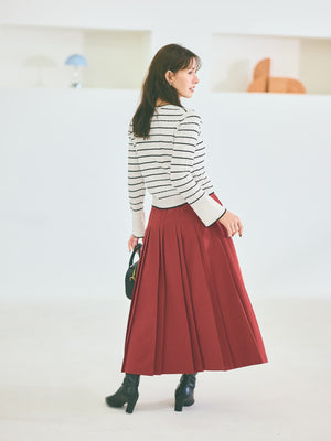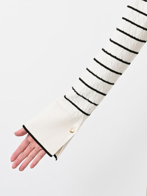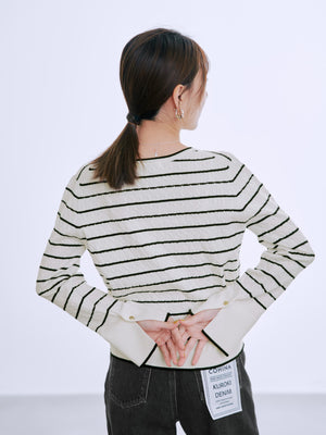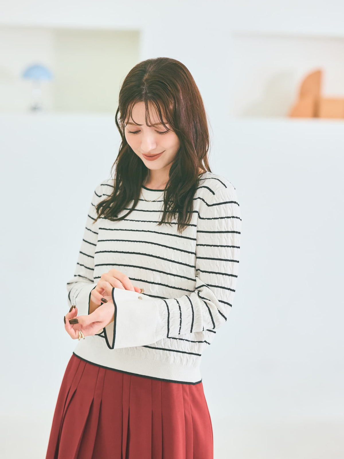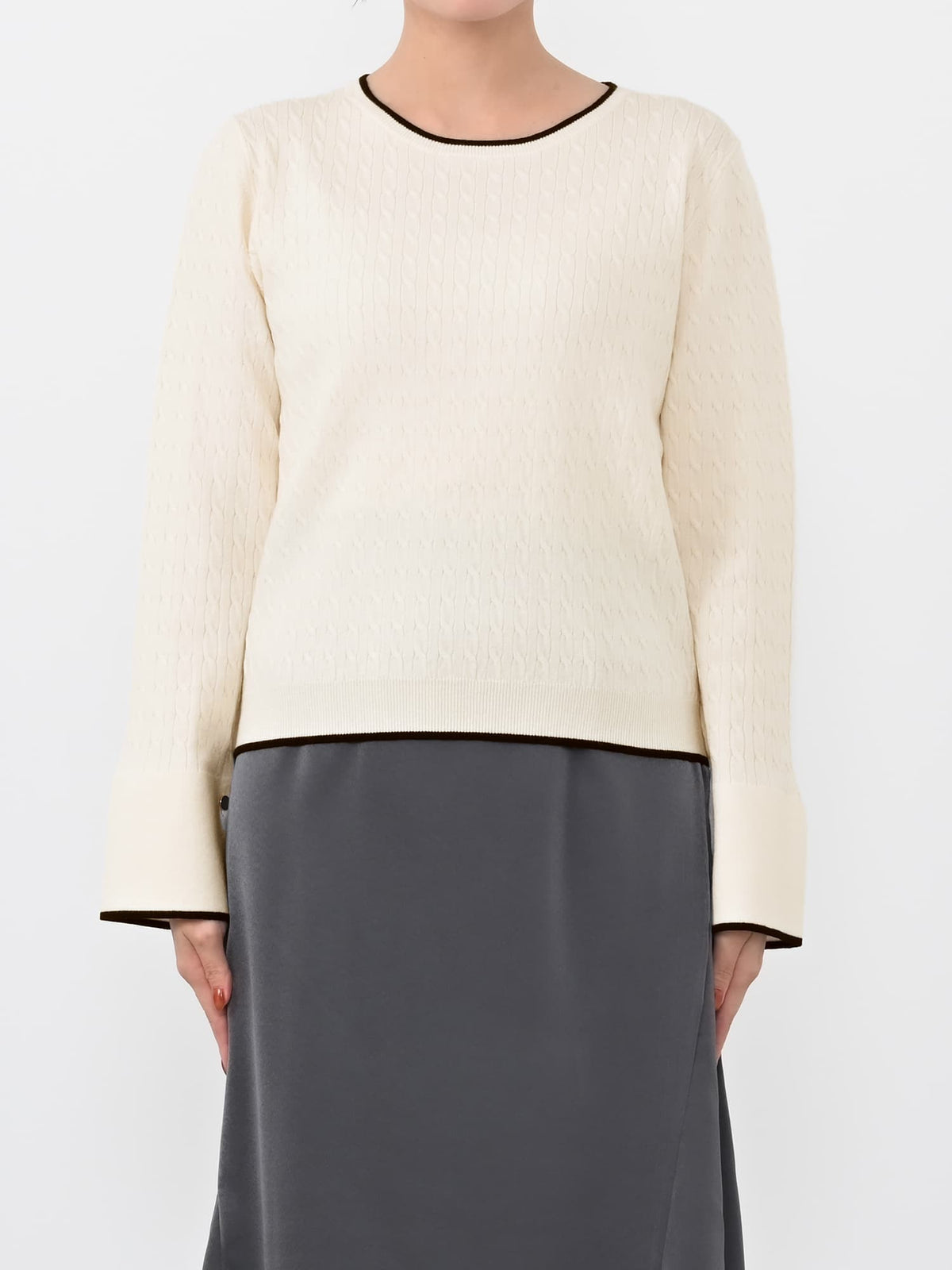 ネックや袖口に配した配色トリミングがポイントになり、シンプルながらも着映えする1枚です。袖口のスリットデザインが、手元を華奢に見せつつ抜け感をプラス。