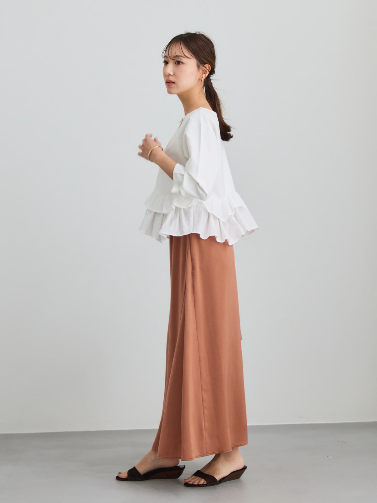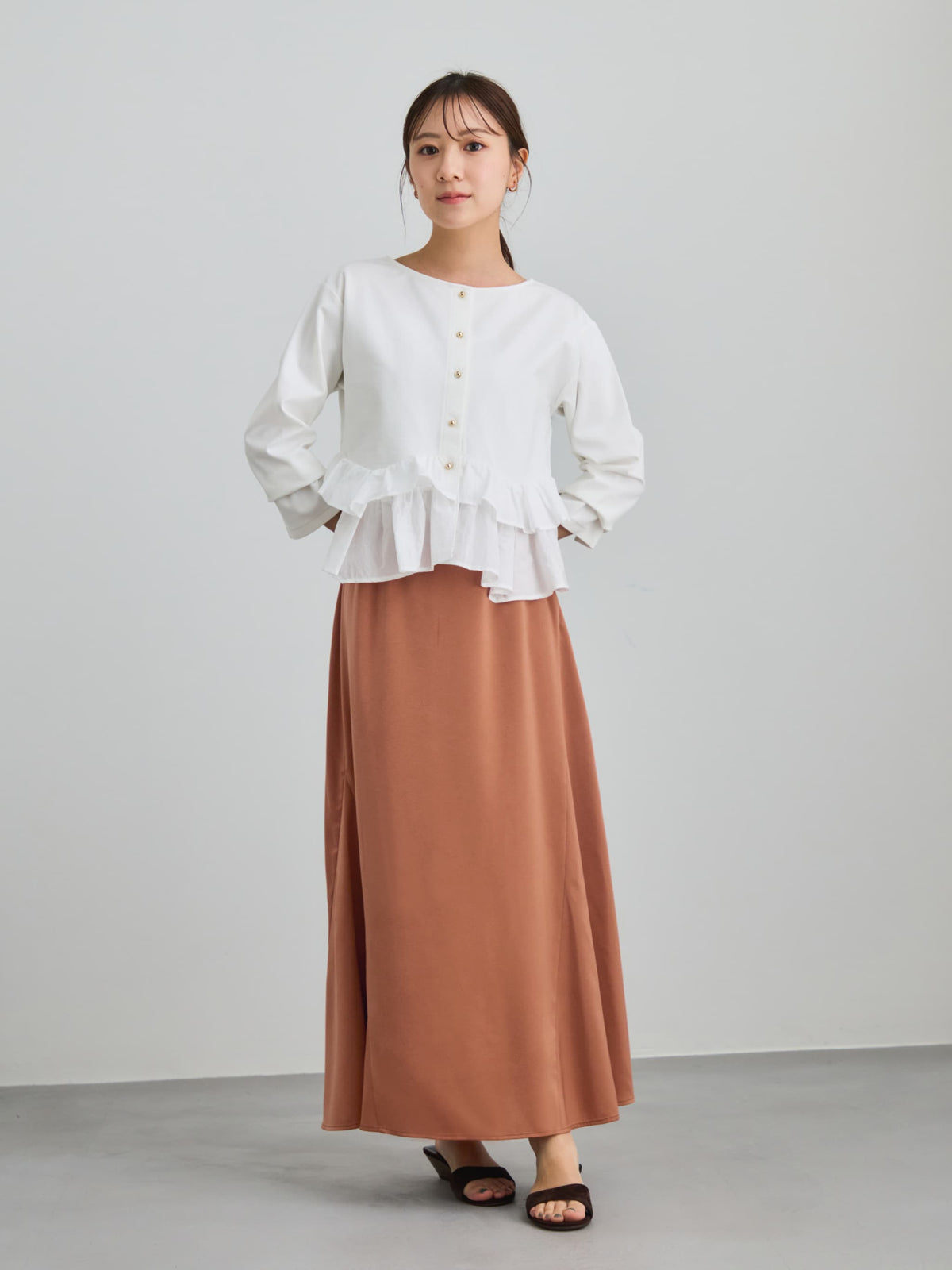 綺麗めシャツやブラウスを合わせたきちんと感のあるスタイルから、カジュアルなニットやスウェットとのフェミニンカジュアルなスタイルまで、オンオフ問わずに着回していただけます。