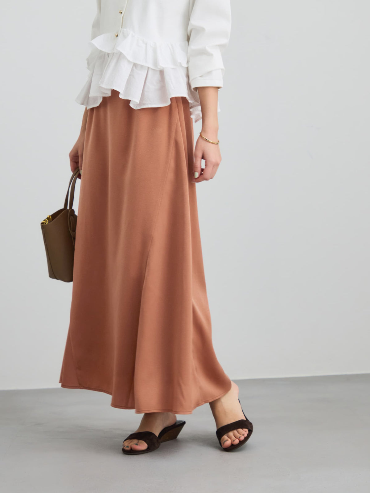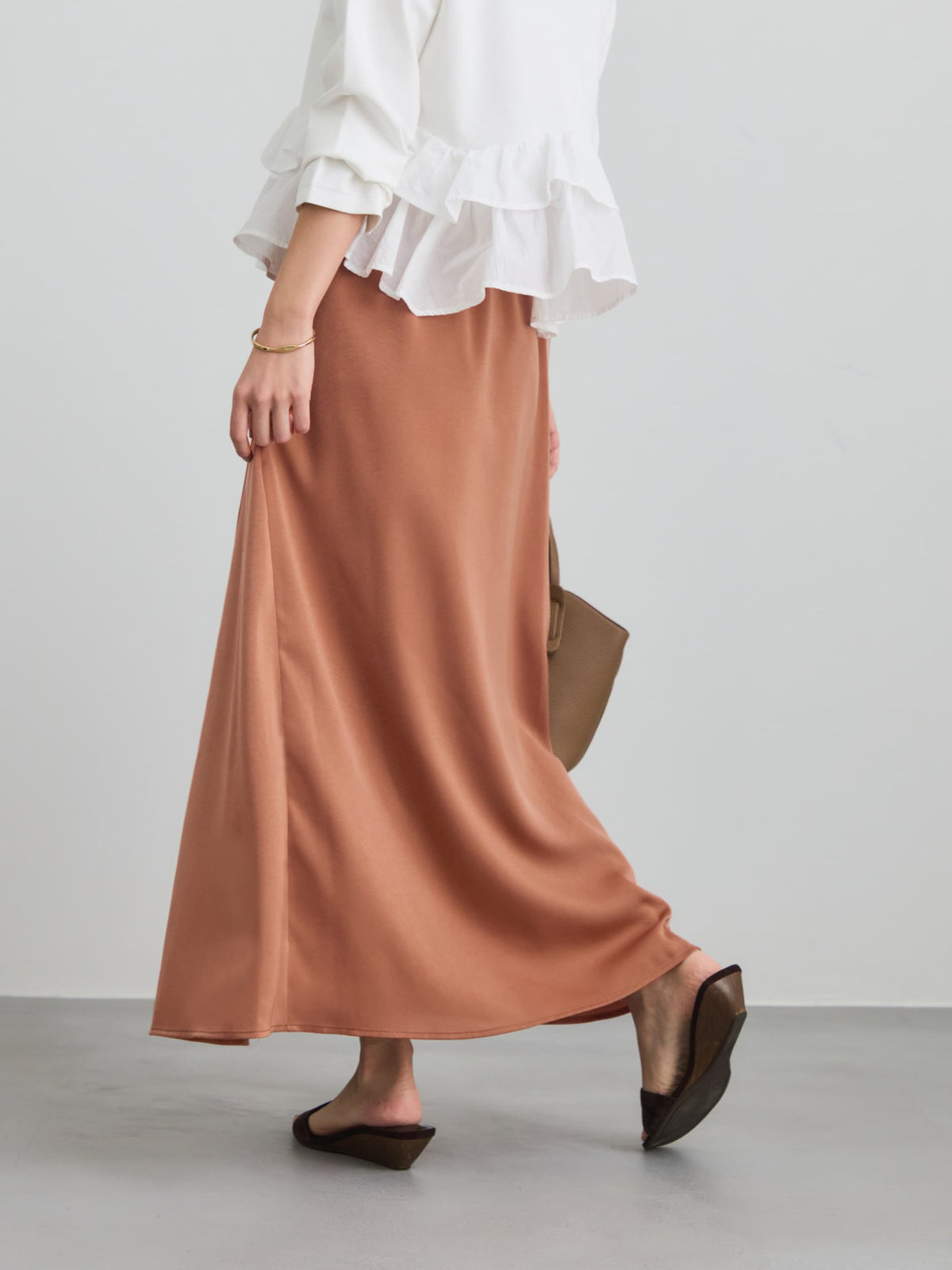落ち感のあるサテンで、1枚で着映えする万能スカート