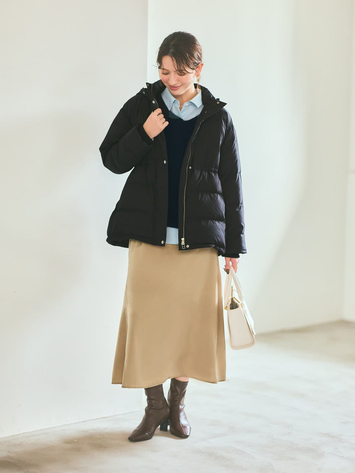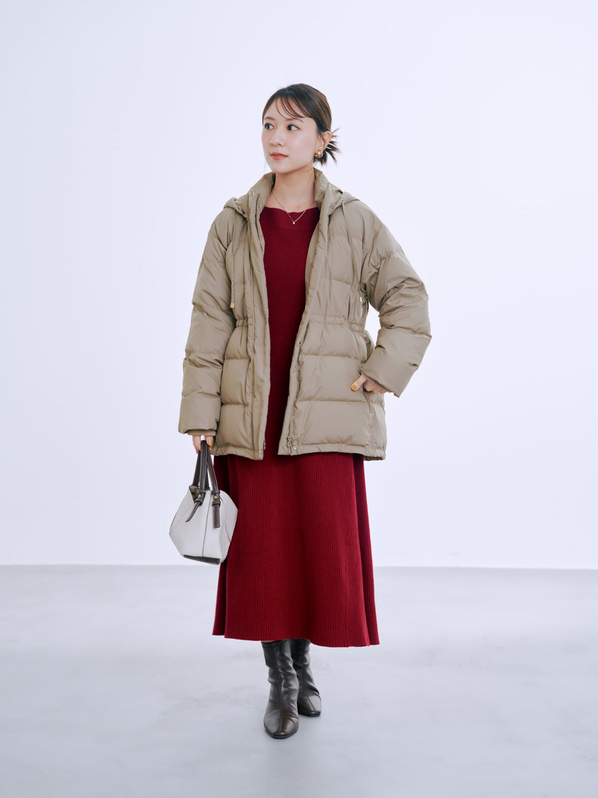 着てみると、軽くて包み込まれるような暖かさでした。適度なゆとりがありつつ、自分の身体にピッタリ。ダウンはどうしても着られてる感があり、子供の送迎やスポーツ観戦など、防寒のための上着という感じでしたが、こちらならきれいめにもカジュアルにも羽織れそう。この冬、手放せない1着になりそうです。