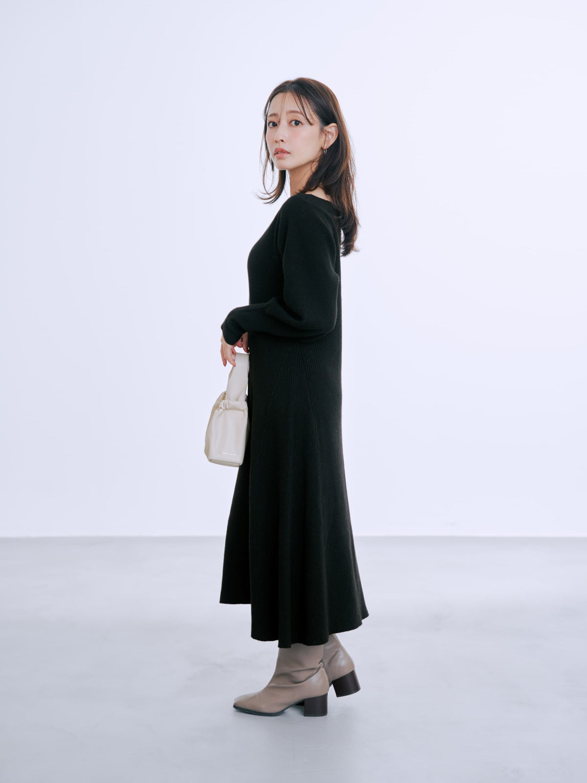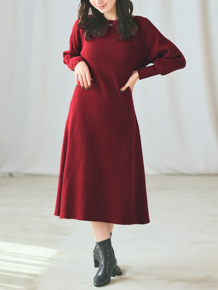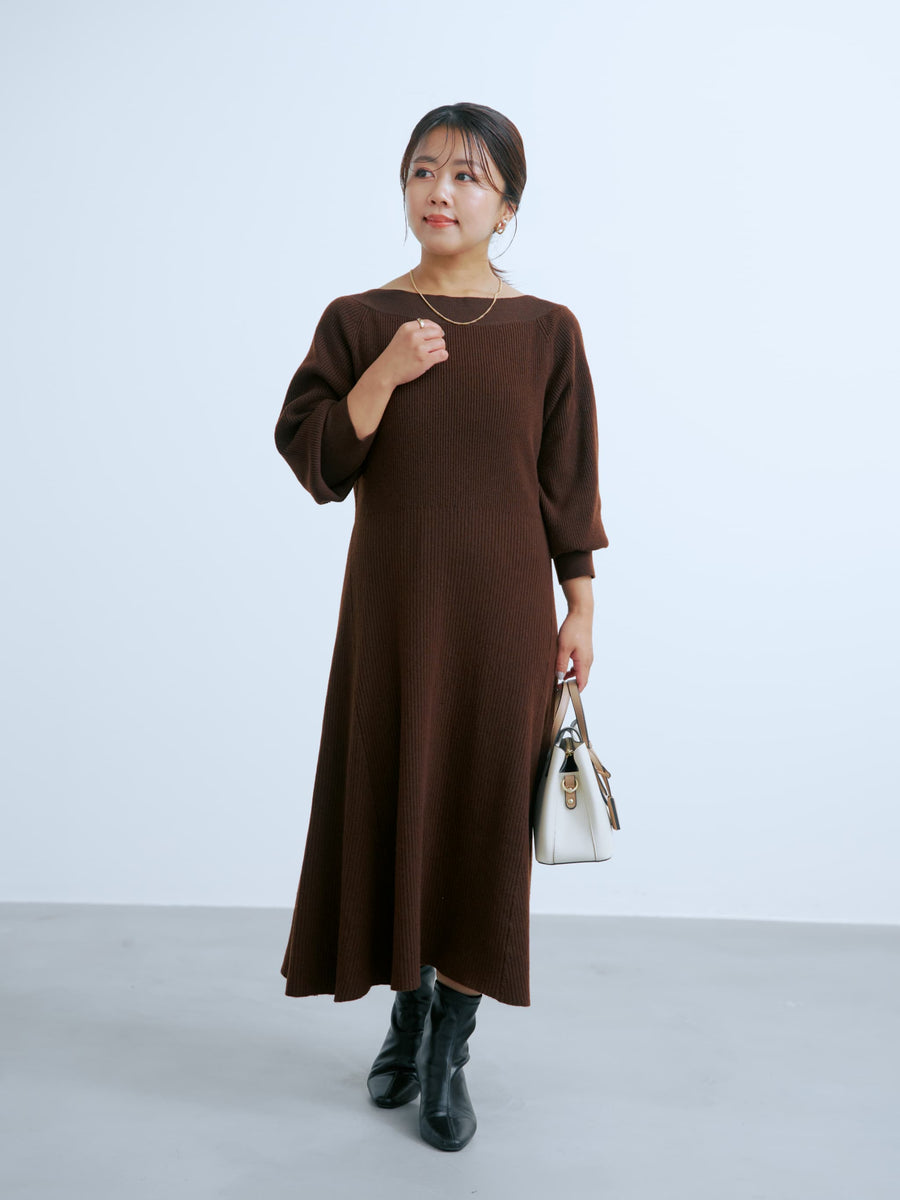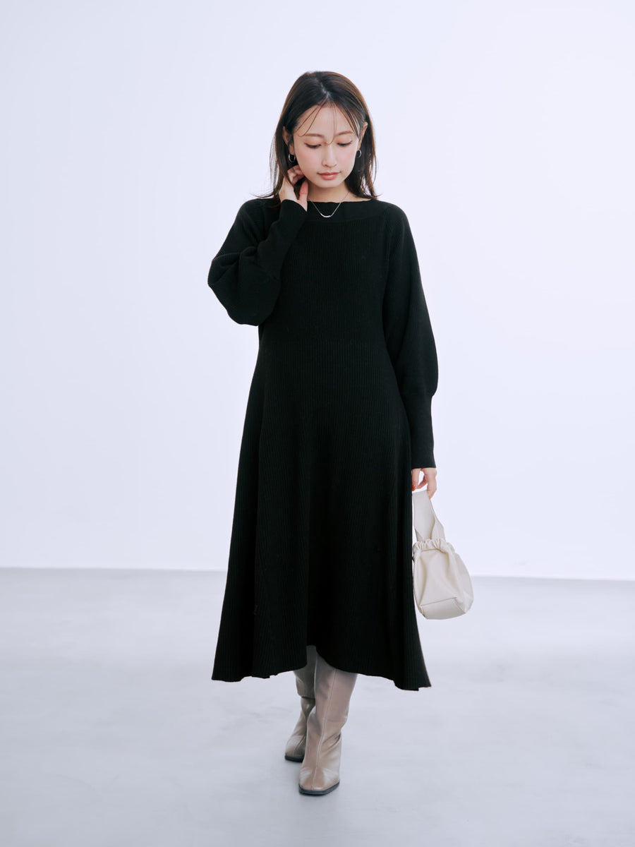 身体のラインを華奢に見せてくれるウエストのリブ切り替えと裾にかけて広がるフレアがレディライクなシルエットを演出。抜け感のあるボートネックとほんのりボリュームを持たせた袖もポイント。