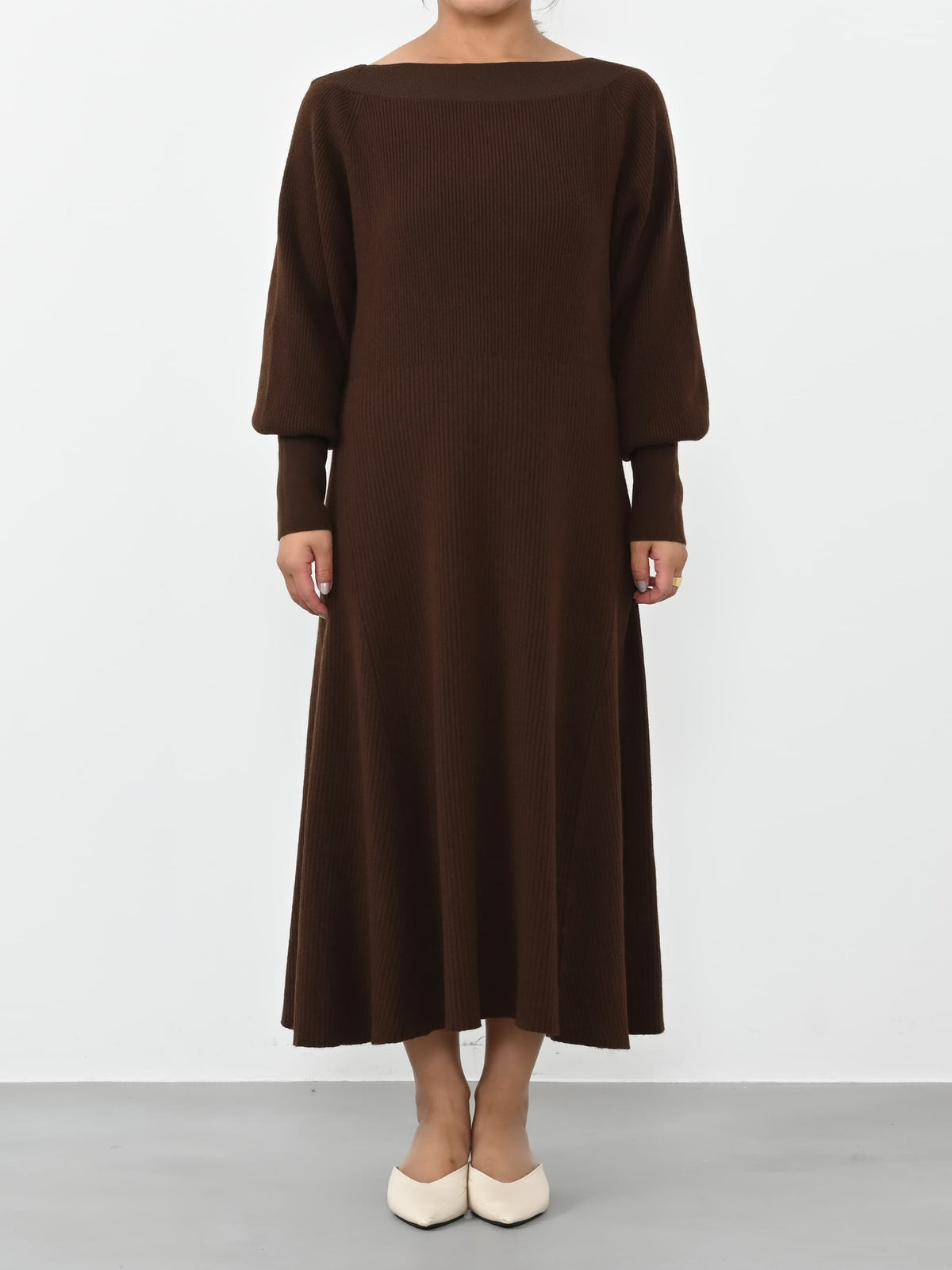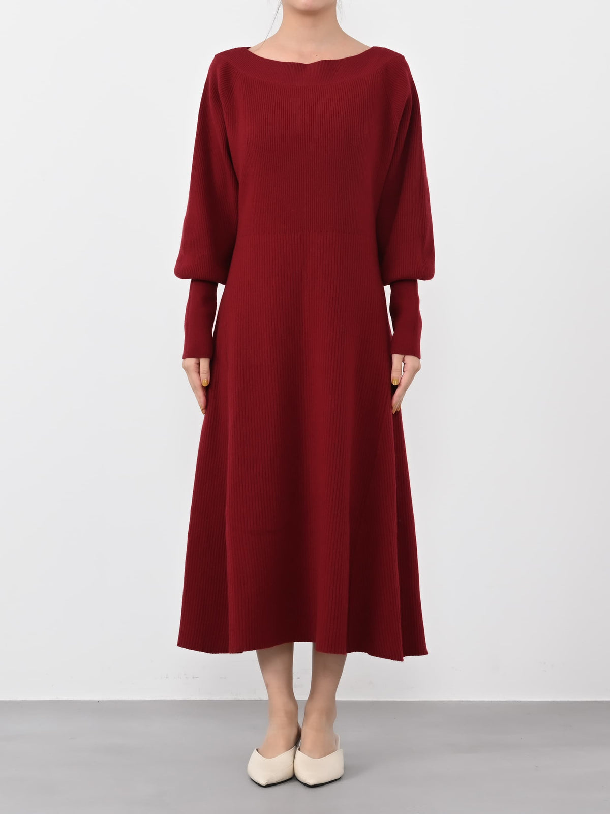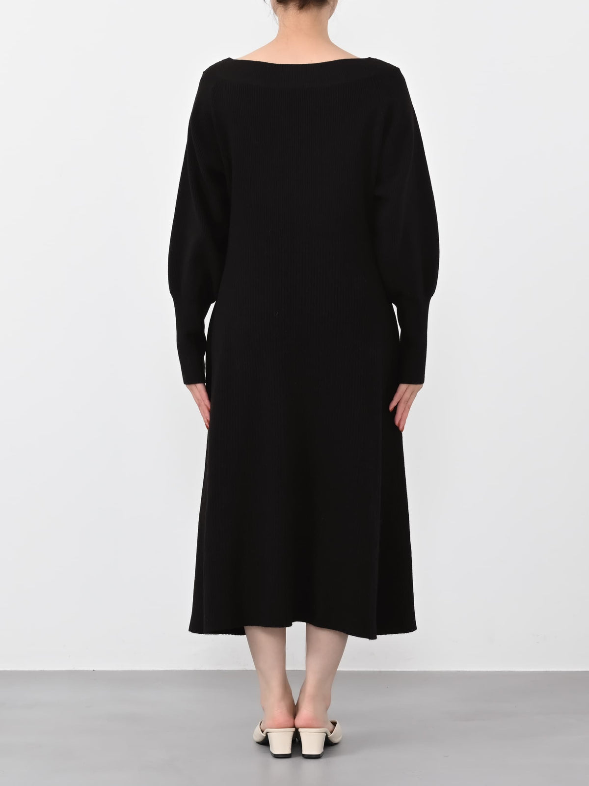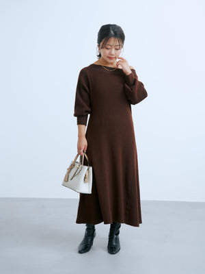身体のラインを華奢に見せてくれるウエストのリブ切り替えと裾にかけて広がるフレアがレディライクなシルエットを演出。抜け感のあるボートネックとほんのりボリュームを持たせた袖もポイント。