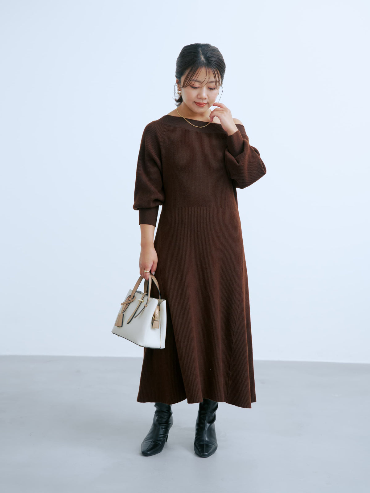 女性らしいボートネックデザインは、肩を落としてオフショルやワンショルにもアレンジ出来るので、簡単にトレンド感のある着こなしが叶います◎足元は、ブーツ合わせがおすすめ。