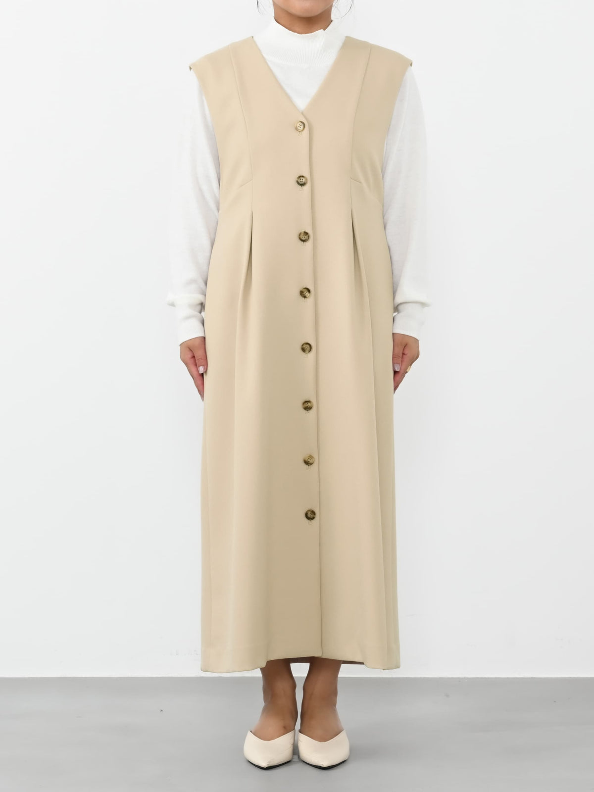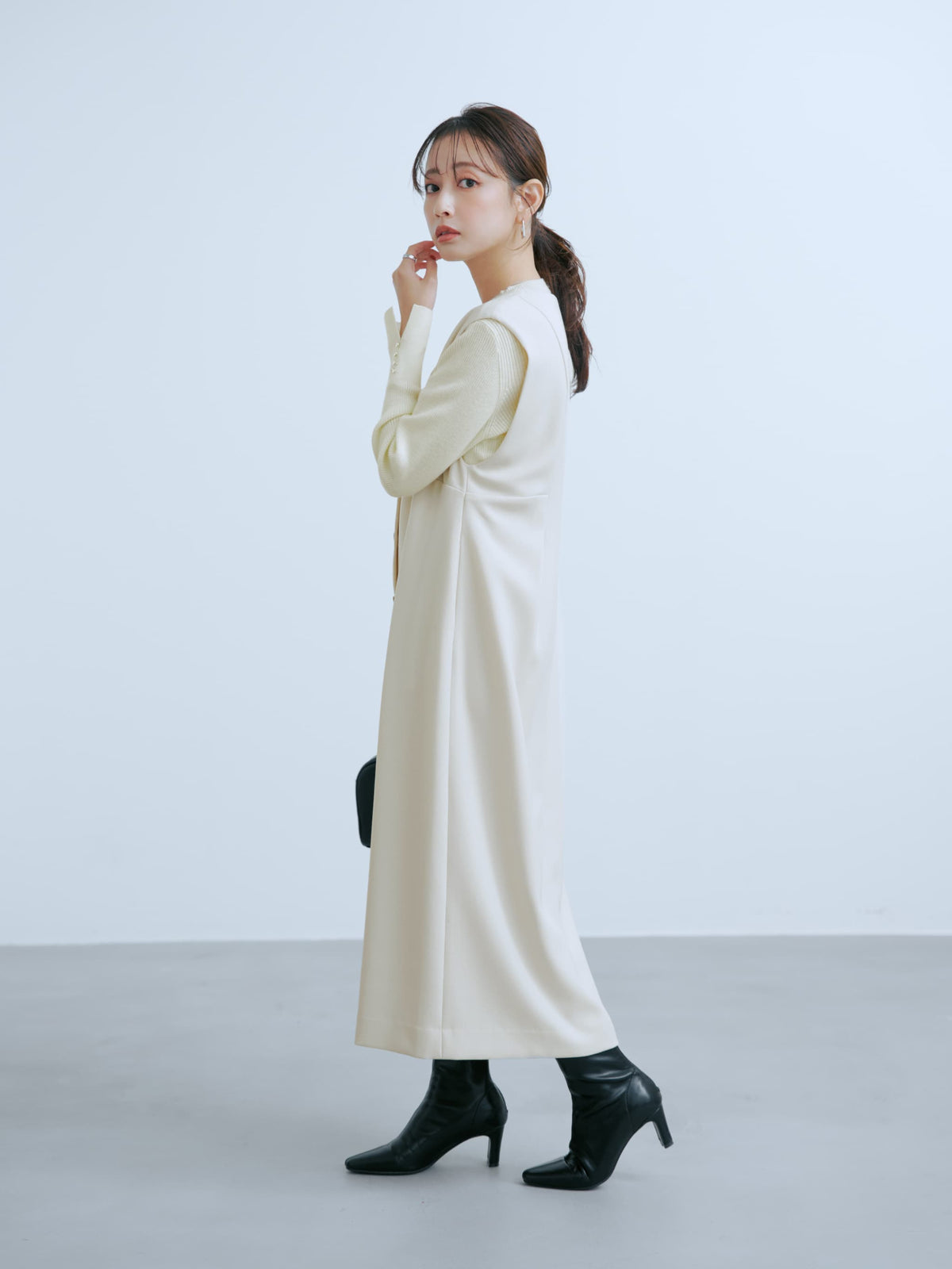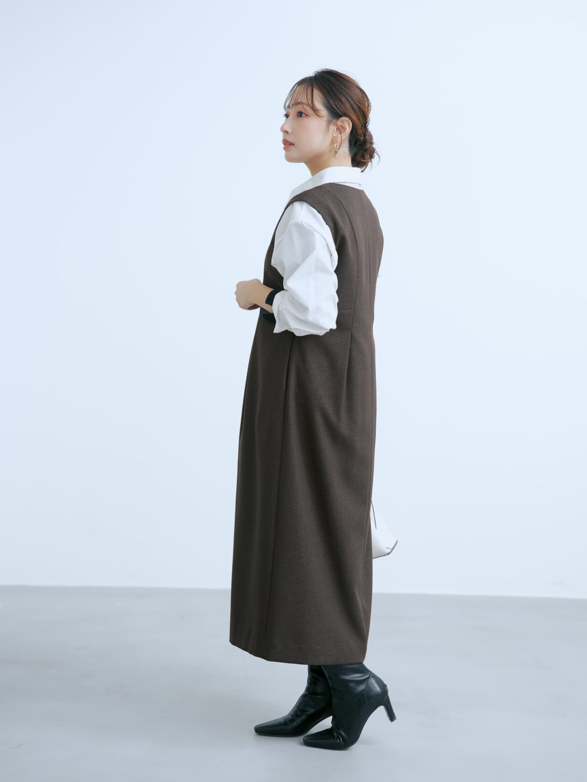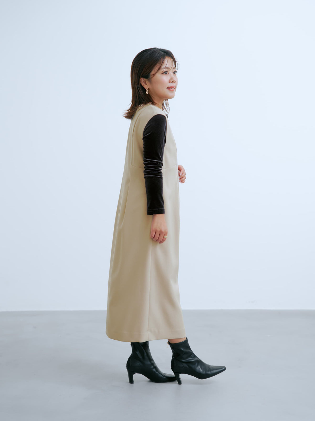 フロントに並んだボタンと深めのVネックが縦ラインを強調し、すっきり見えを叶えるジャンパースカート。