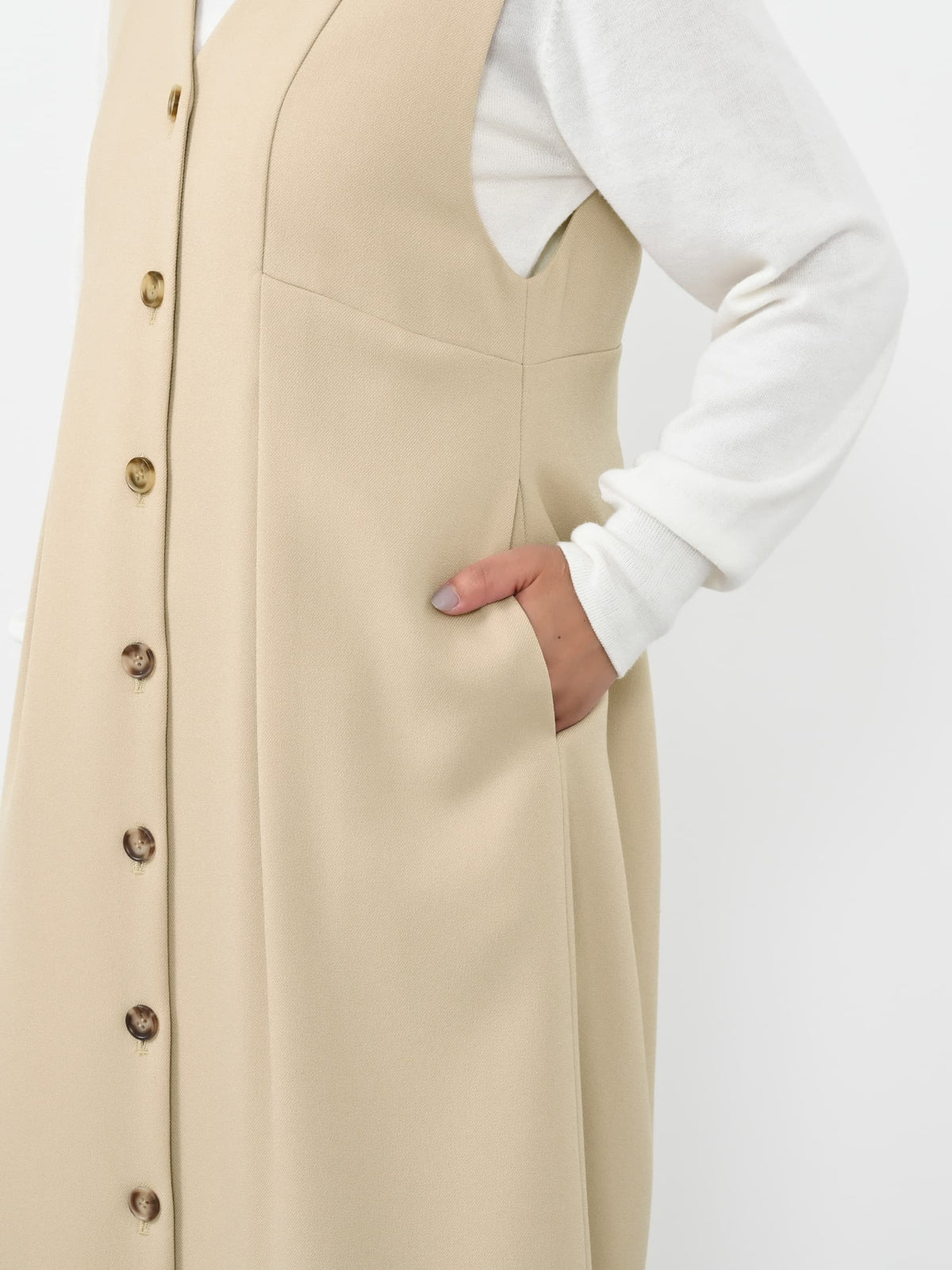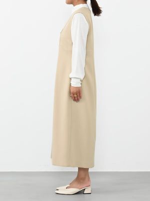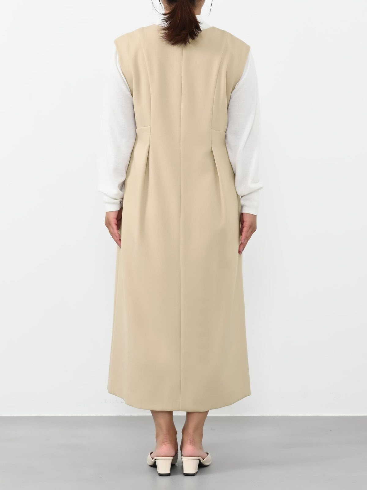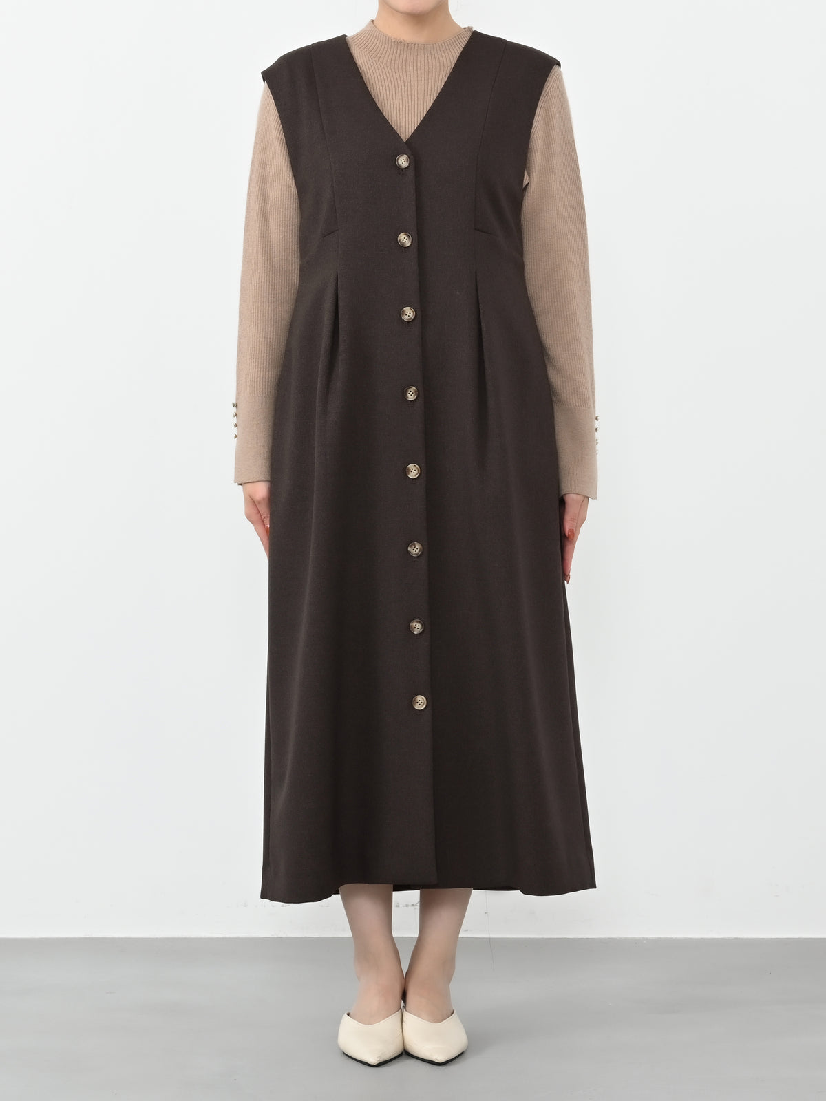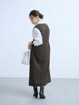 フロントに並んだボタンと深めのVネックが縦ラインを強調し、すっきり見えを叶えるジャンパースカート。