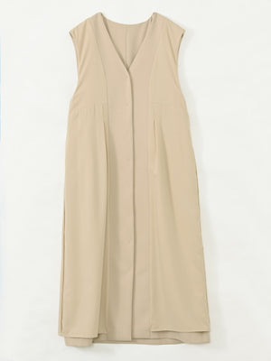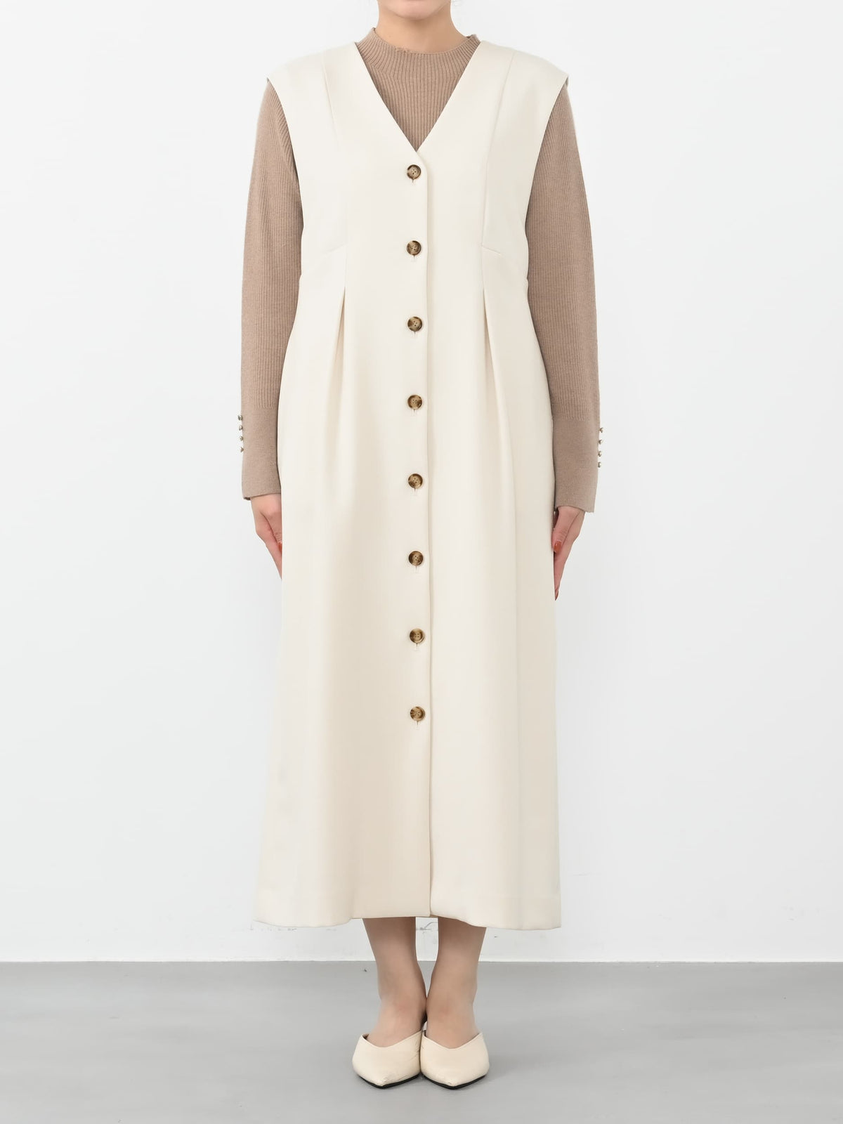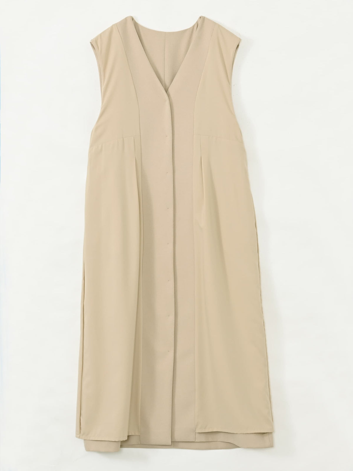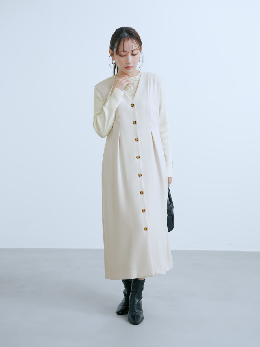 フロントボタンとVネックが縦のラインを強調し、すっきりとしたシルエットのワンピース。