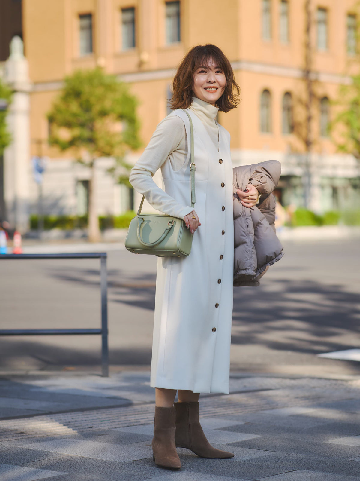 体型をさりげなくカバーしながら、女性らしい上品な印象に見せてくれ、インナー次第で季節を問わず着回せるのもポイントです◎